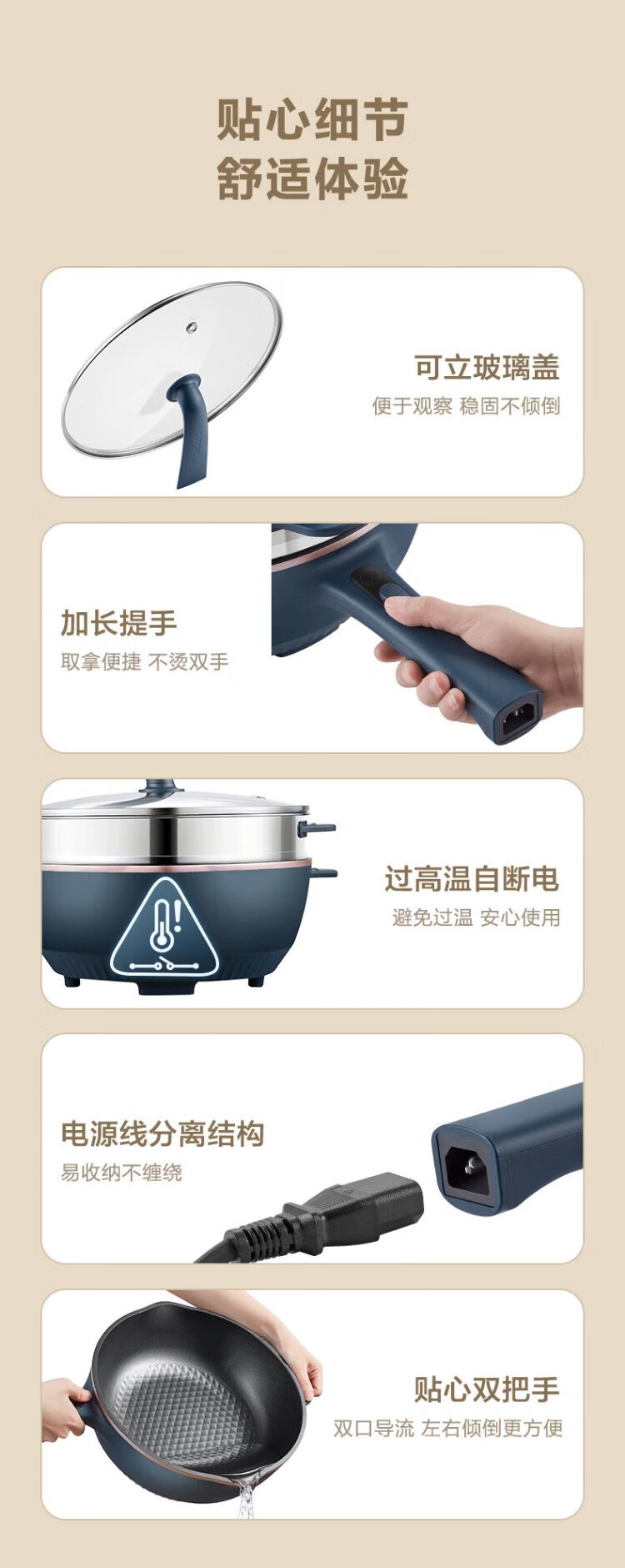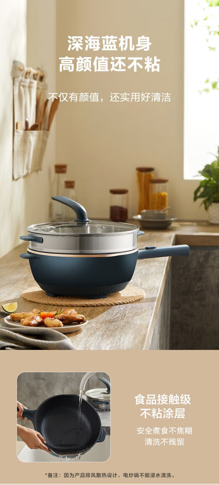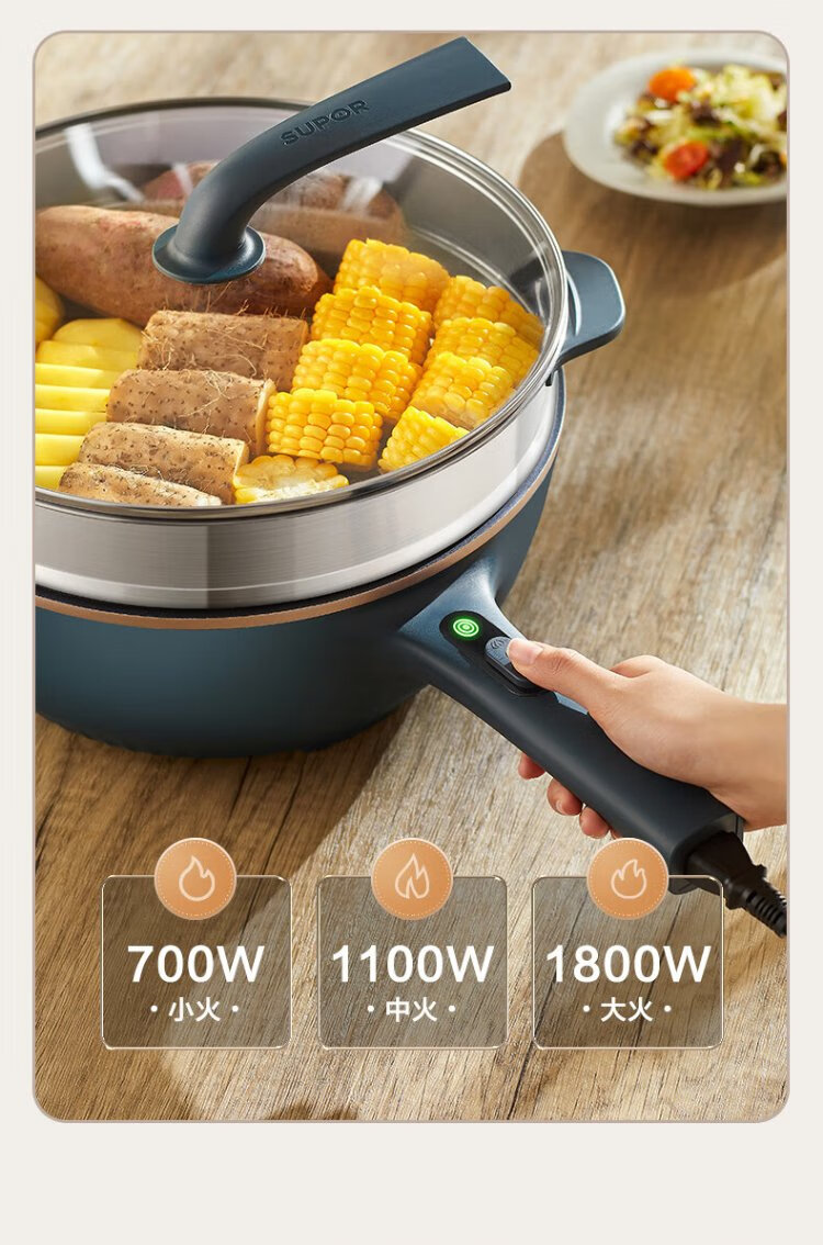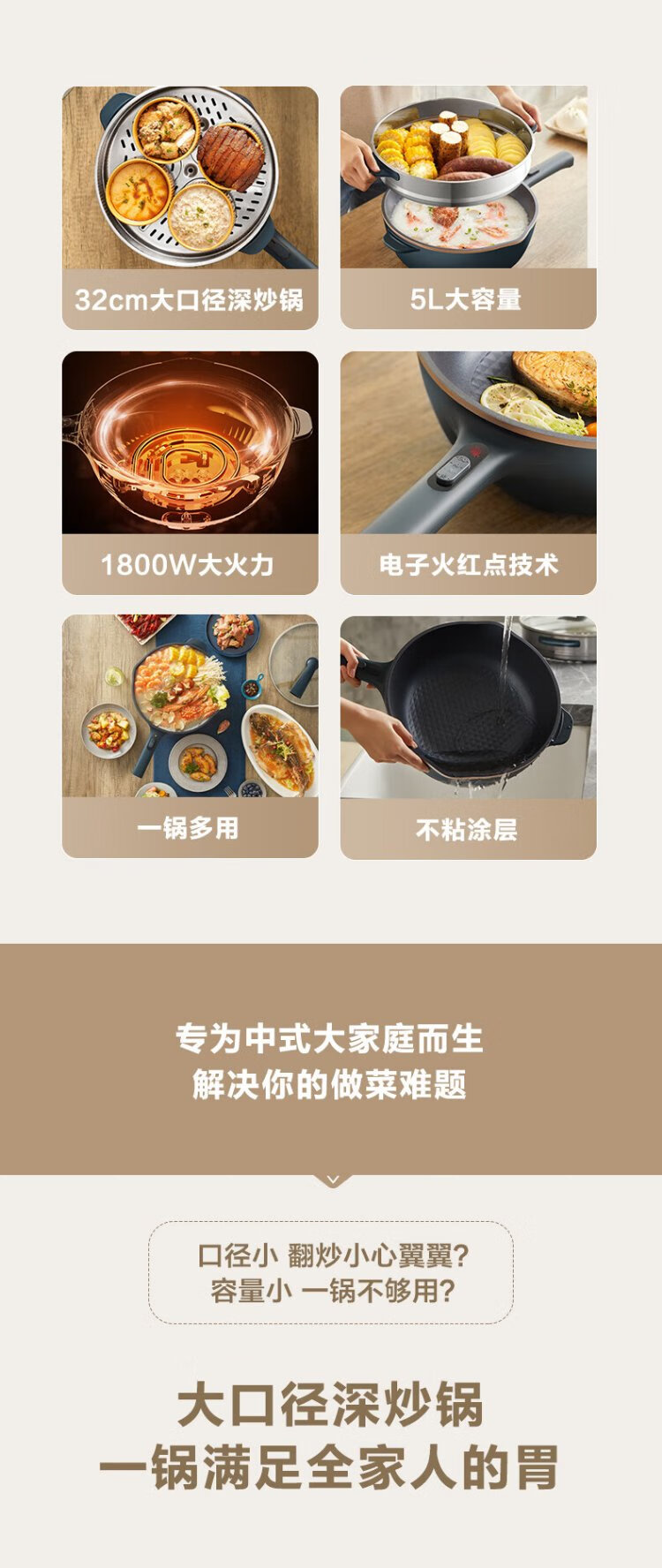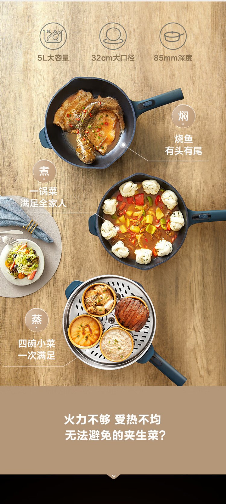 SUPOR electric wok, electric hot pot, electric cooking pot, electric steamer, household multi-function, steaming and cooking, smart red dot, non-stick multi-purpose pot CJ32A825-220 with steamer