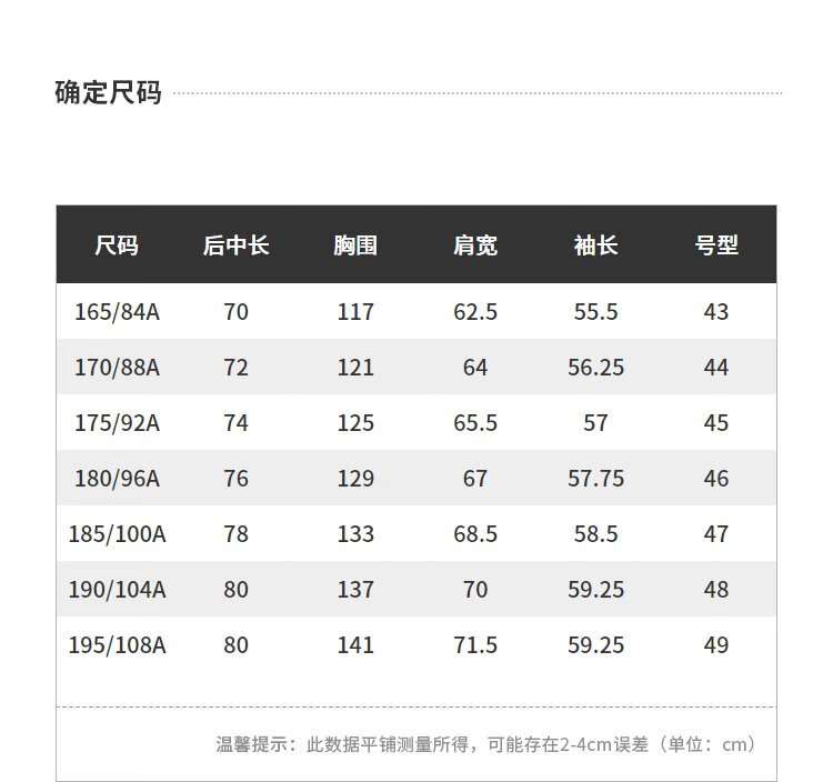 China (cm) 165 / 88-90 170 / 96-98 175 / 108-110 180 / 118-122 185 / 126-130
