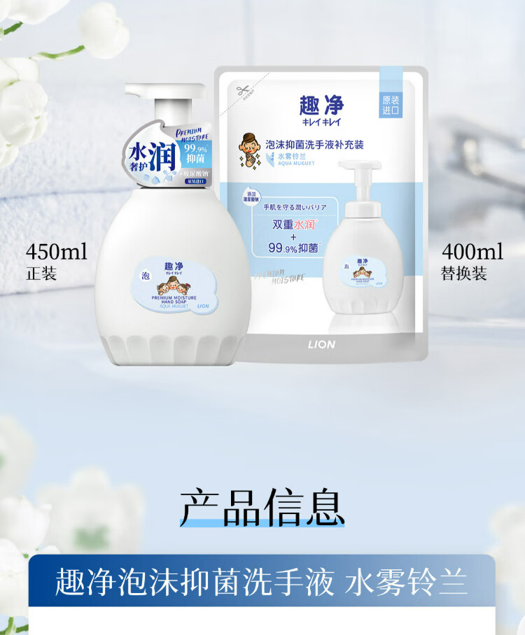 Lion Qujing Foam Antibacterial Hand Sanitizer Water Mist Lily of the Valley 400ml Refill Hyaluronic Acid Gentle Moisturizing Cleansing and Moisturizing