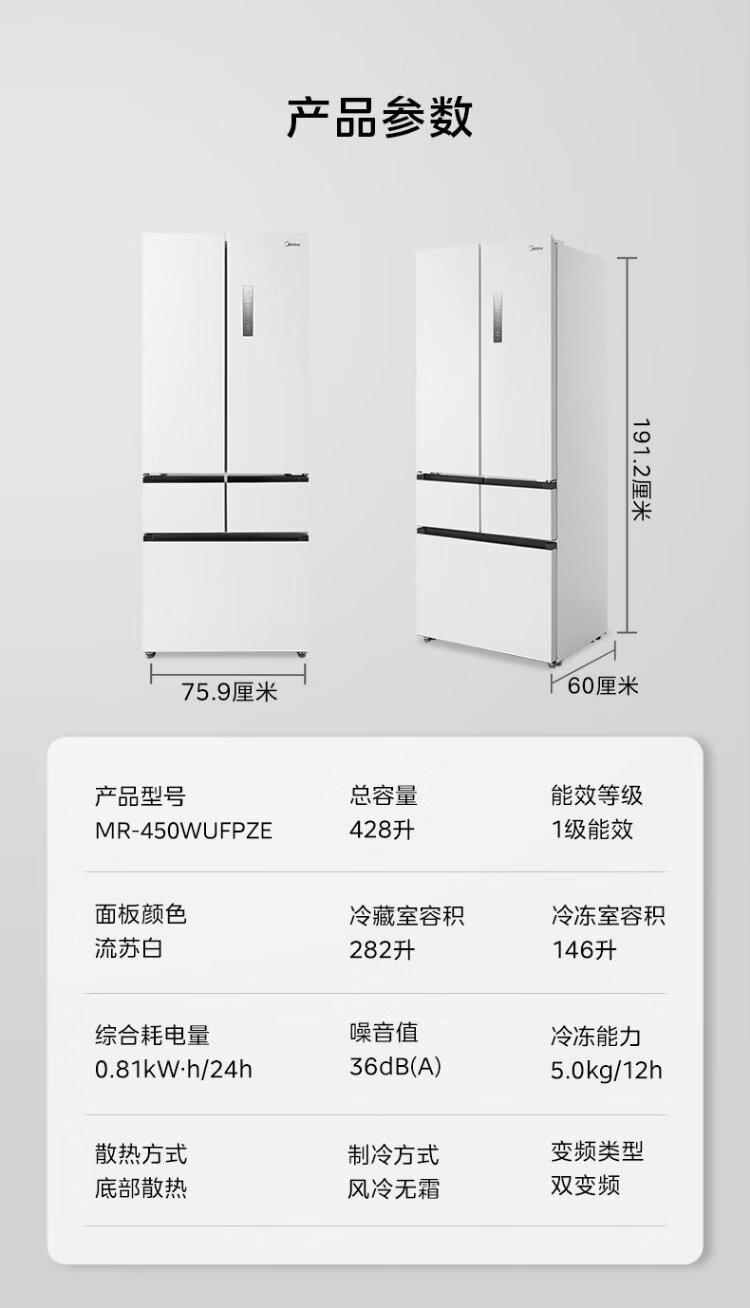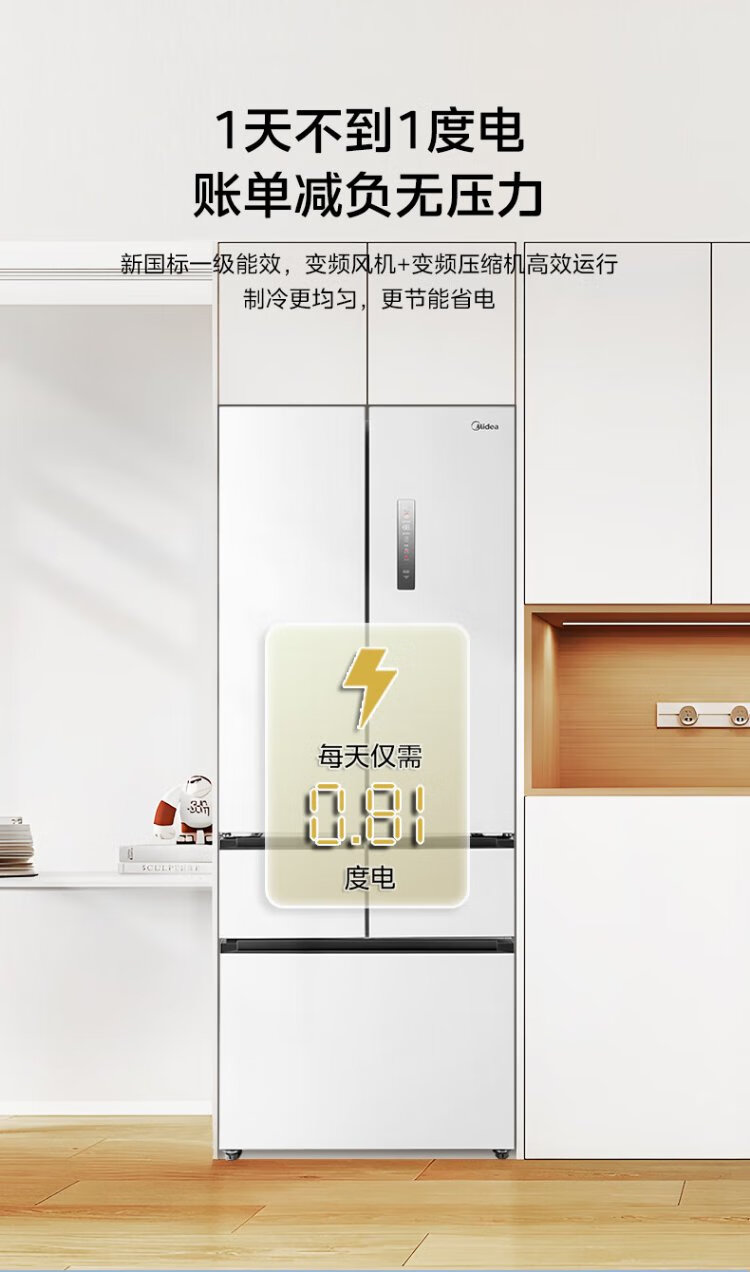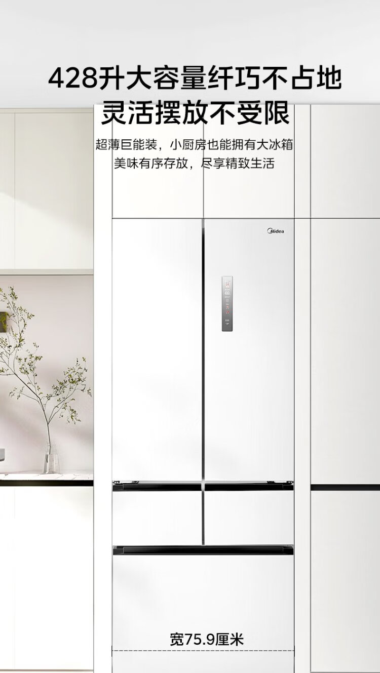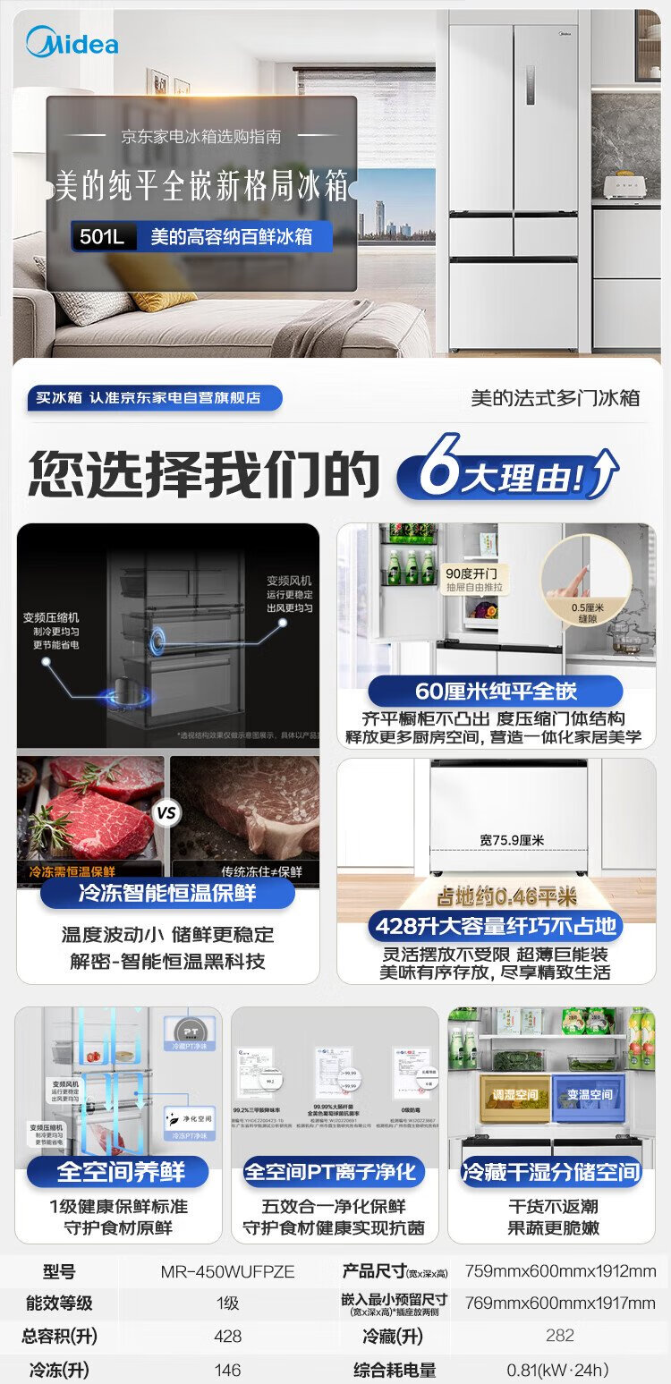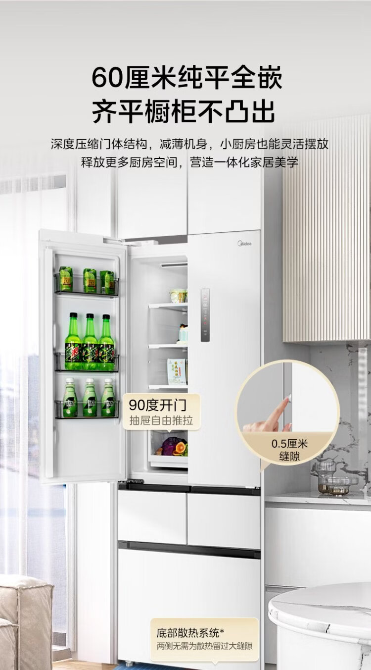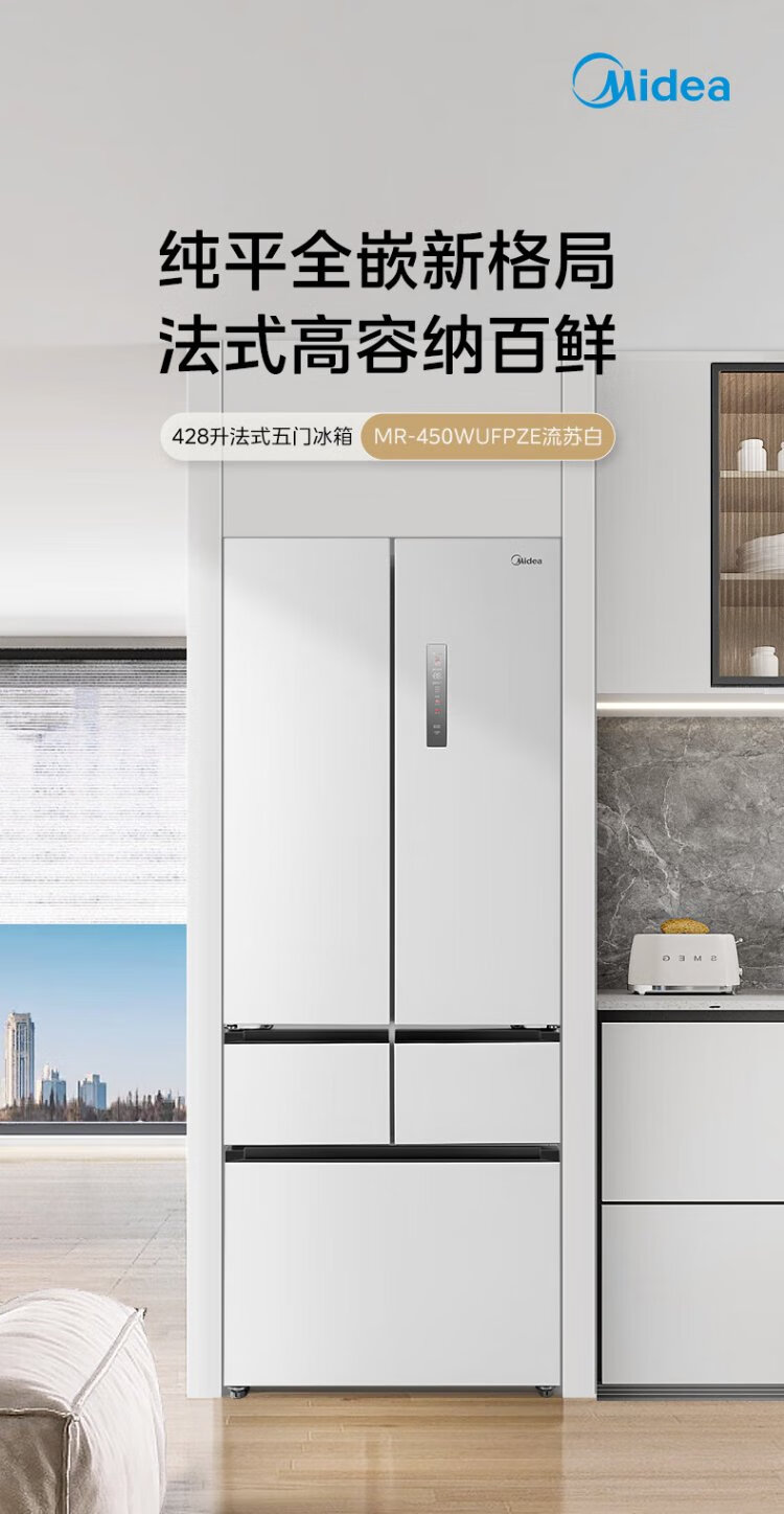 Midea 428L French five-door multi-door ultra-thin zero-embedded flat-screen fully embedded household refrigerator first-class energy efficiency frost-free frequency conversion three-speed variable temperature intelligent WIFI interconnection MR-450WUFPZE