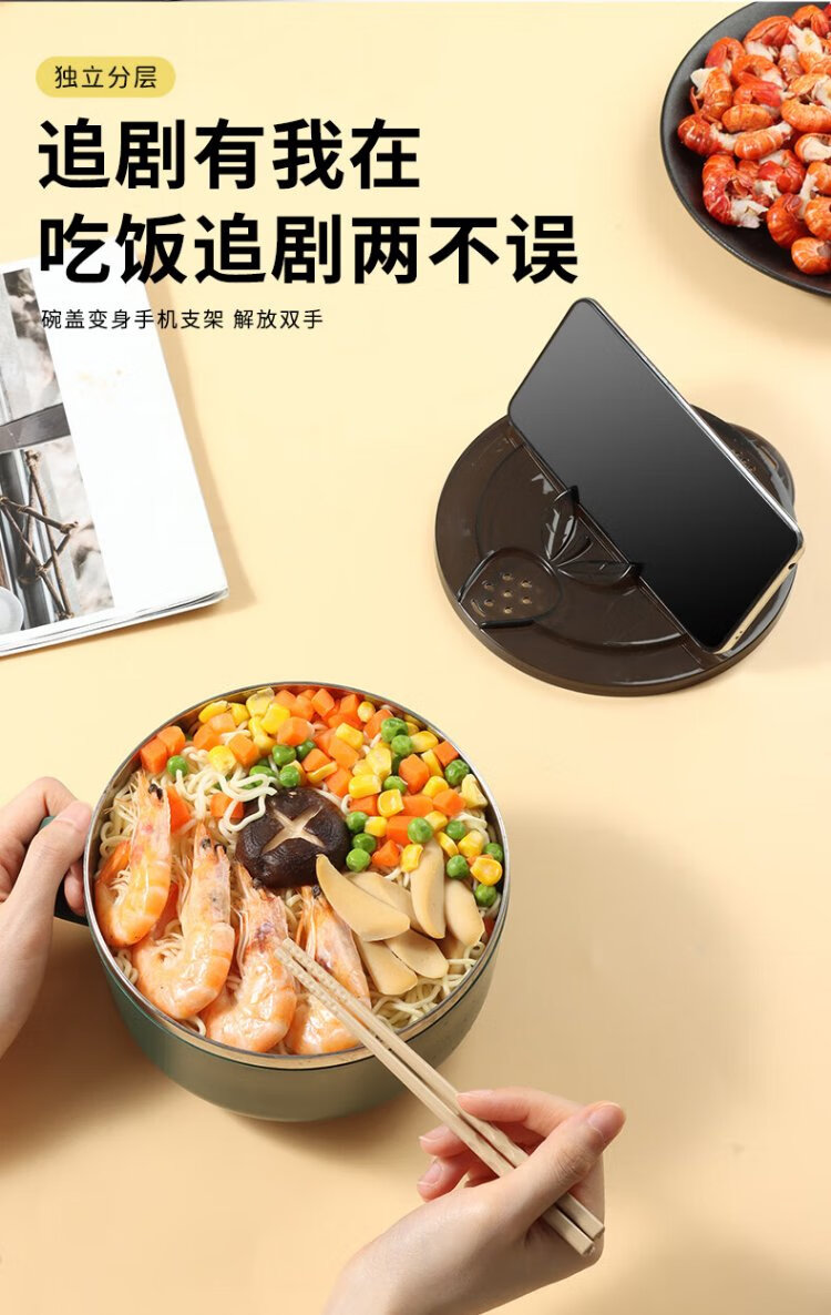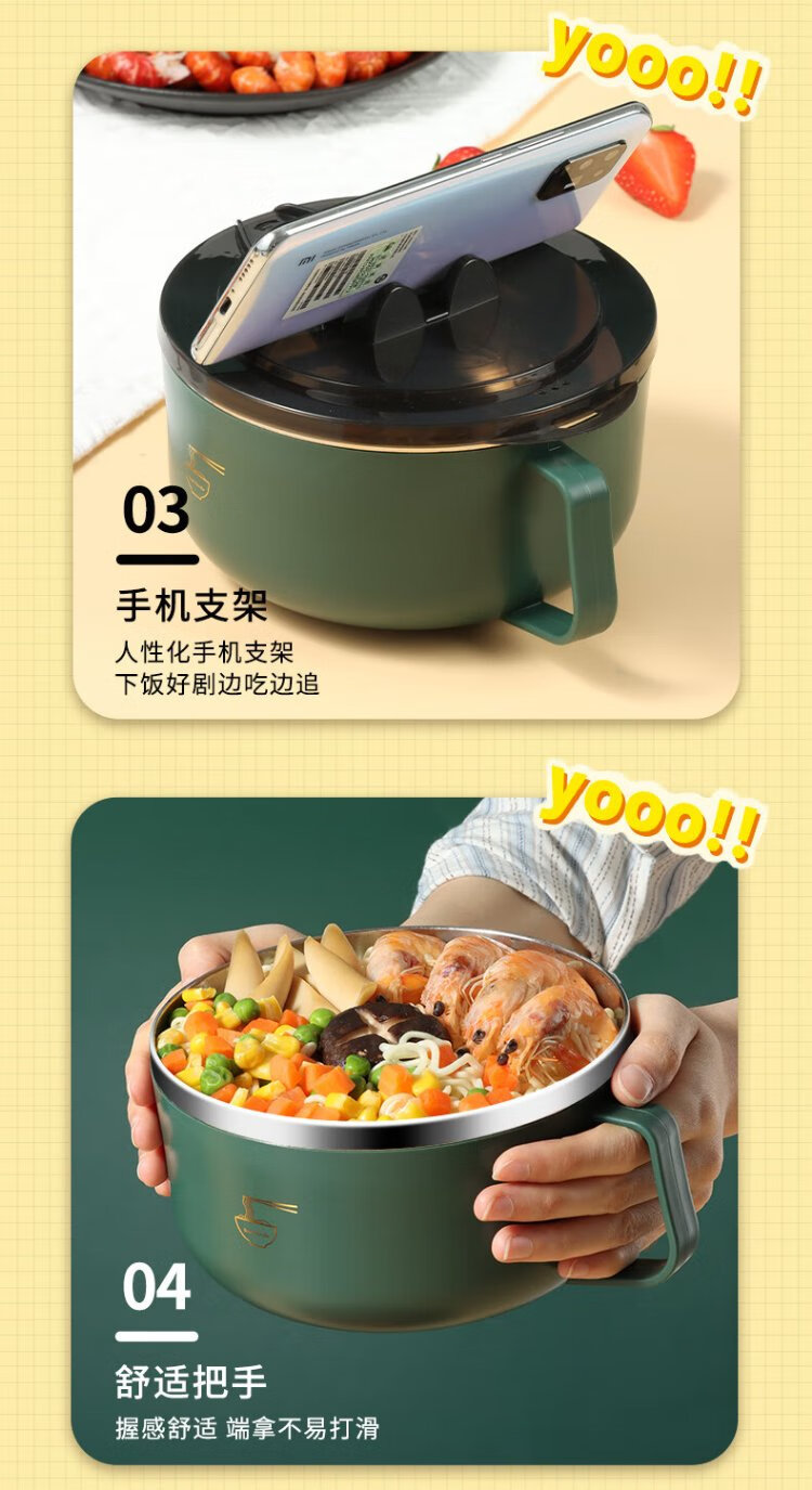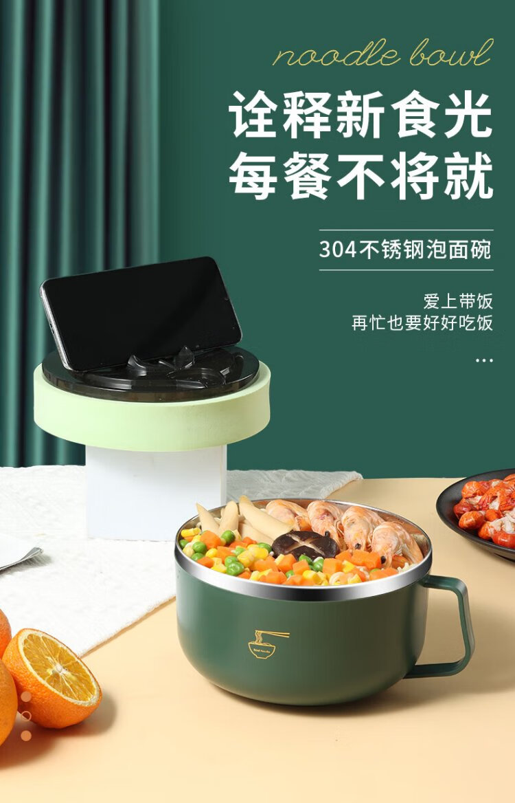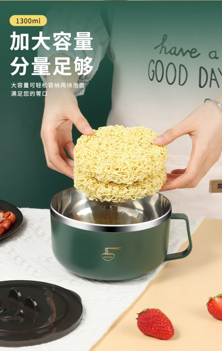 Baijie 304 stainless steel instant noodle bowl lunch box with lid, sealed and anti-scalding, student lunch box, office worker rice bowl, dark green 1300ml