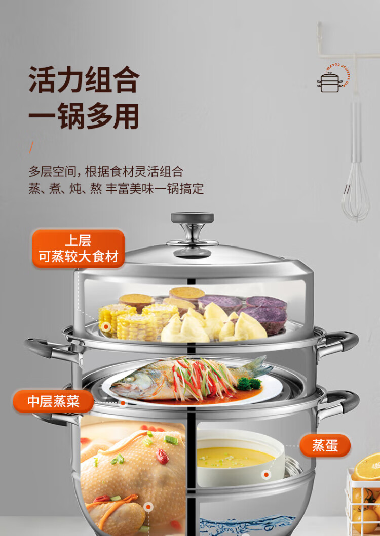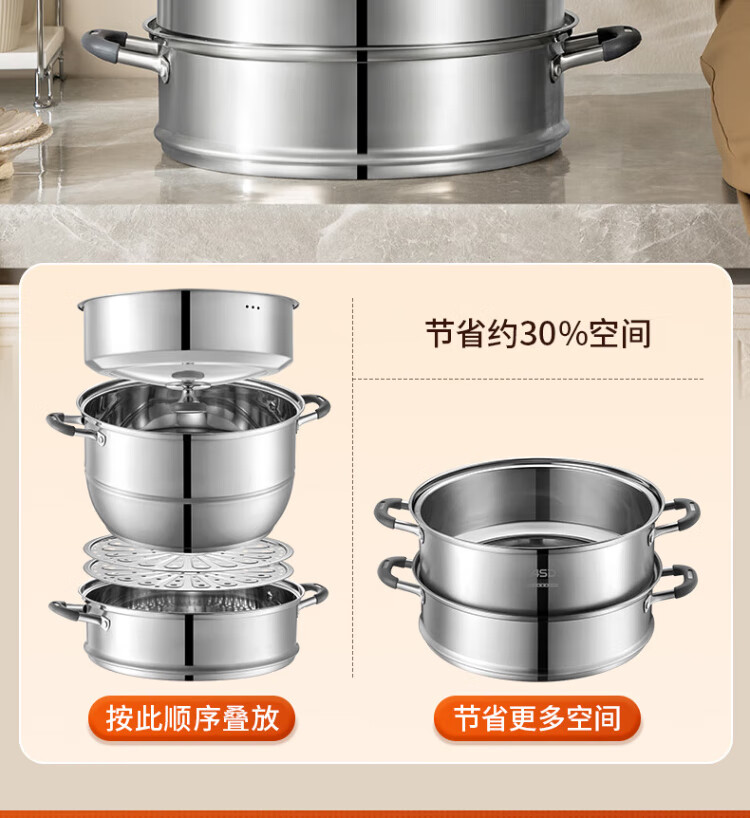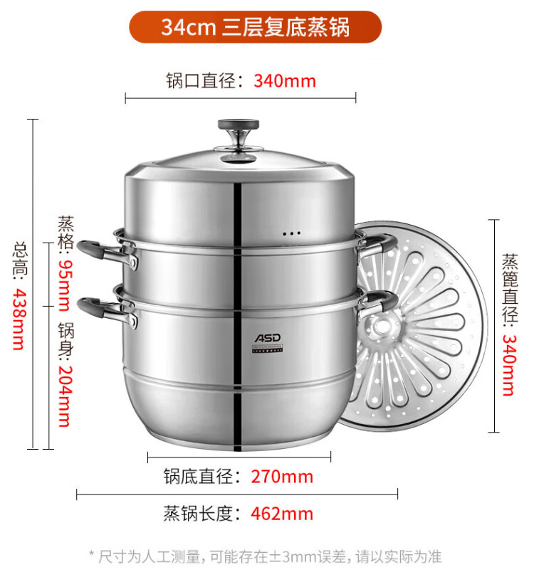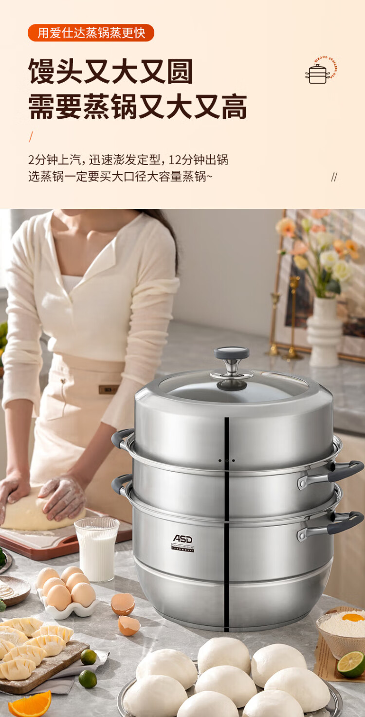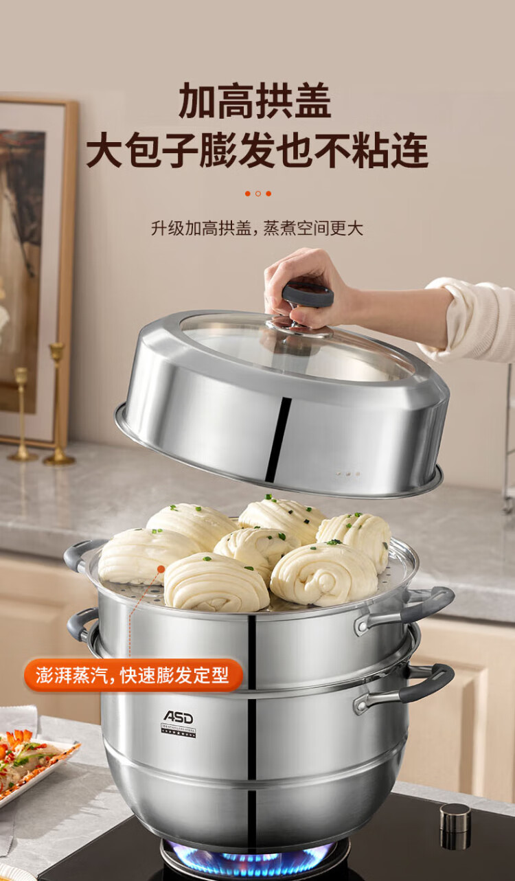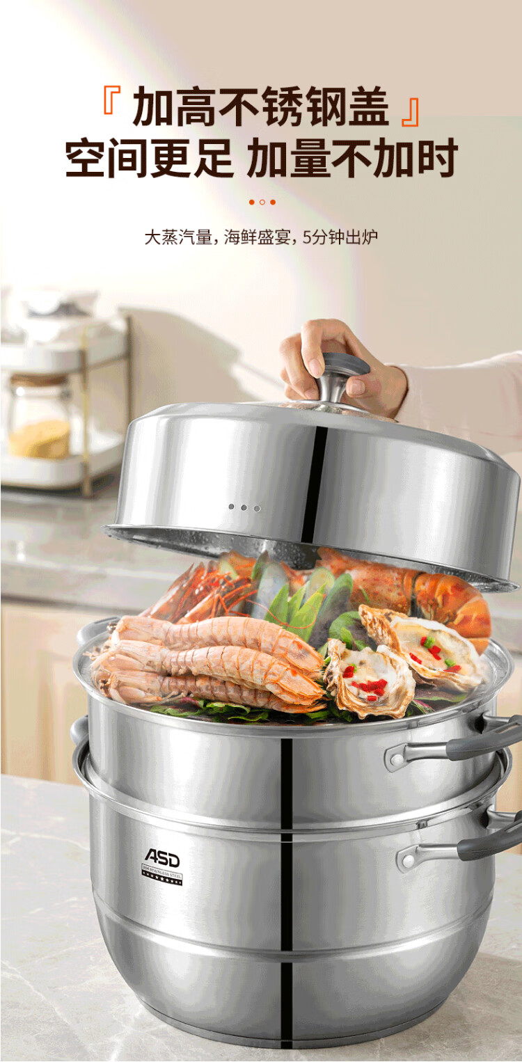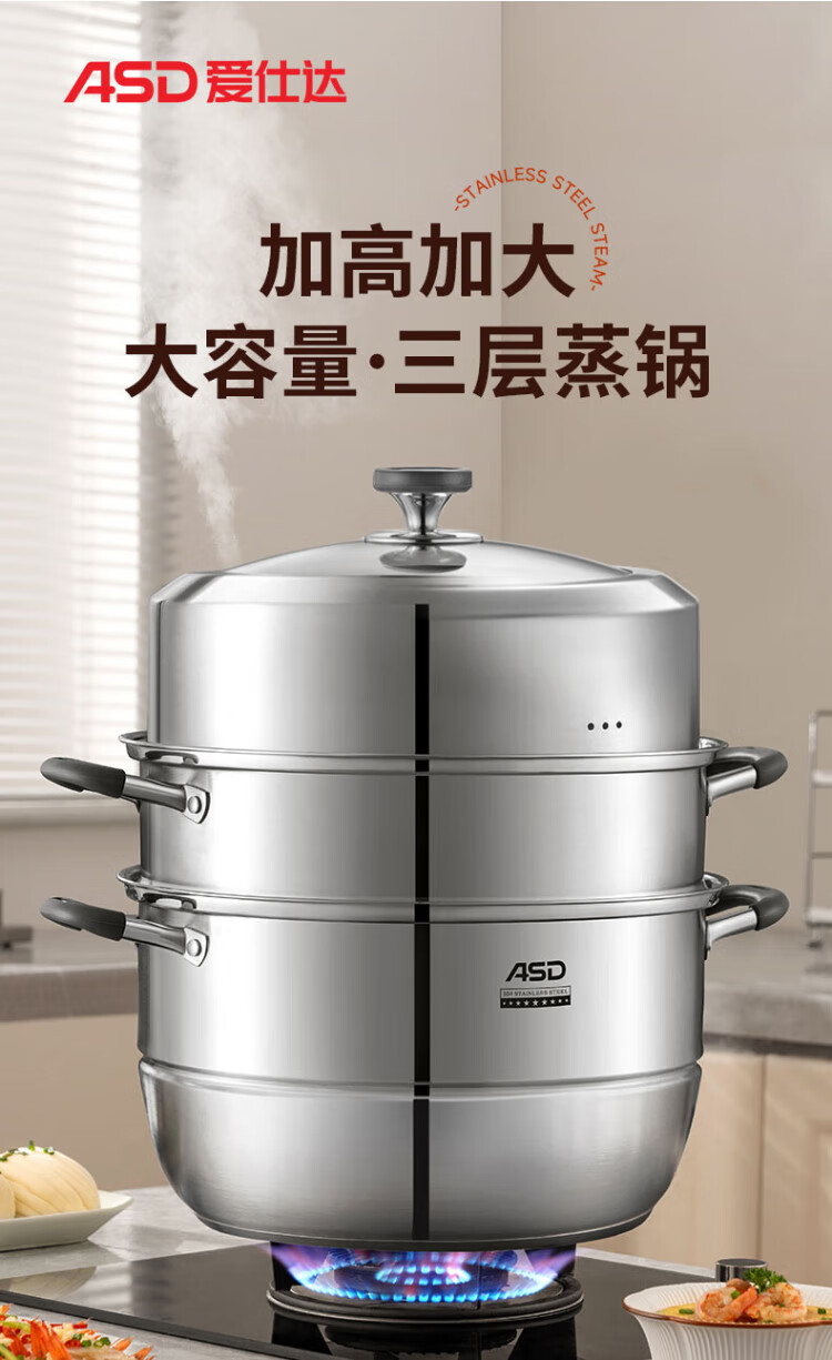 ASD Steamer 304 Stainless Steel Three-layer Steamer Household Steaming and Cooking Integrated Soup Pot 34CM Heightened Steamer Q1