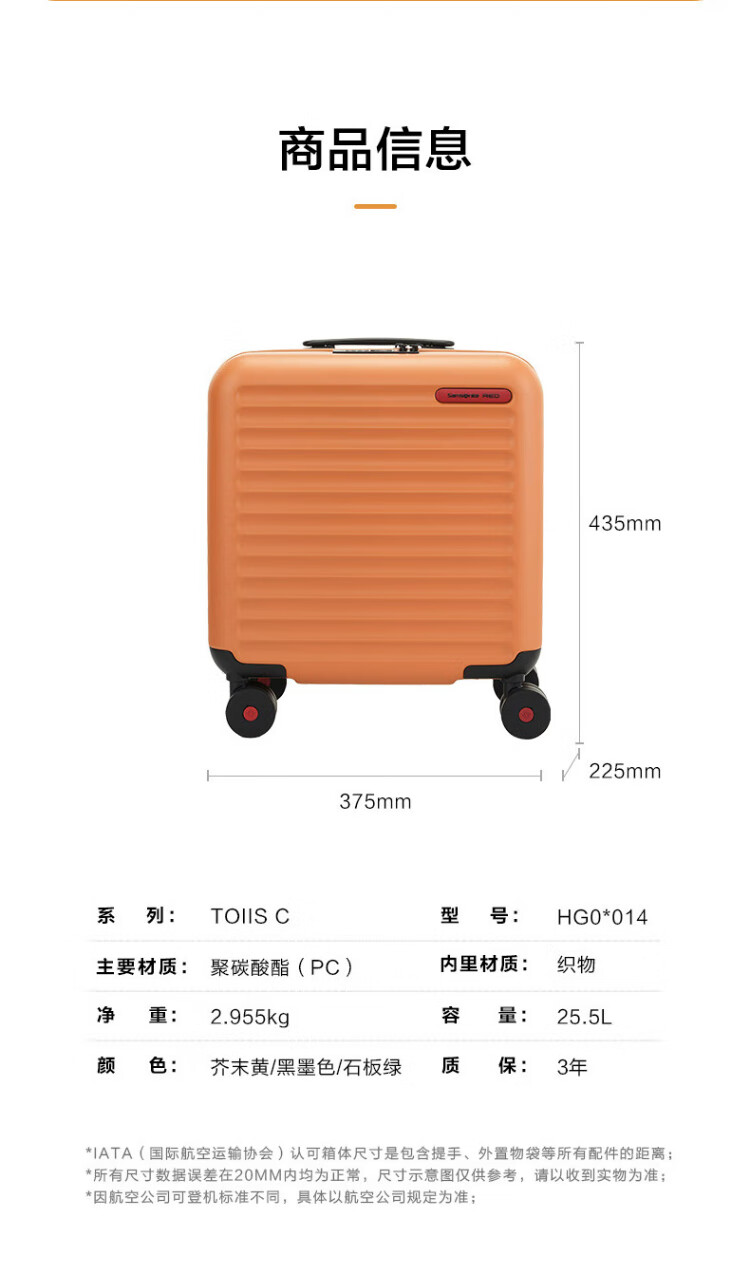 Samsonite suitcase 16-inch trolley case portable travel bag HG0 mustard yellow password boarding case
