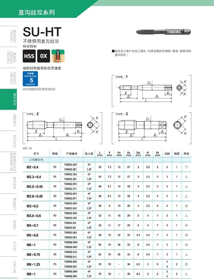 Japan YAMAWA imported stainless steel straight groove tapping SU-HT cobalt-containing high-speed steel surface oxidation treatment machine tap for chip removal through holes P2 (4P) M5X0.8