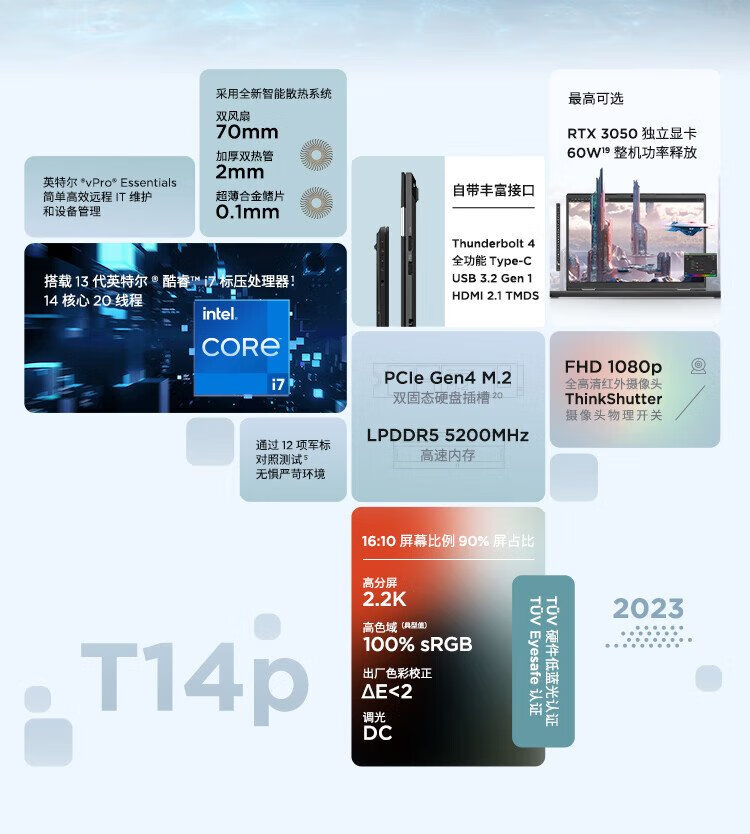 ThinkPad T14p Lenovo 14-inch high-performance standard voltage business office gaming laptop 13th generation Core i7-13700H 16G 512G RTX3050 2.2K