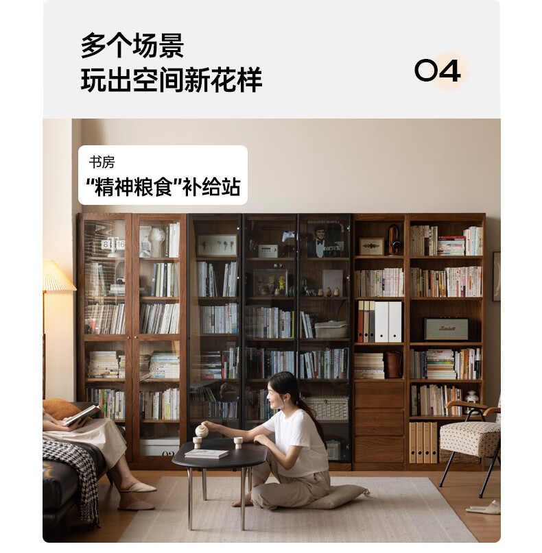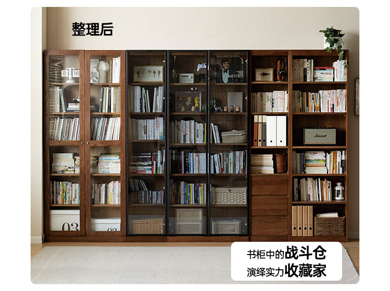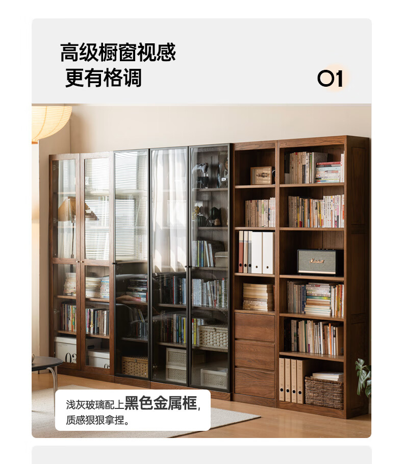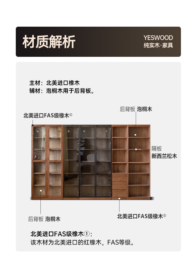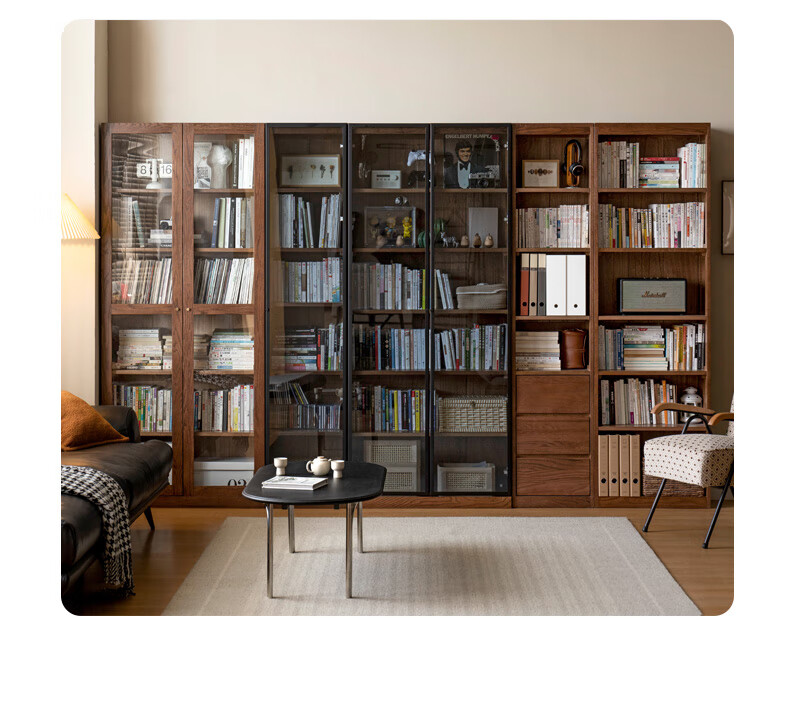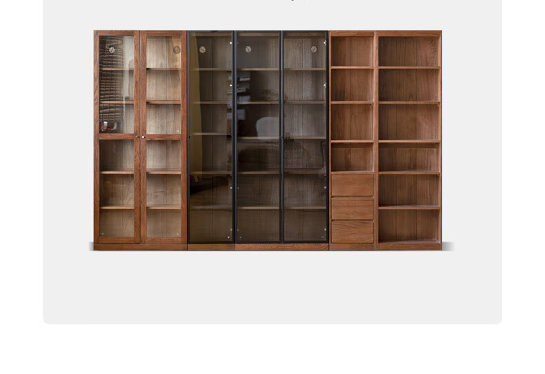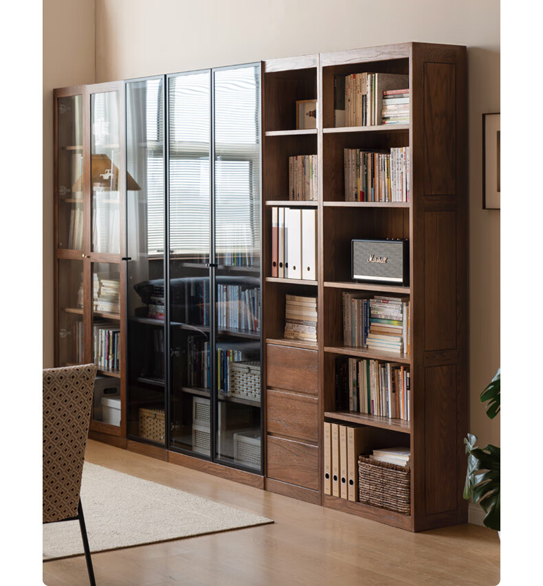 Genji Muyu solid wood bookcase simple modern study furniture oak storage cabinet living room with glass door three drawers semi-open cabinet