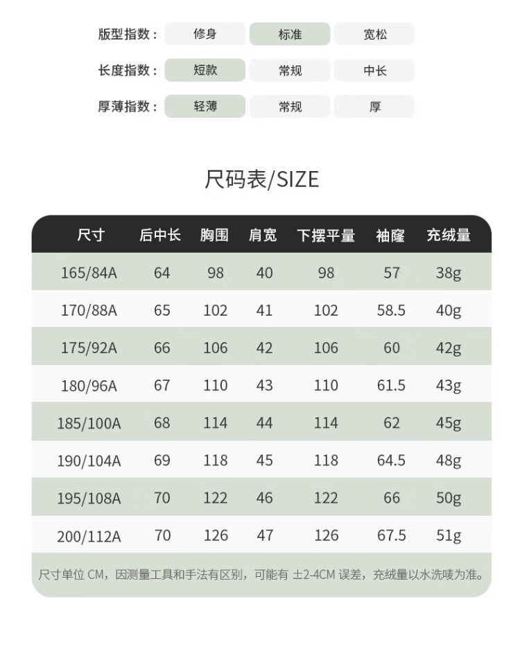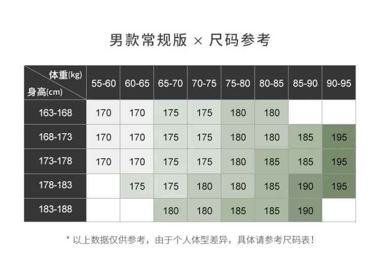 China (cm) 165 / 88-90 170 / 96-98 175 / 108-110 180 / 118-122 185 / 126-130