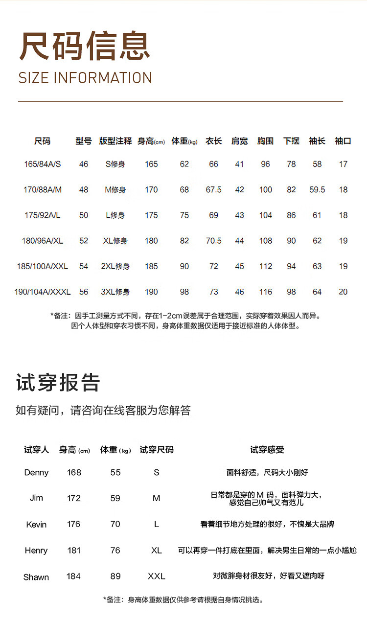 China (cm) 165 / 88-90 170 / 96-98 175 / 108-110 180 / 118-122 185 / 126-130