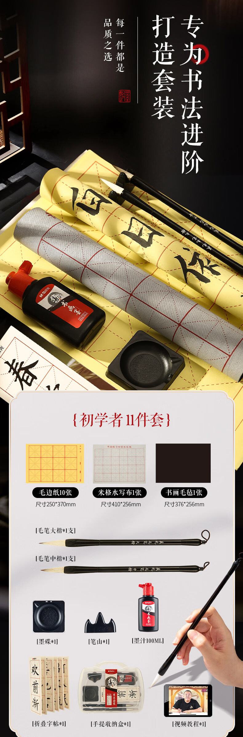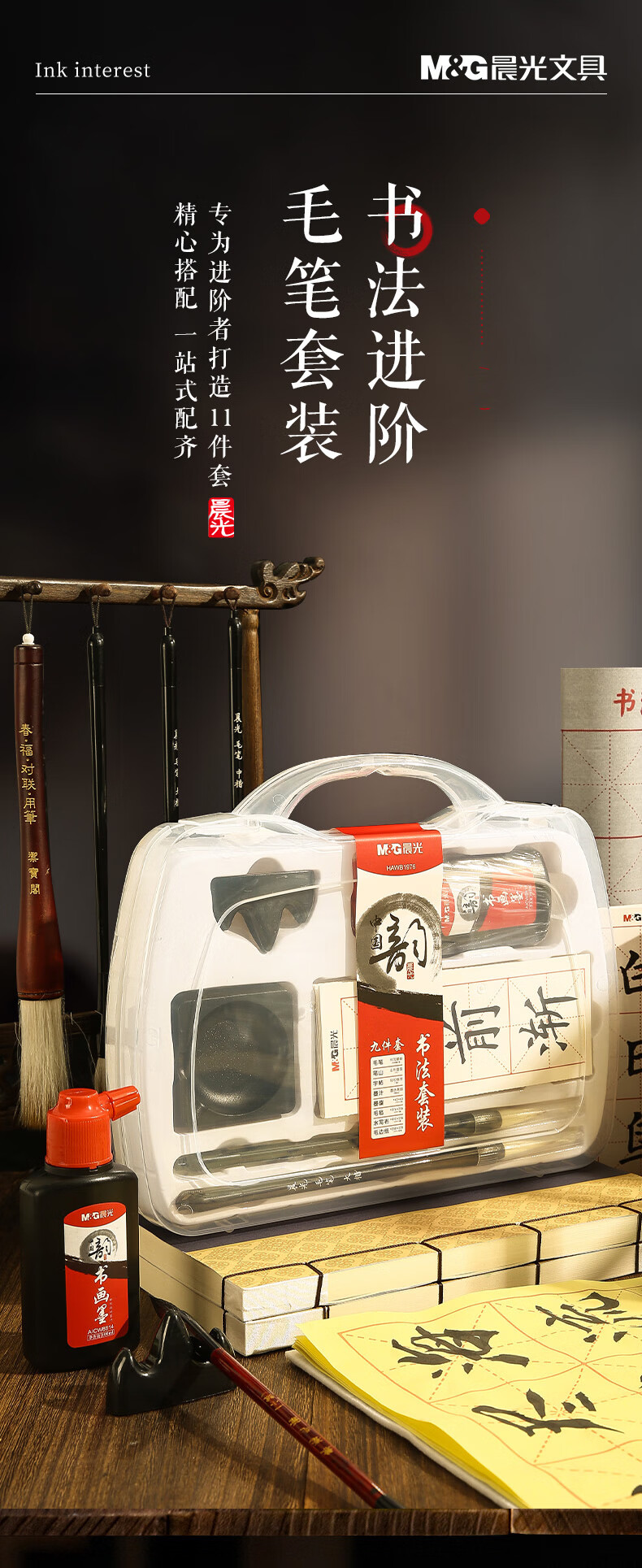 M&G Stationery Four Treasures Student Portable Brush Set Adult Beginner Pen, Ink, Paper and Inkstone 11-piece Set Calligraphy Practice Halloween Gift HAWB1976