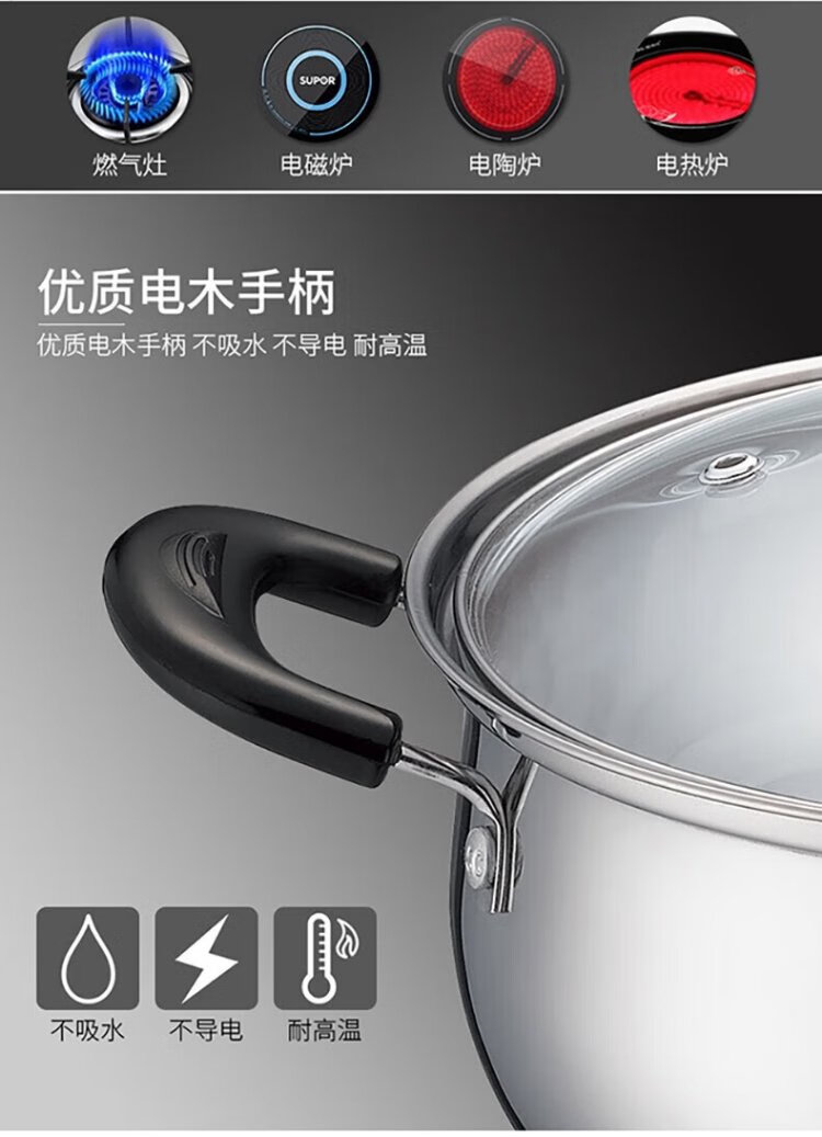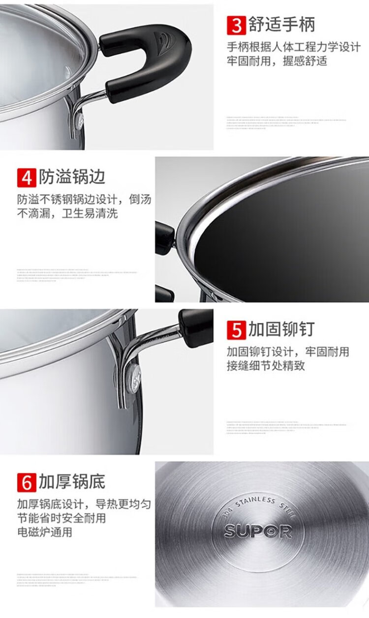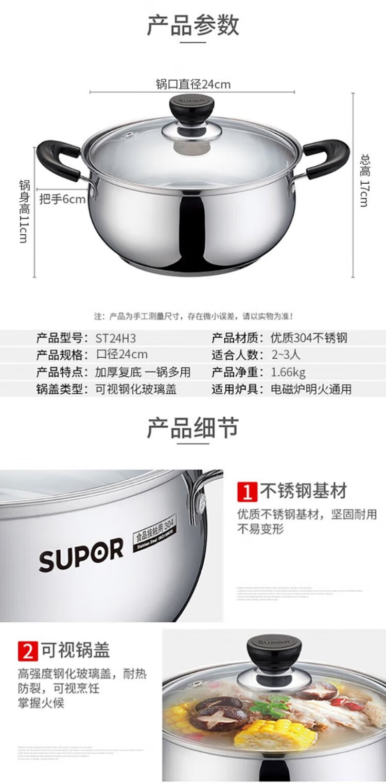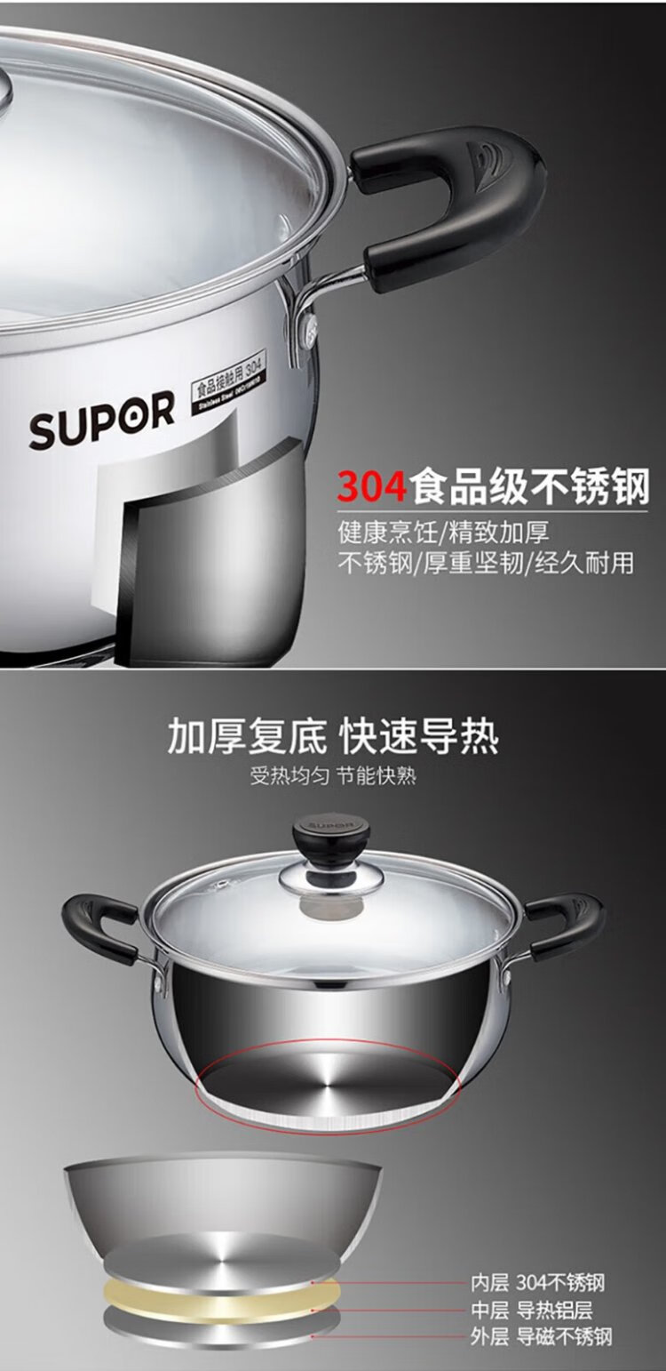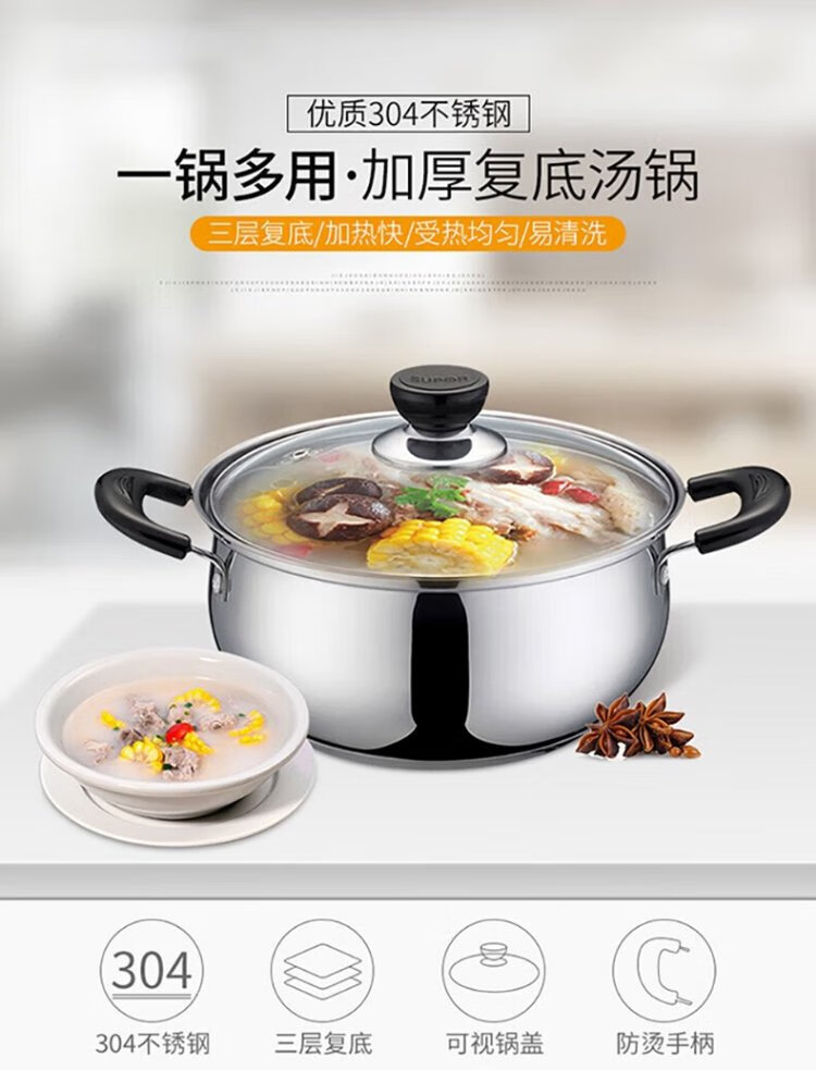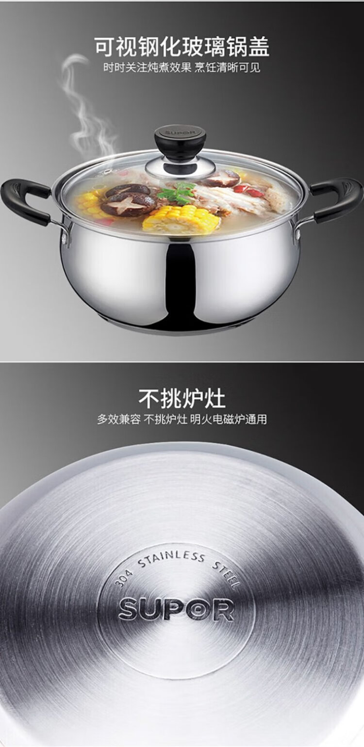 SUPOR soup pot thickened 304 stainless steel stew pot double-ear anti-scalding porridge and noodle pot gas induction cooker universal ST24H3
