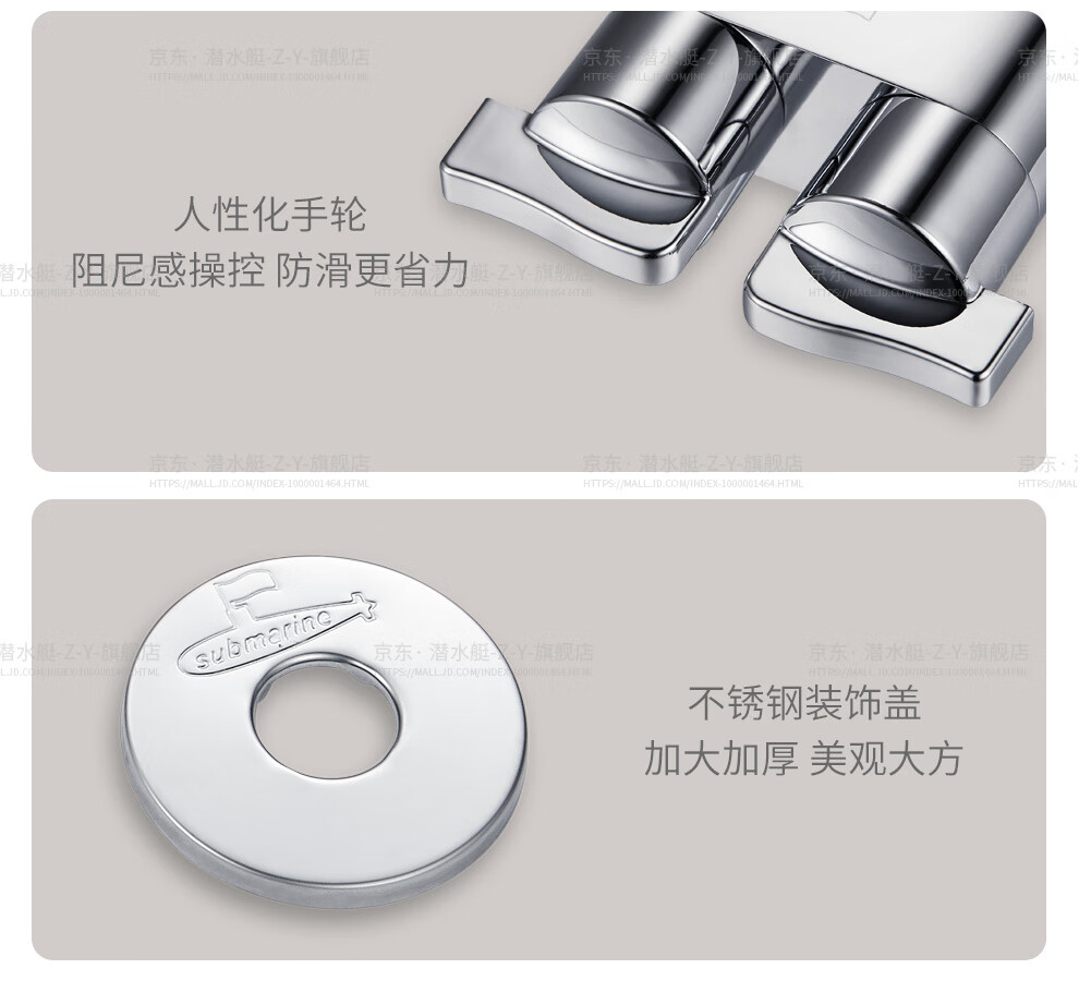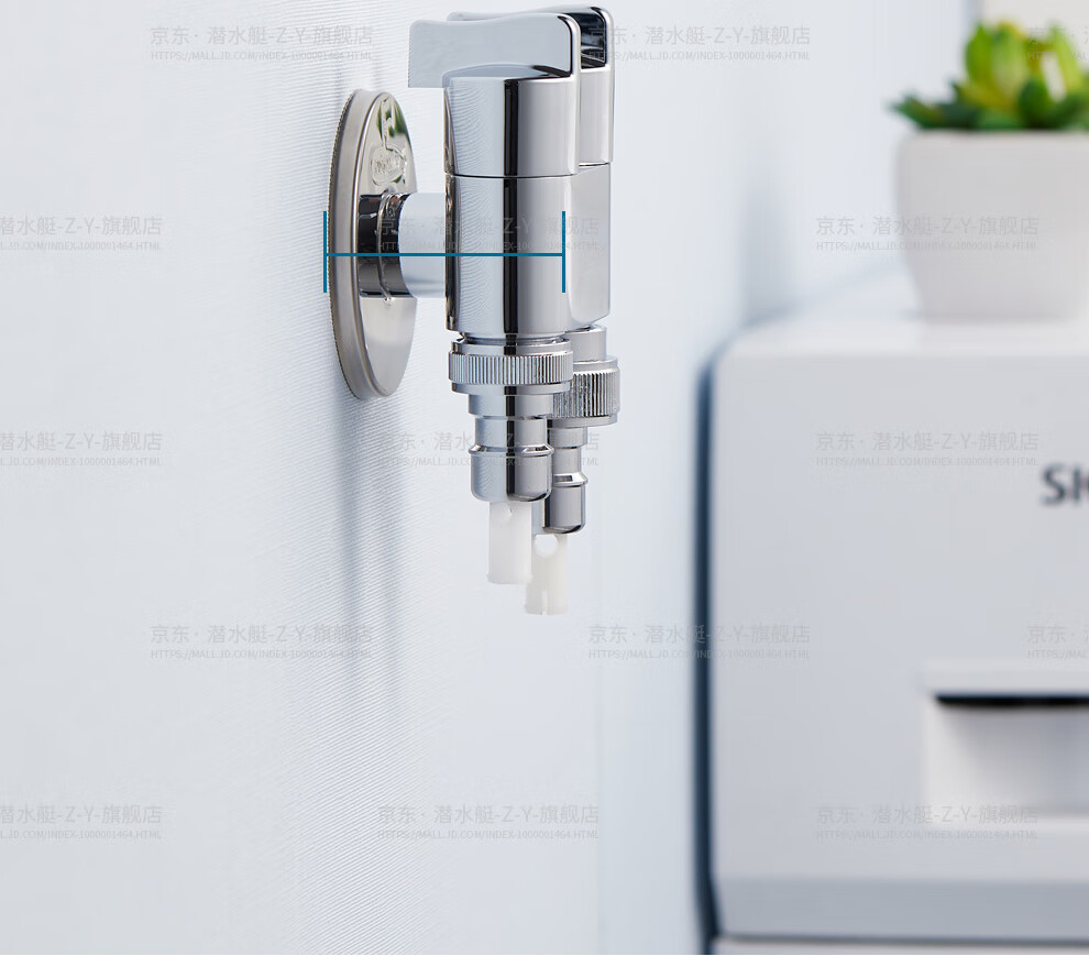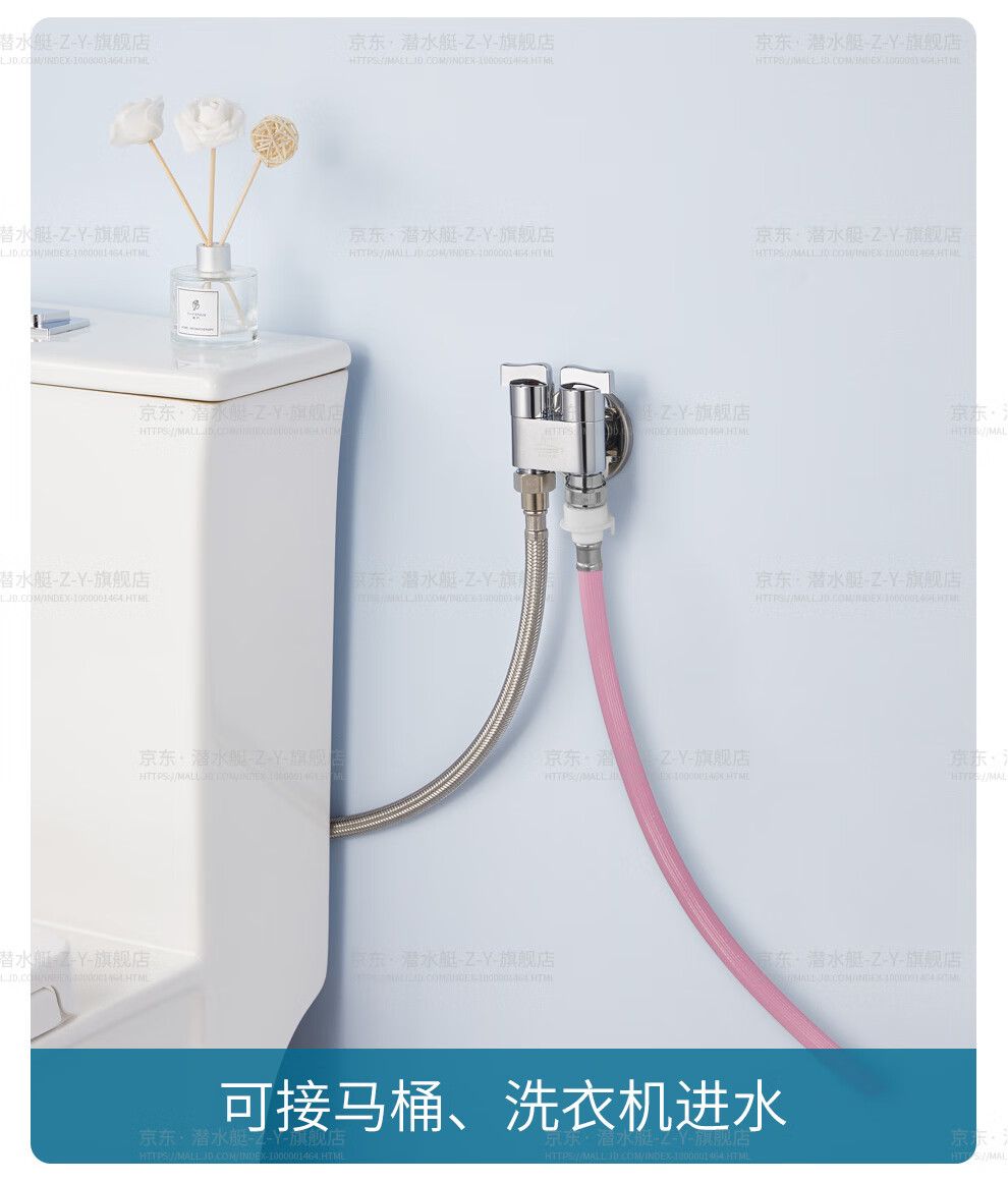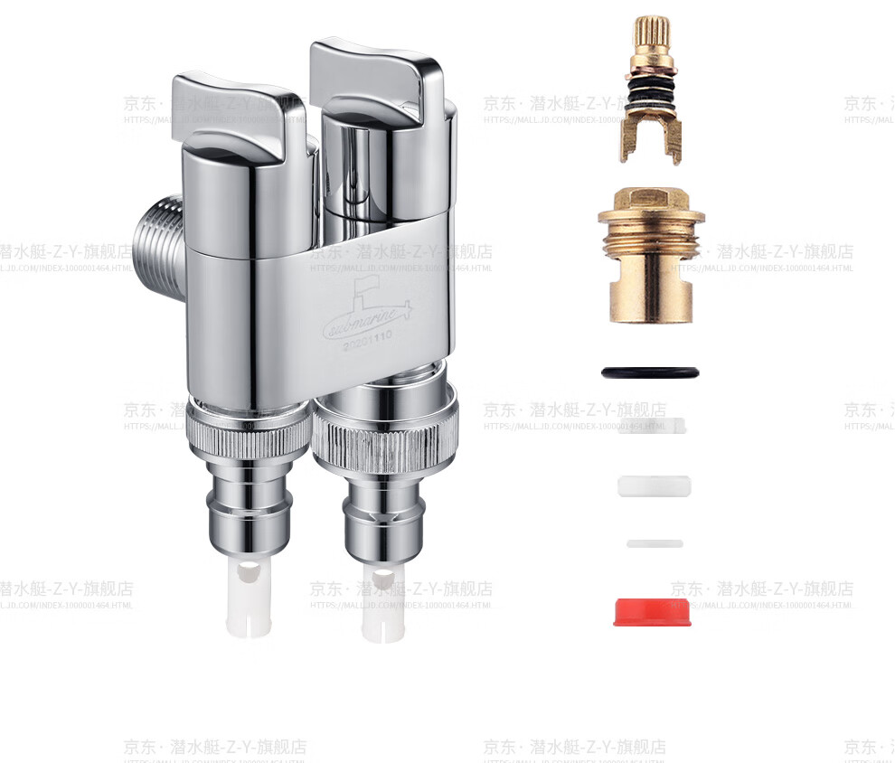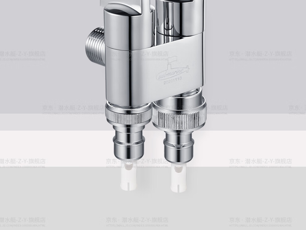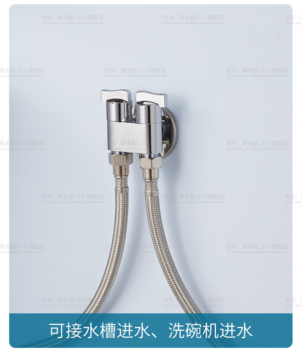 Submarine F403 one-in, two-out, three-way angle valve, brass, chrome-plated, double handle, double control, separate water outlet, built-in water stop device, silver, special supply