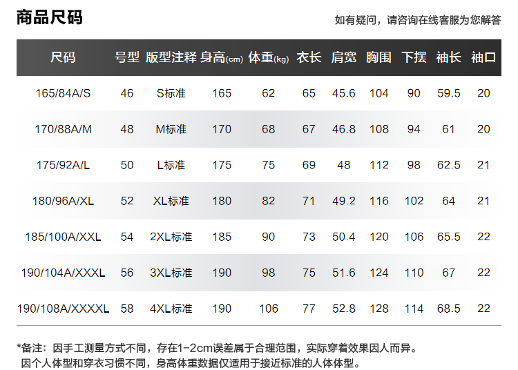 China (cm) 165 / 88-90 170 / 96-98 175 / 108-110 180 / 118-122 185 / 126-130