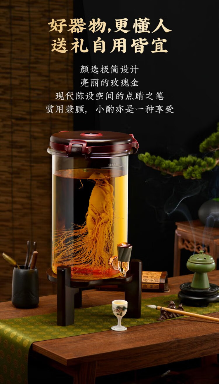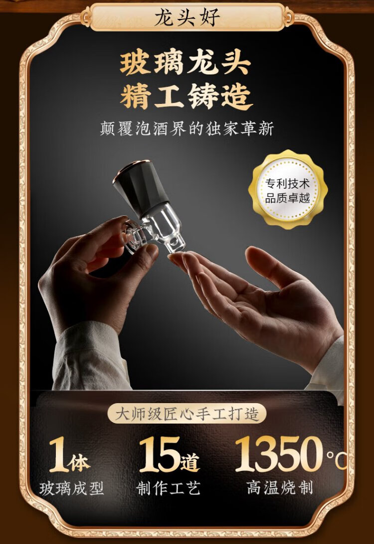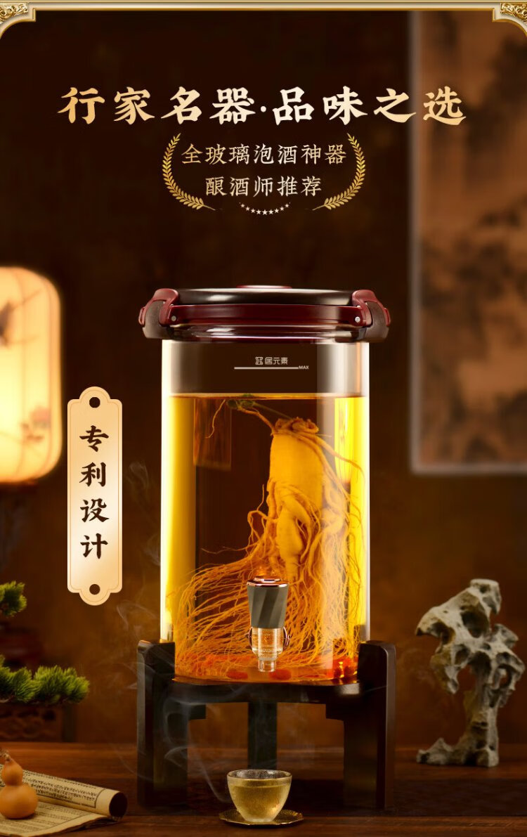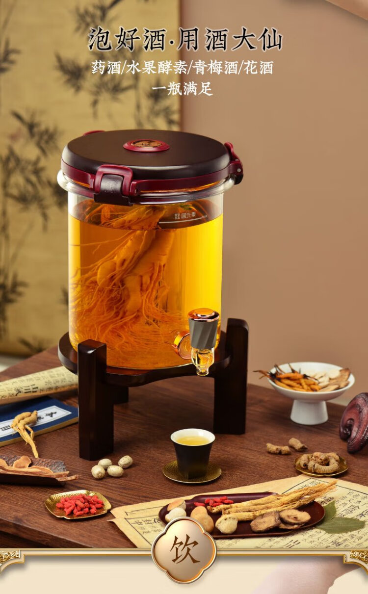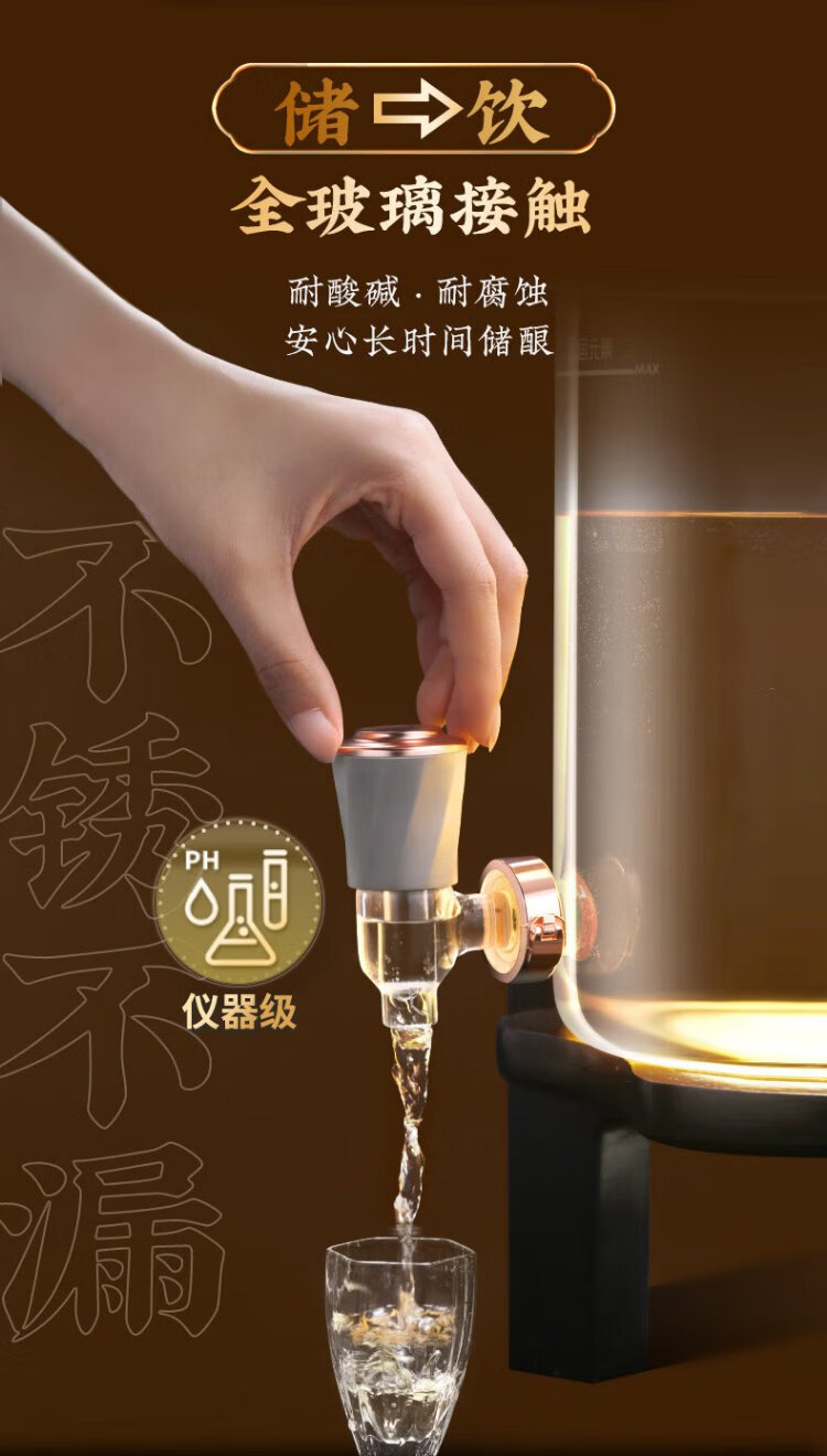 Ju element high-end thickened heat-resistant glass sealed wine container solid wood lid glass faucet + solid wood base 10L