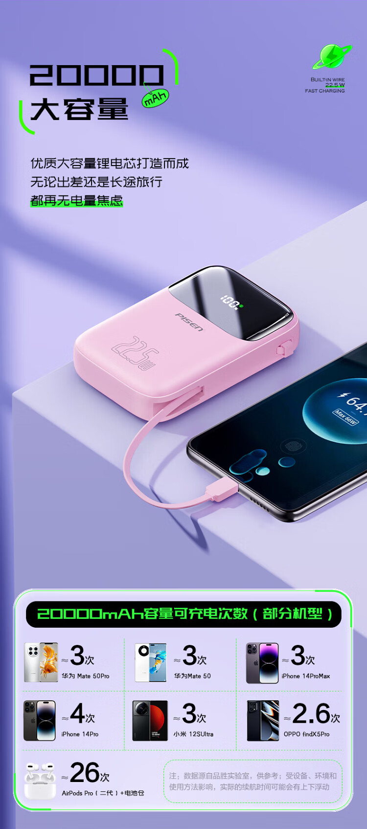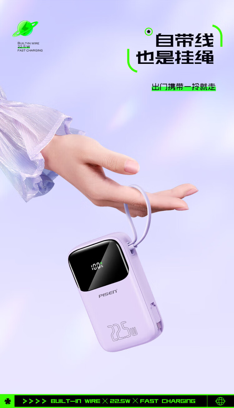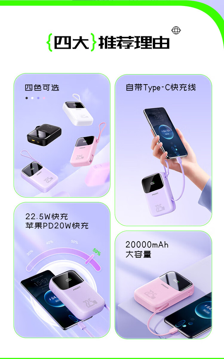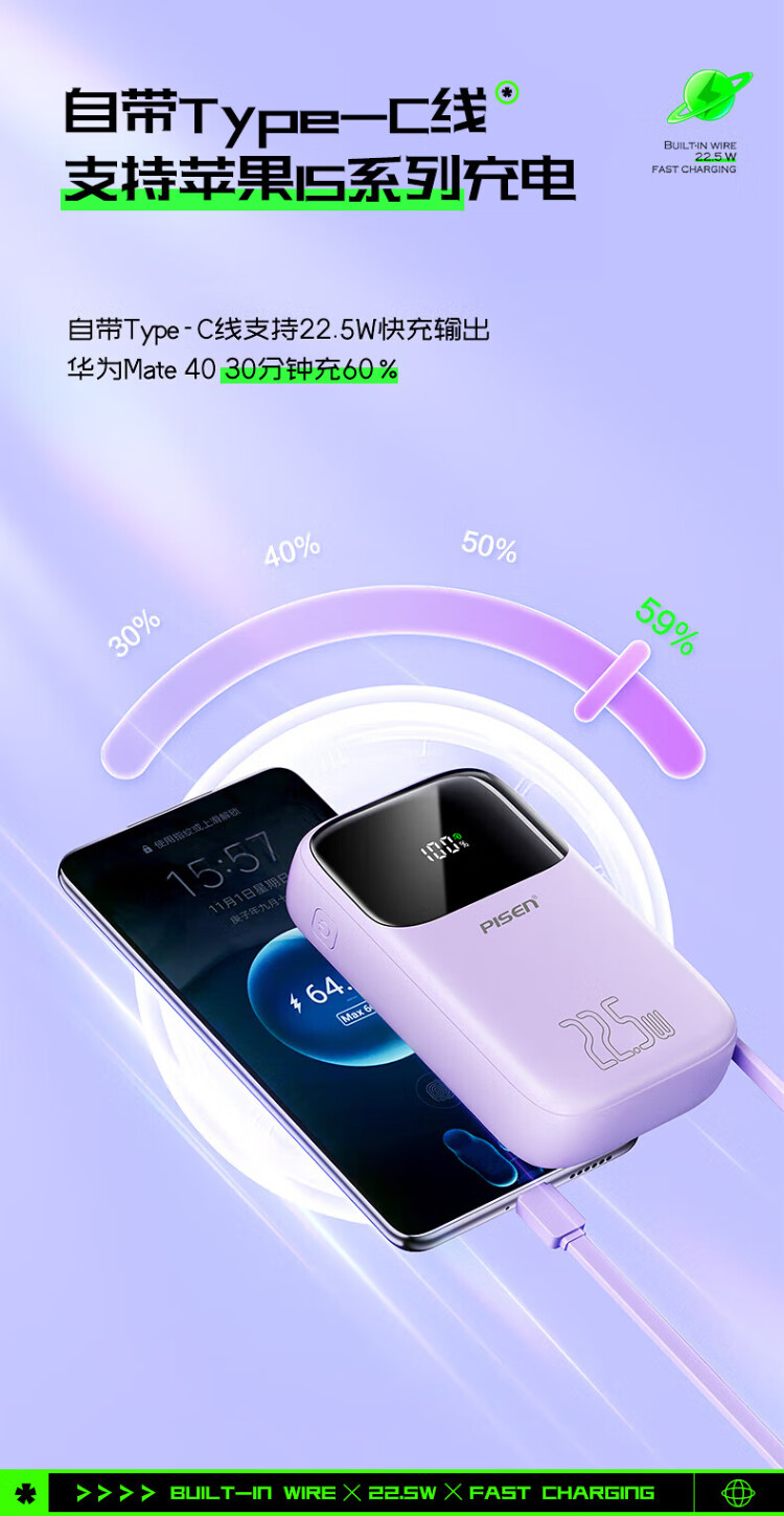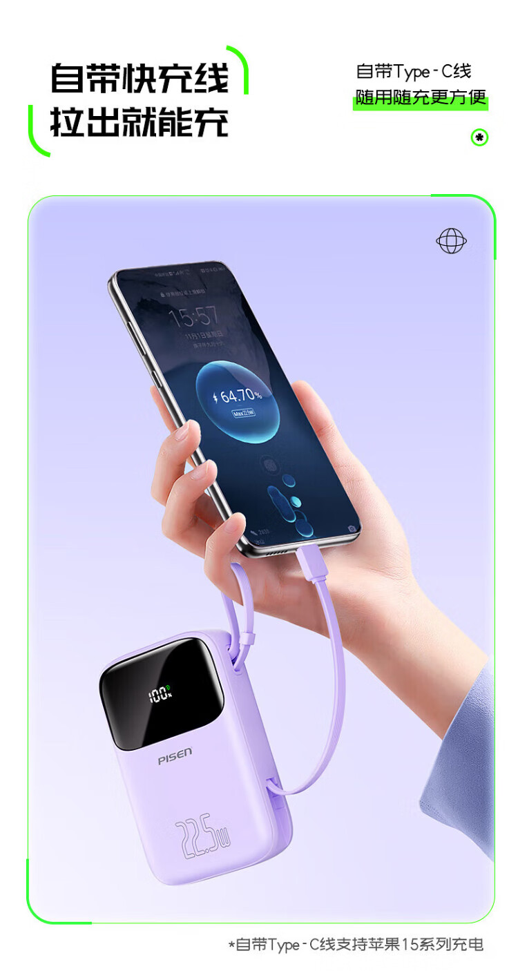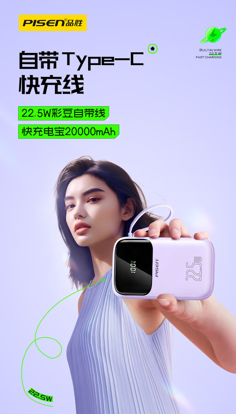 Pinsheng 3C certification comes with Type-C cable power bank 20000 mAh, can be used on airplanes, 22.5W fast charging mobile power supply, suitable for Huawei Apple 17promax Xiaomi Purple