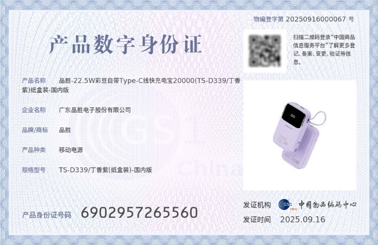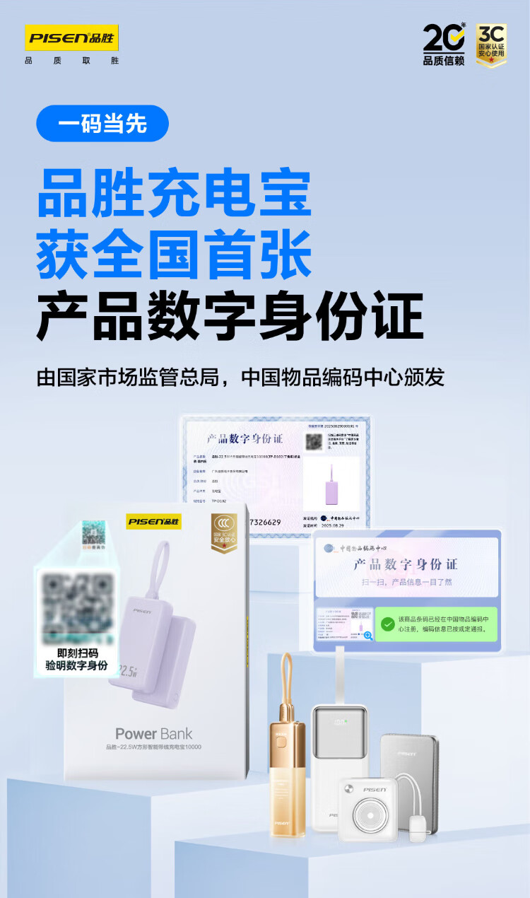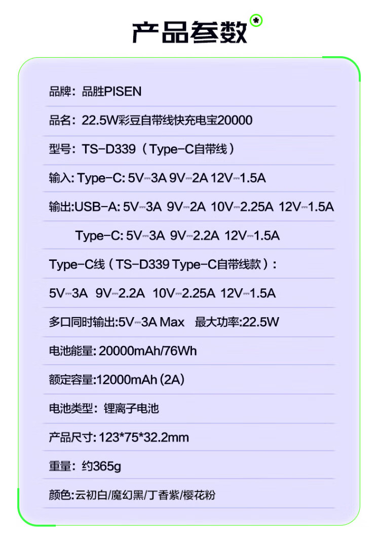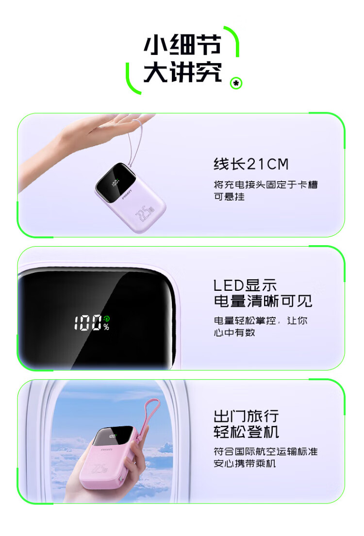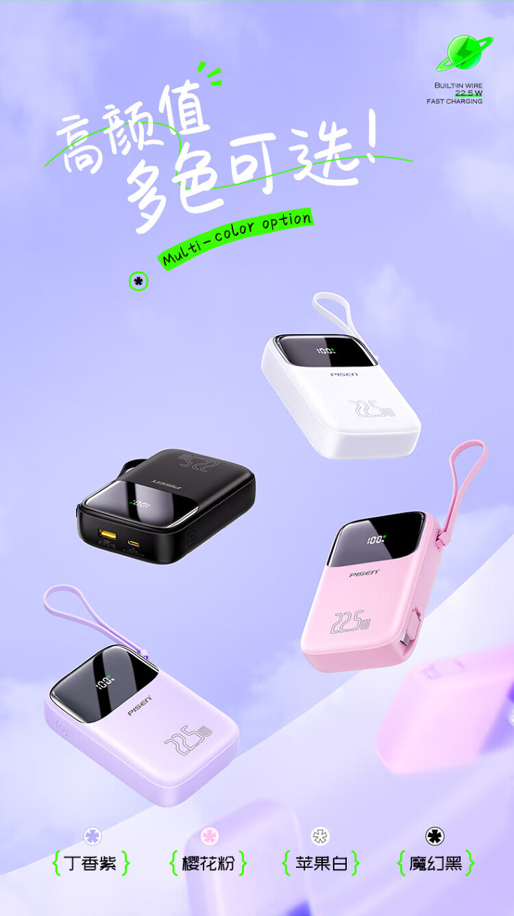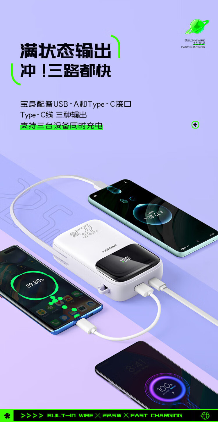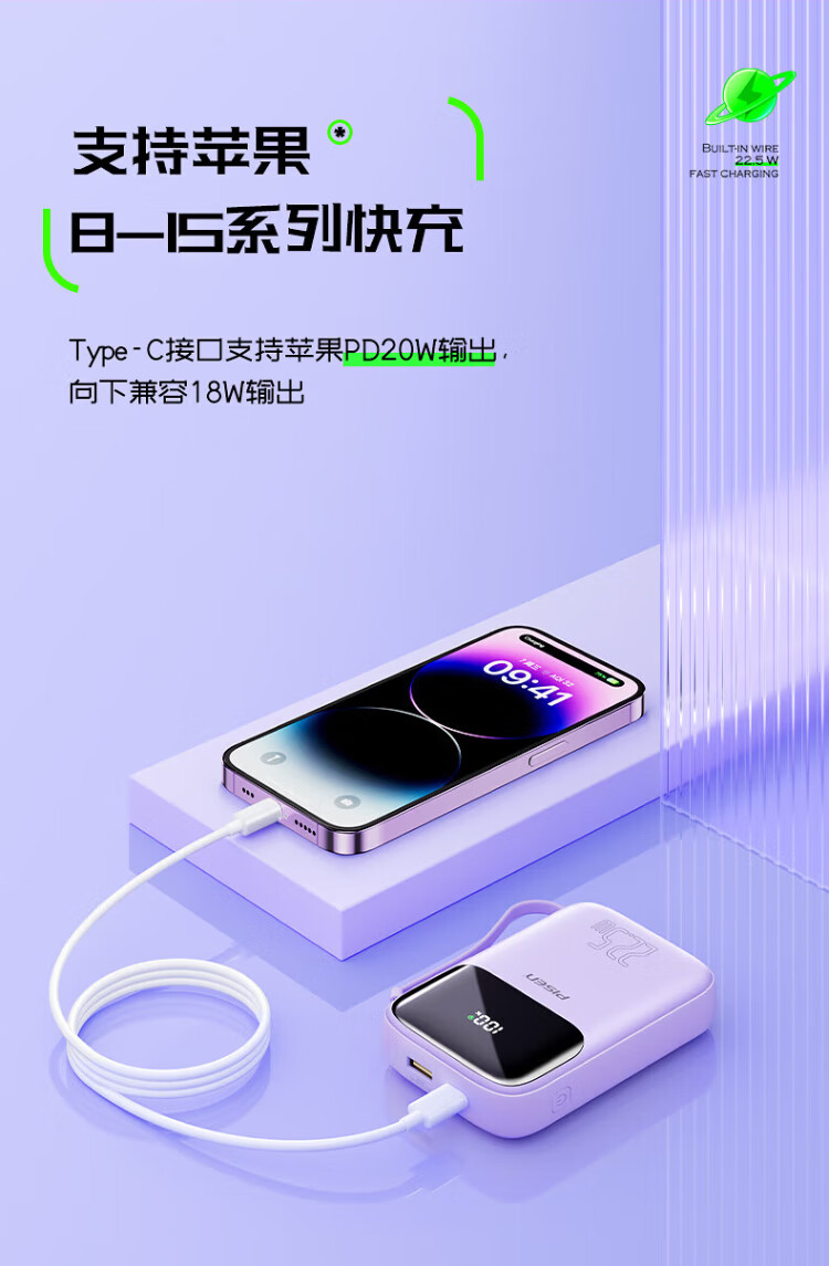 Pinsheng 3C certification comes with Type-C cable power bank 20000 mAh, can be used on airplanes, 22.5W fast charging mobile power supply, suitable for Huawei Apple 17promax Xiaomi Purple
