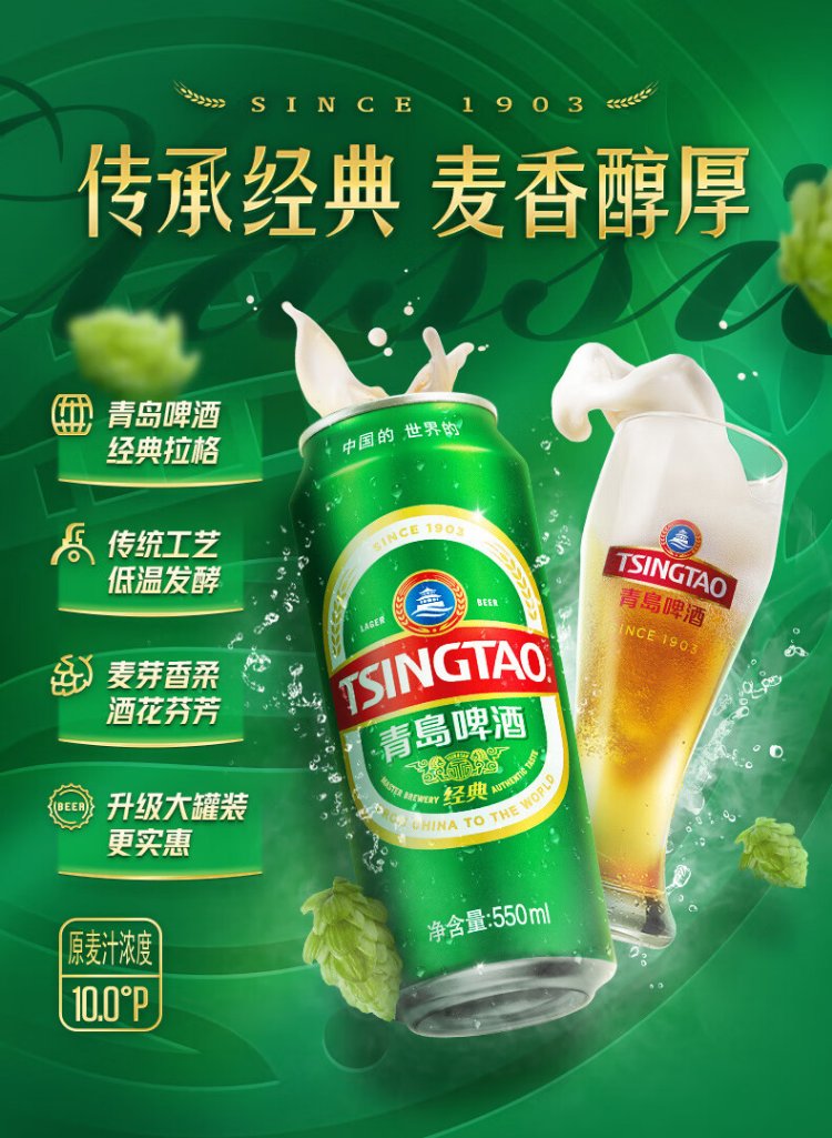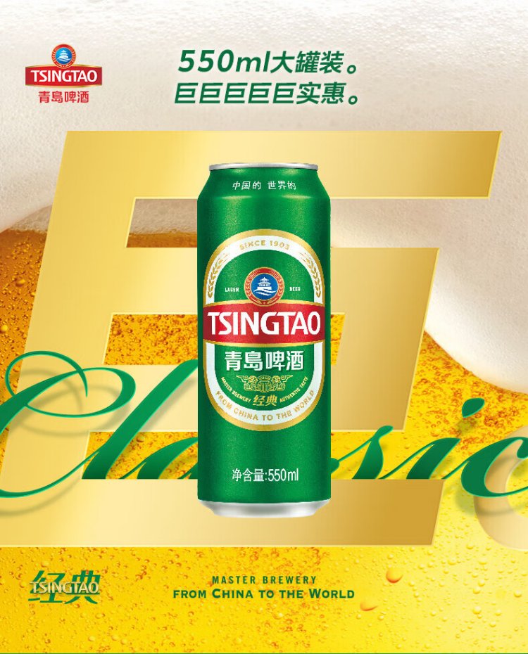 Tsingtao Beer (TsingTao) Classic Lager 550ml*18 cans No increase in price for larger quantities Full box Double Eleven hot sale