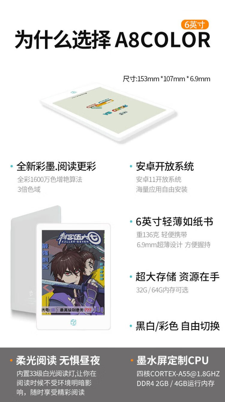 Chinese electronic paper book A8c state subsidy 6-inch Android 11 open system 64G color ink screen e-book reader ink screen tablet ink screen novel electronic notebook