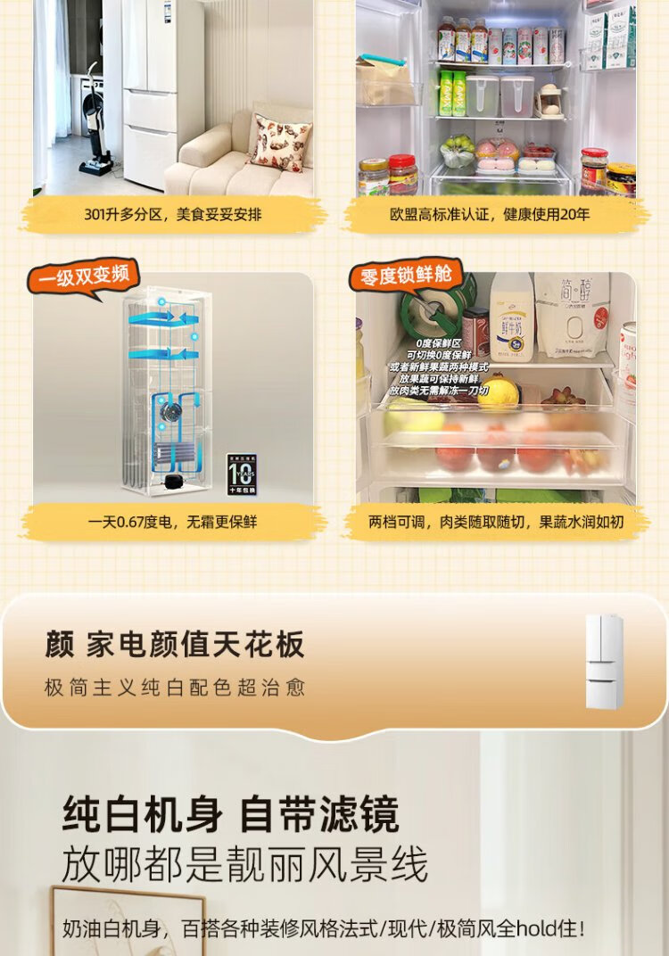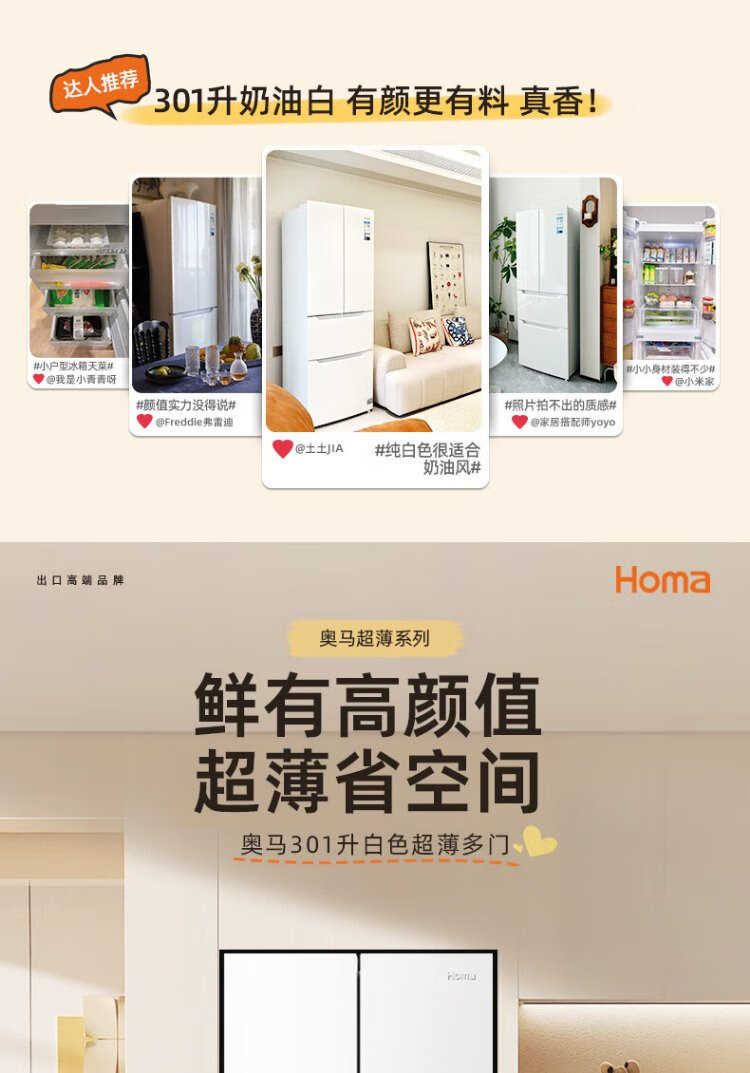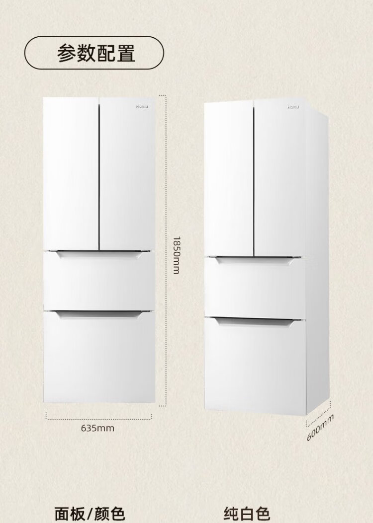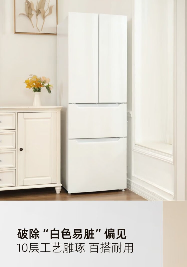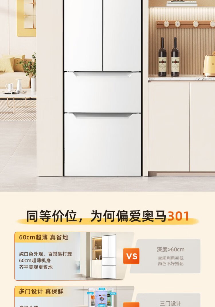 Homa 60cm ultra-thin 301 liter inverter energy-saving first-class energy efficiency air-cooled frost-free double-door three-door French multi-door small household white refrigerator national subsidy 301WF/B