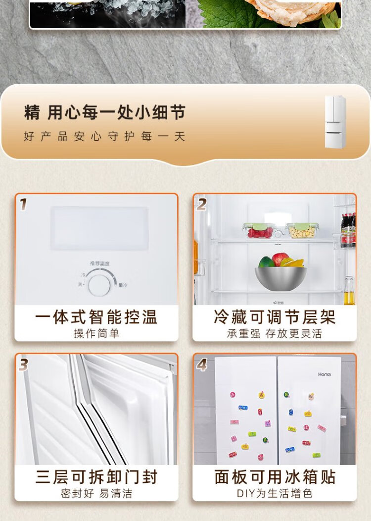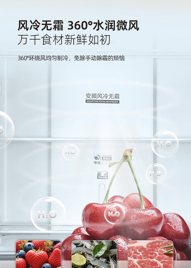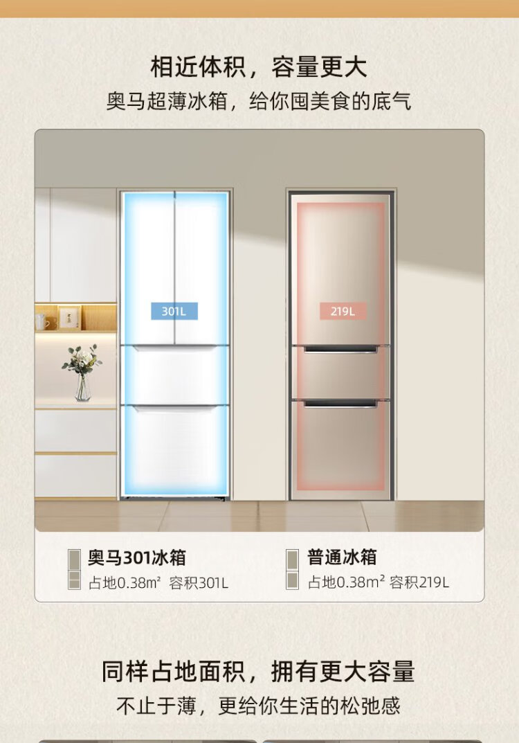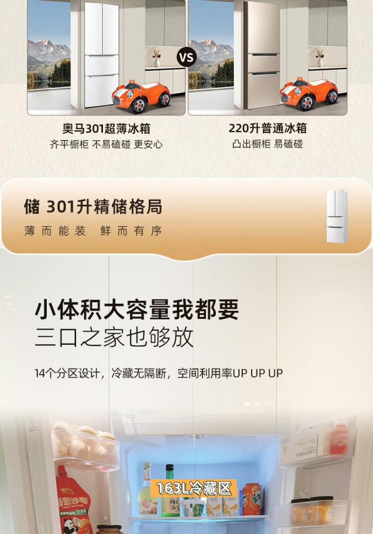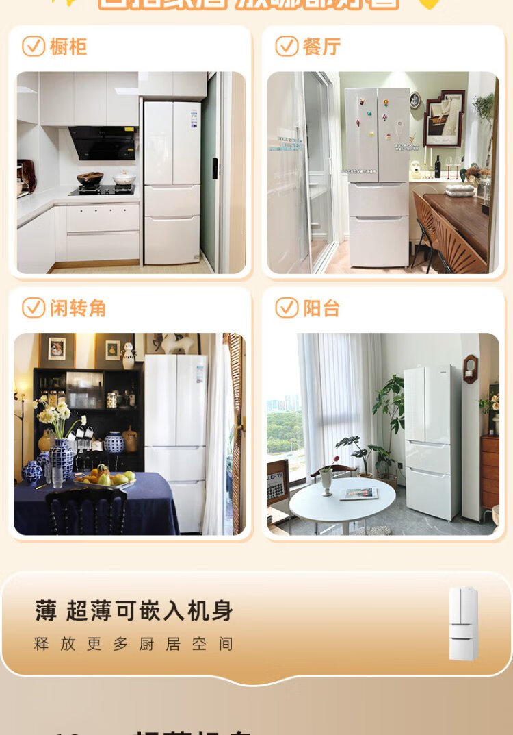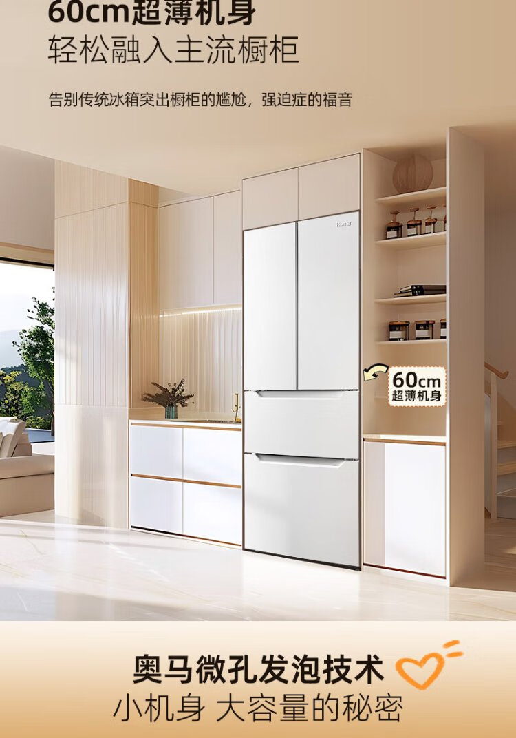 Homa 60cm ultra-thin 301 liter inverter energy-saving first-class energy efficiency air-cooled frost-free double-door three-door French multi-door small household white refrigerator national subsidy 301WF/B