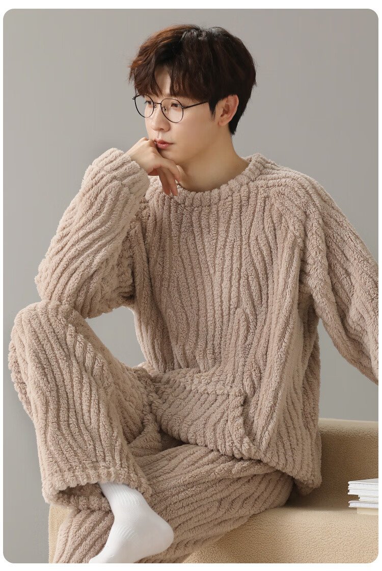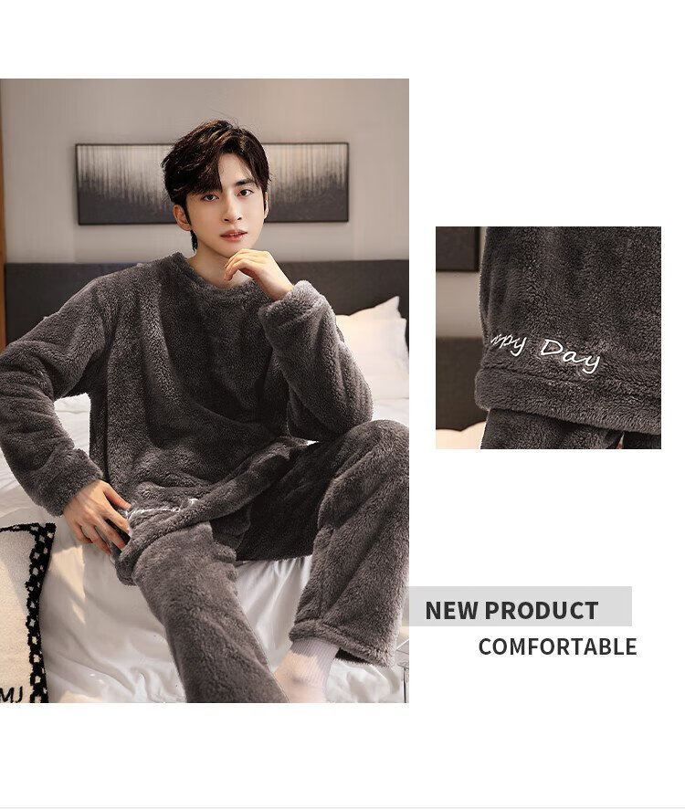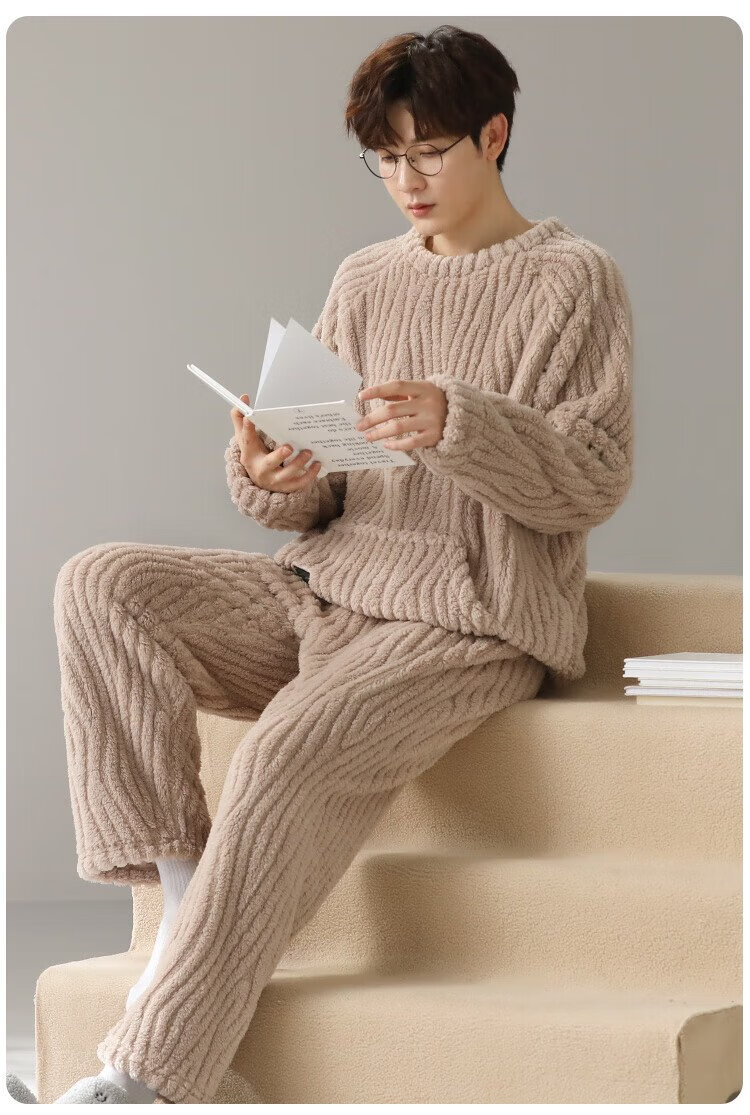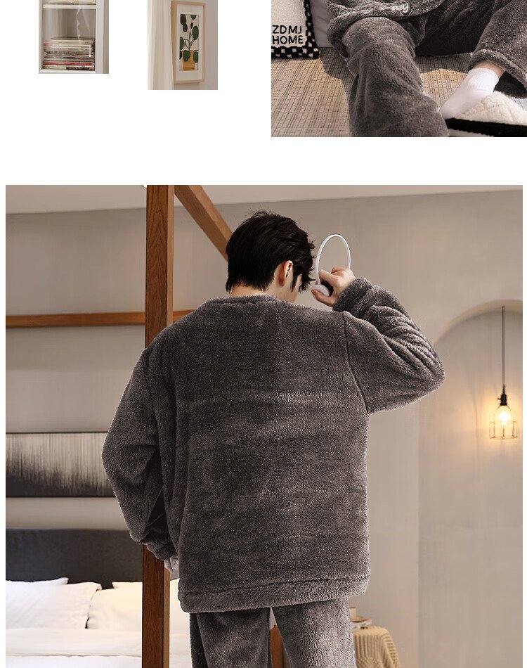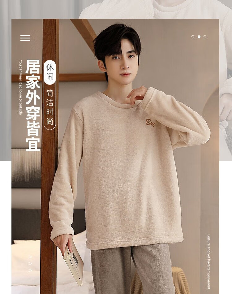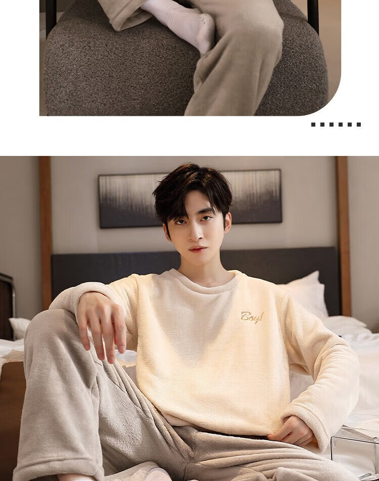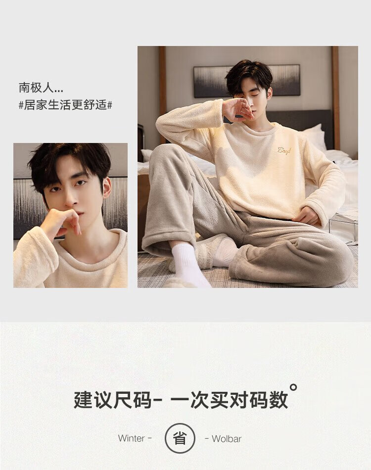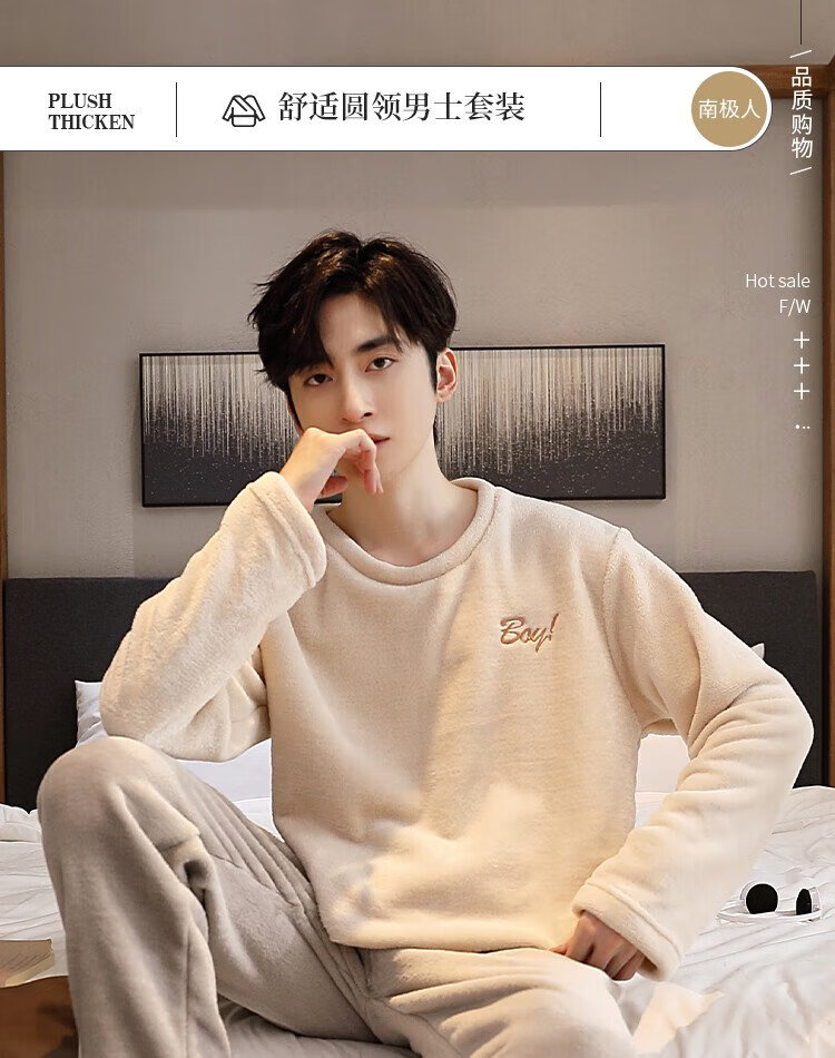 Nanjiren Men's Pajamas Men's Autumn and Winter Plus Velvet Flannel Pullover Can Be Weared Outside Home Clothes Set Embroidered Rice XL