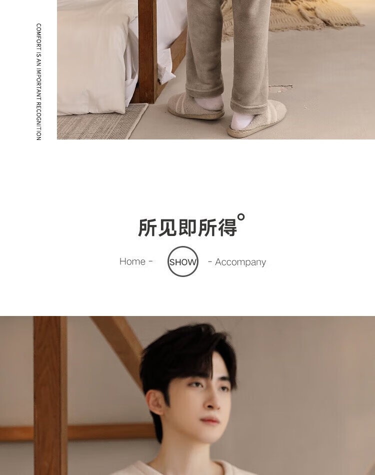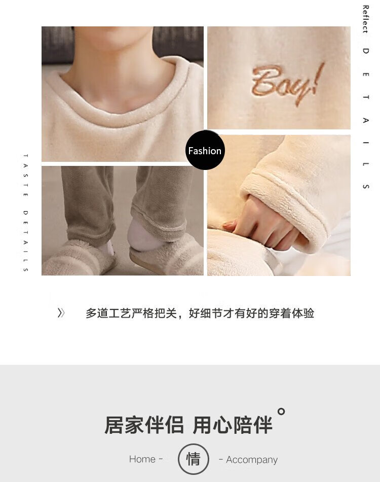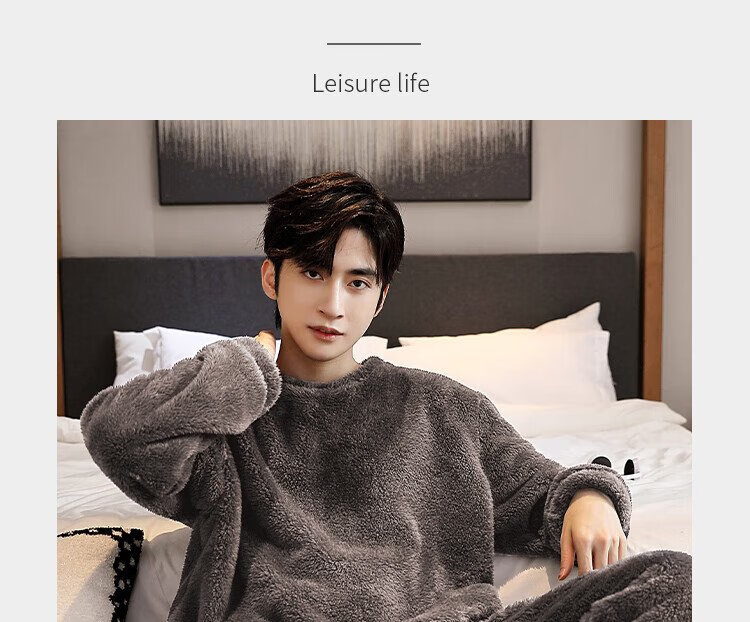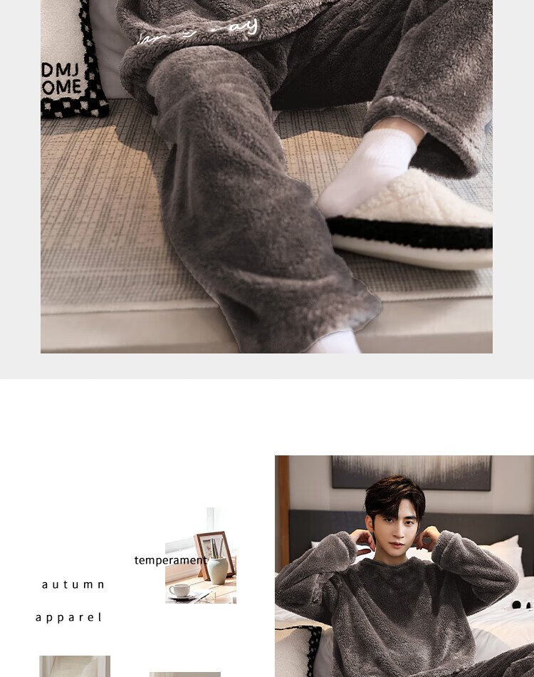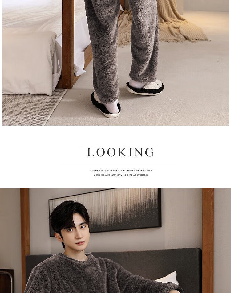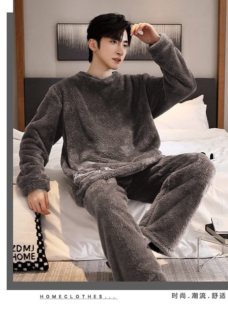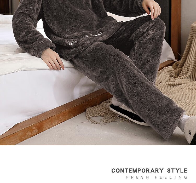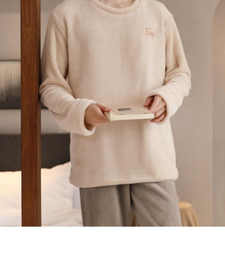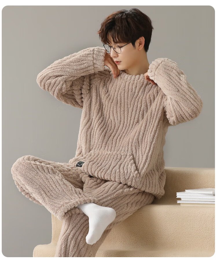 Nanjiren Men's Pajamas Men's Autumn and Winter Plus Velvet Flannel Pullover Can Be Weared Outside Home Clothes Set Embroidered Rice XL
