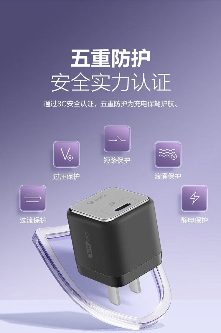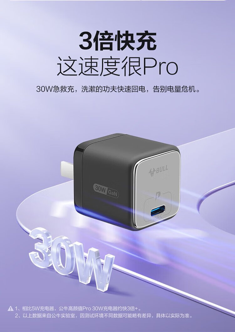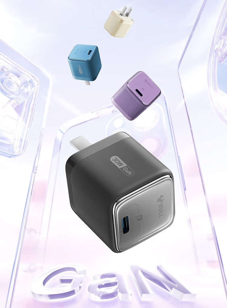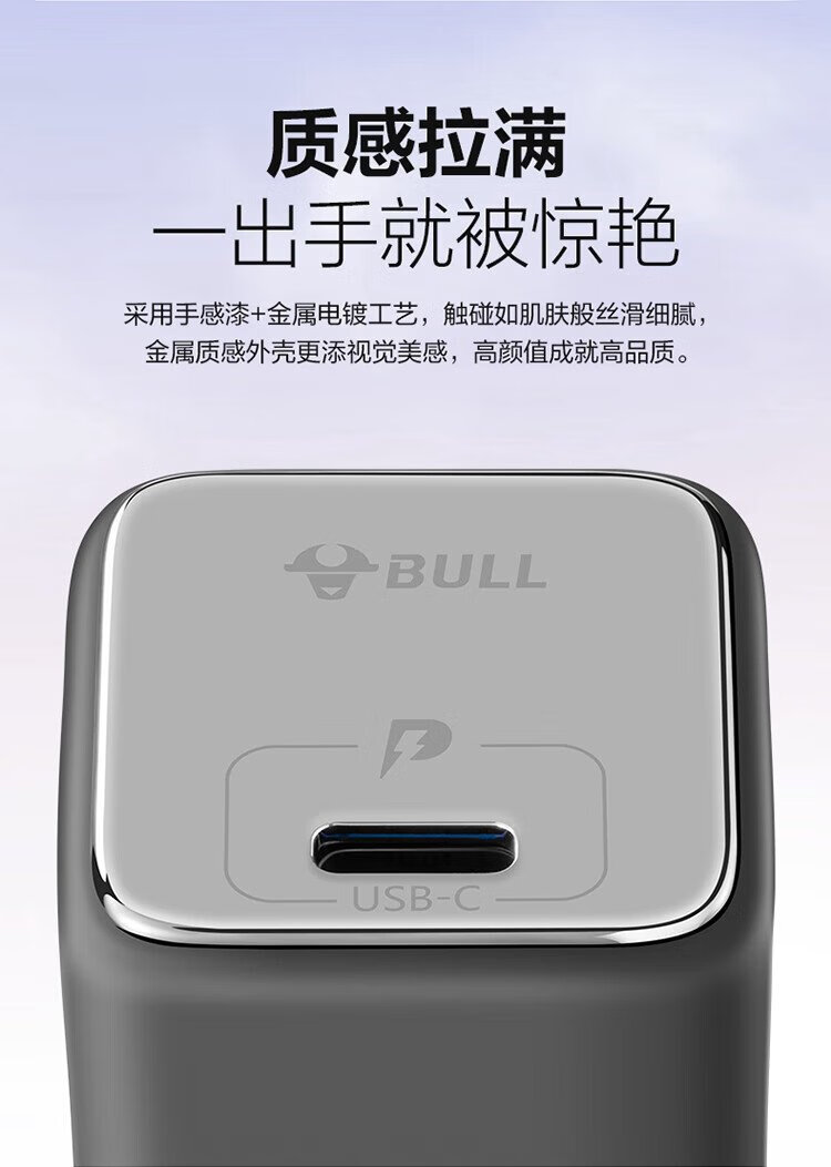 BULL gallium nitride 30W charger is compatible with 20W Apple 16PD fast charge, automatically powers off when fully charged, suitable for iPhone15-14/Huawei/Xiaomi and other mobile phones, pebble gray