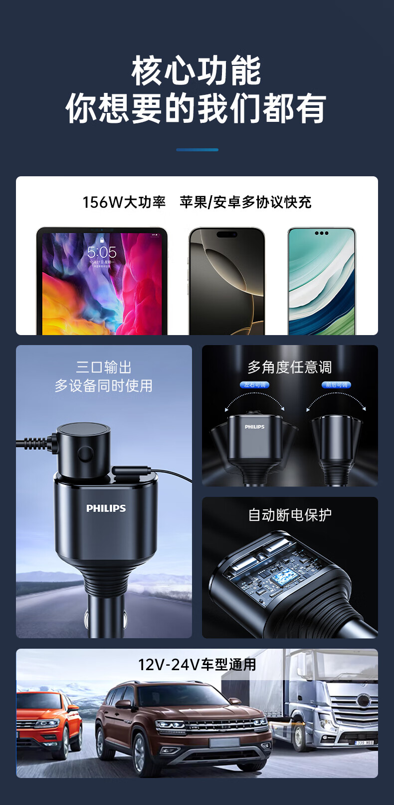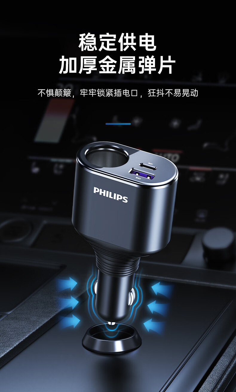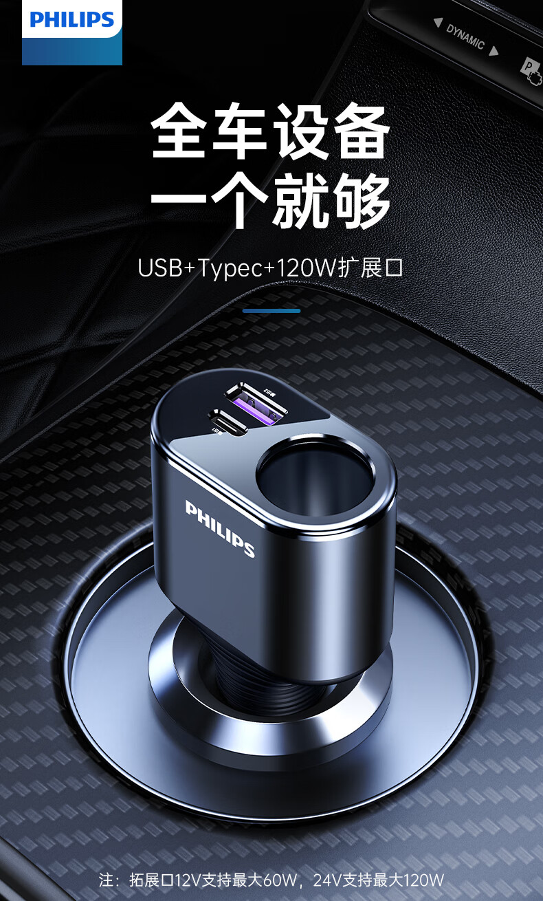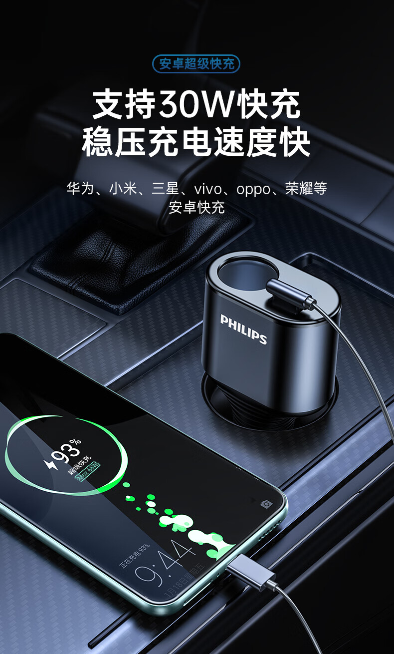 Philips car charger cigarette lighter car charger super fast charge one to two/three multi-function fast charging head suitable for Huawei Apple 17/16 car extended cigarette lighter port converter 4103