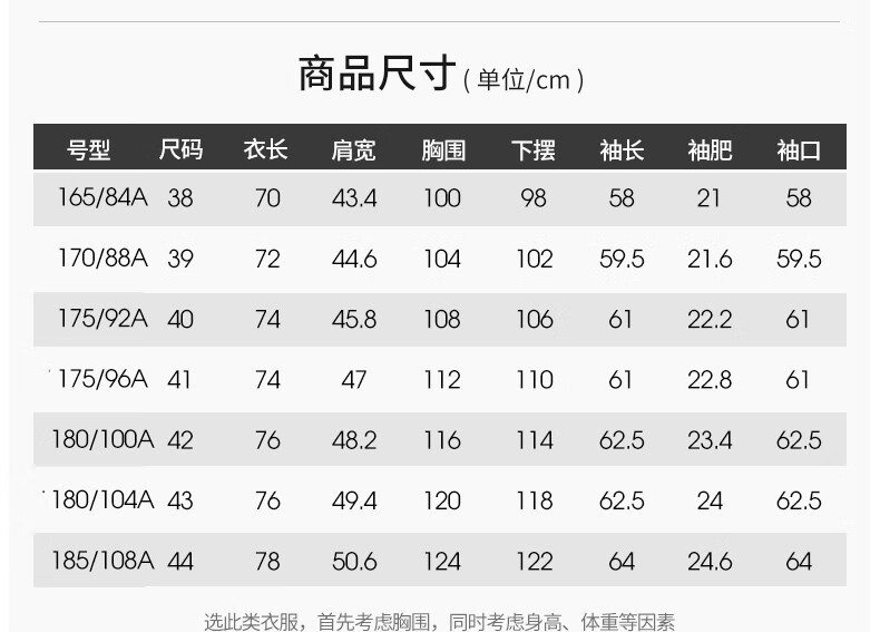 China (cm) 165 / 88-90 170 / 96-98 175 / 108-110 180 / 118-122 185 / 126-130