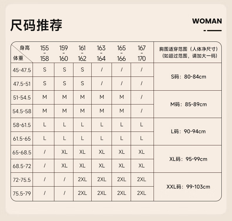 China (cm) 160-165/84-86 165-170 / 88-90 167-172 / 92-96 168-173 / 98-102 170-176 / 106-110