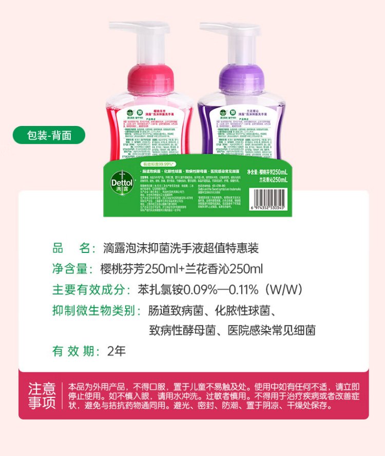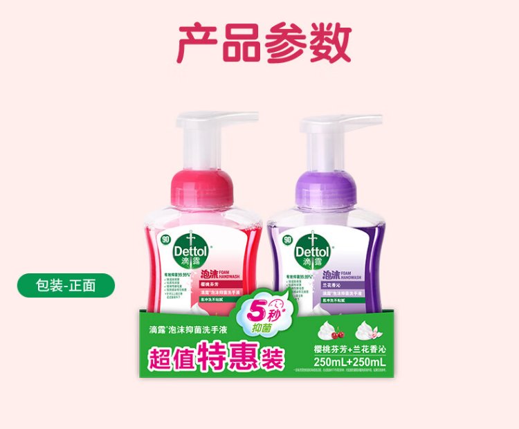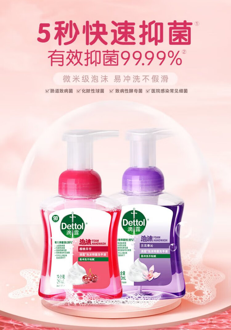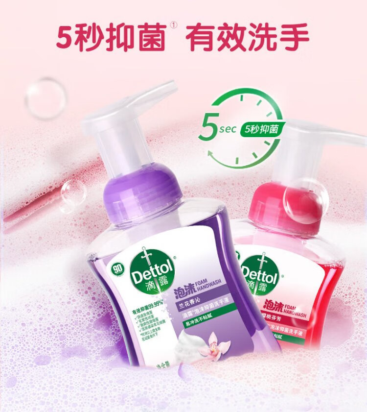 Dettol hand sanitizer foam cherry 250ml + orchid 250ml 5 seconds antibacterial children's bubble hand sanitizer antibacterial