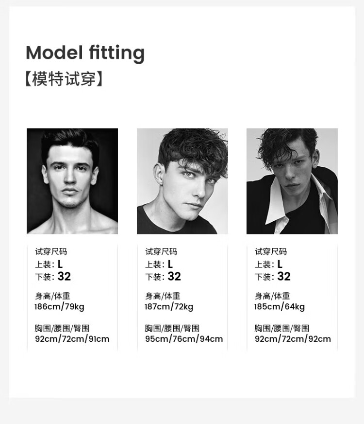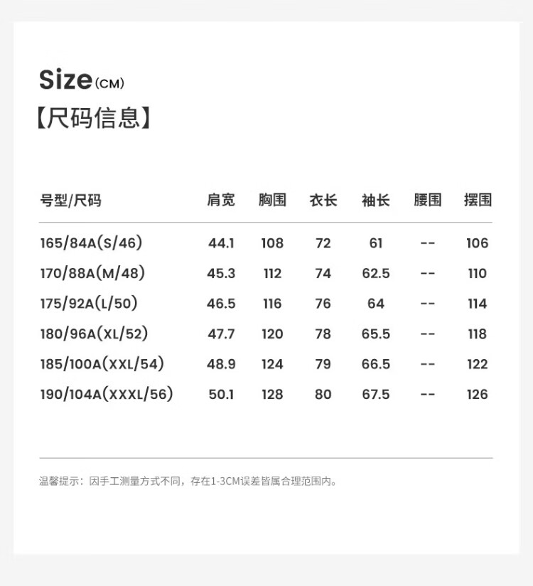 China (cm) 165 / 88-90 170 / 96-98 175 / 108-110 180 / 118-122 185 / 126-130