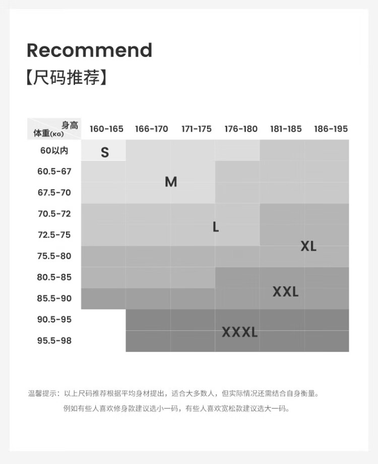 China (cm) 160-165/84-86 165-170 / 88-90 167-172 / 92-96 168-173 / 98-102 170-176 / 106-110