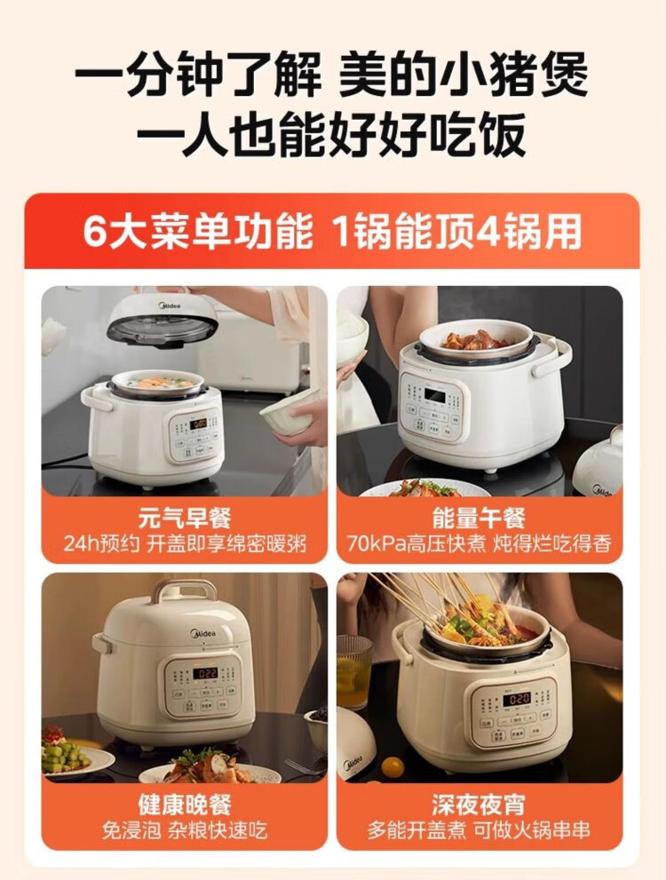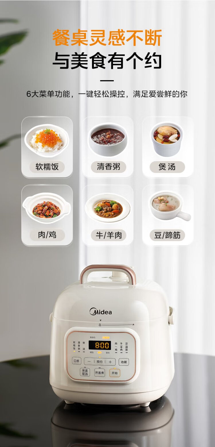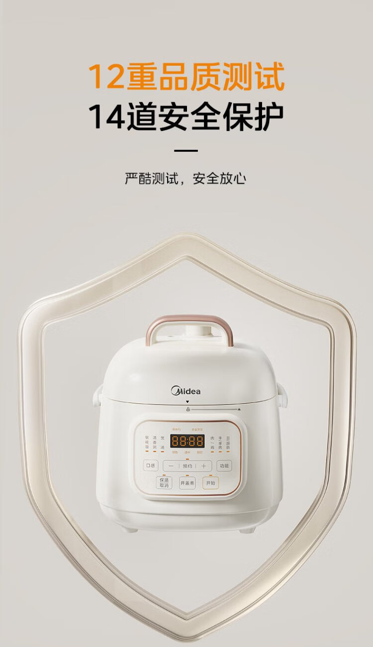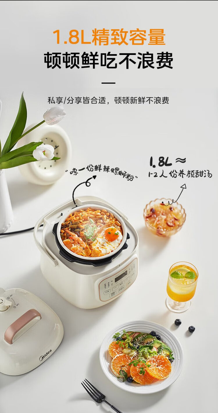 Midea government subsidy small white pot for one person mini electric pressure cooker 1.8L open lid to collect juice household smart reservation baby porridge MY-E220 rice cooker pressure cooker for 1-3 people