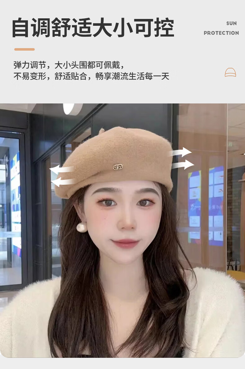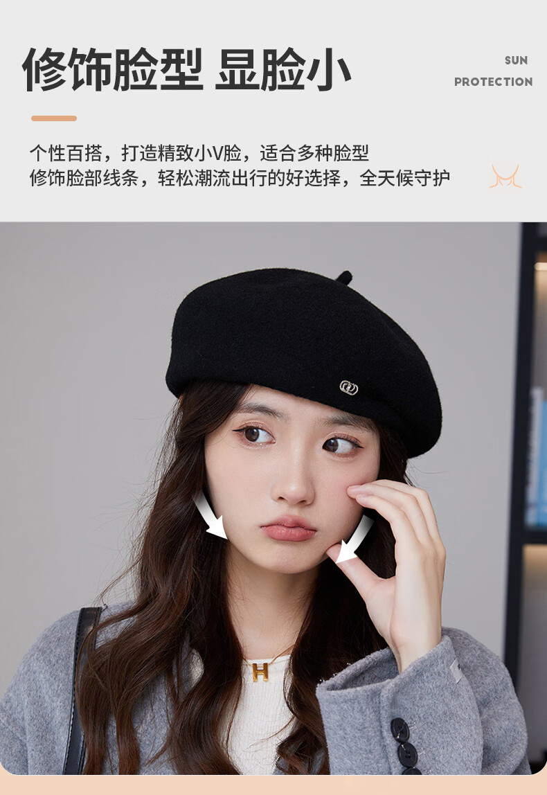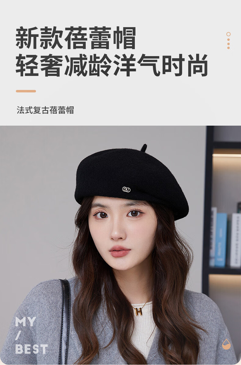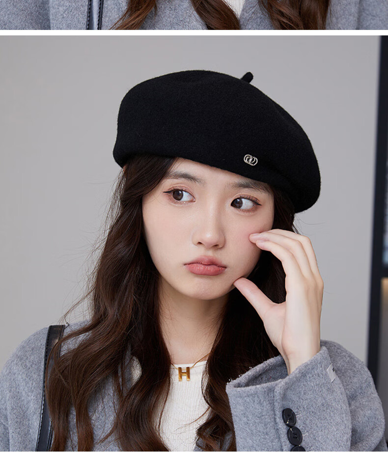 GLO-STORY French beret women's autumn and winter literary retro painter's hat with versatile temperament and face-showing little pumpkin hat black