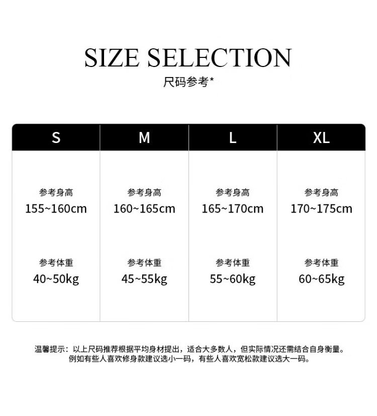 China (cm) 160-165/84-86 165-170 / 88-90 167-172 / 92-96 168-173 / 98-102 170-176 / 106-110
