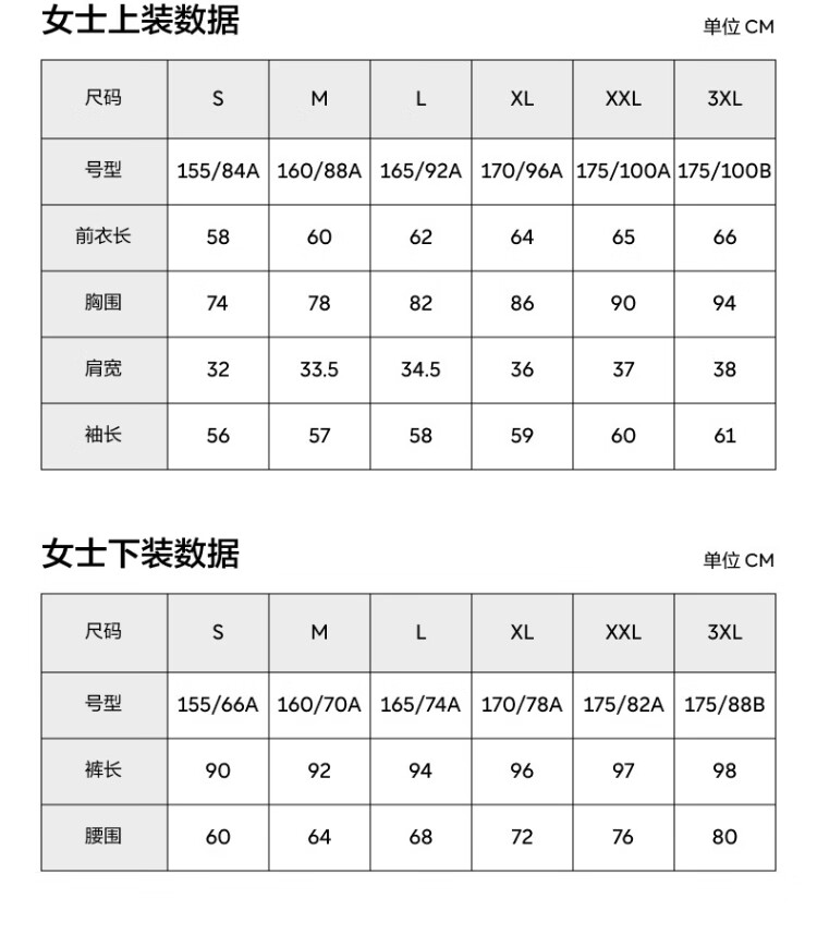 China (cm) 160-165/84-86 165-170 / 88-90 167-172 / 92-96 168-173 / 98-102 170-176 / 106-110