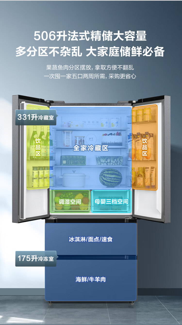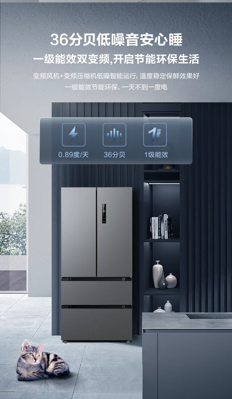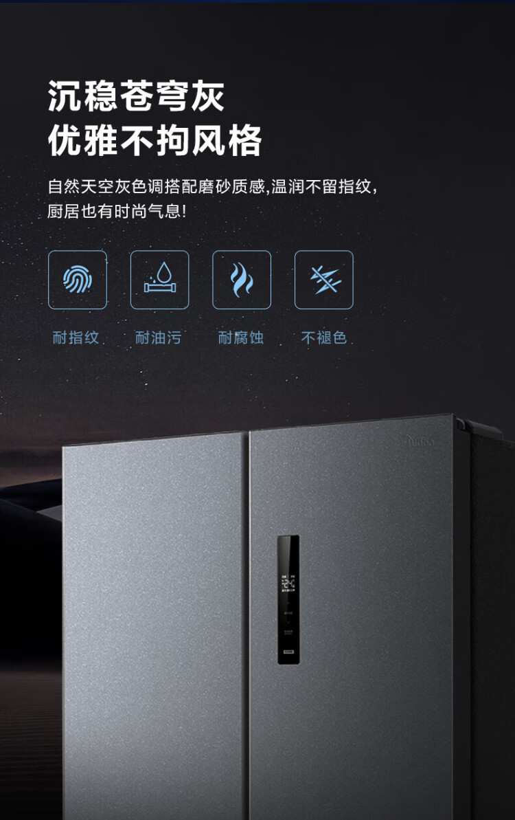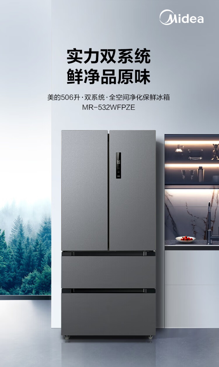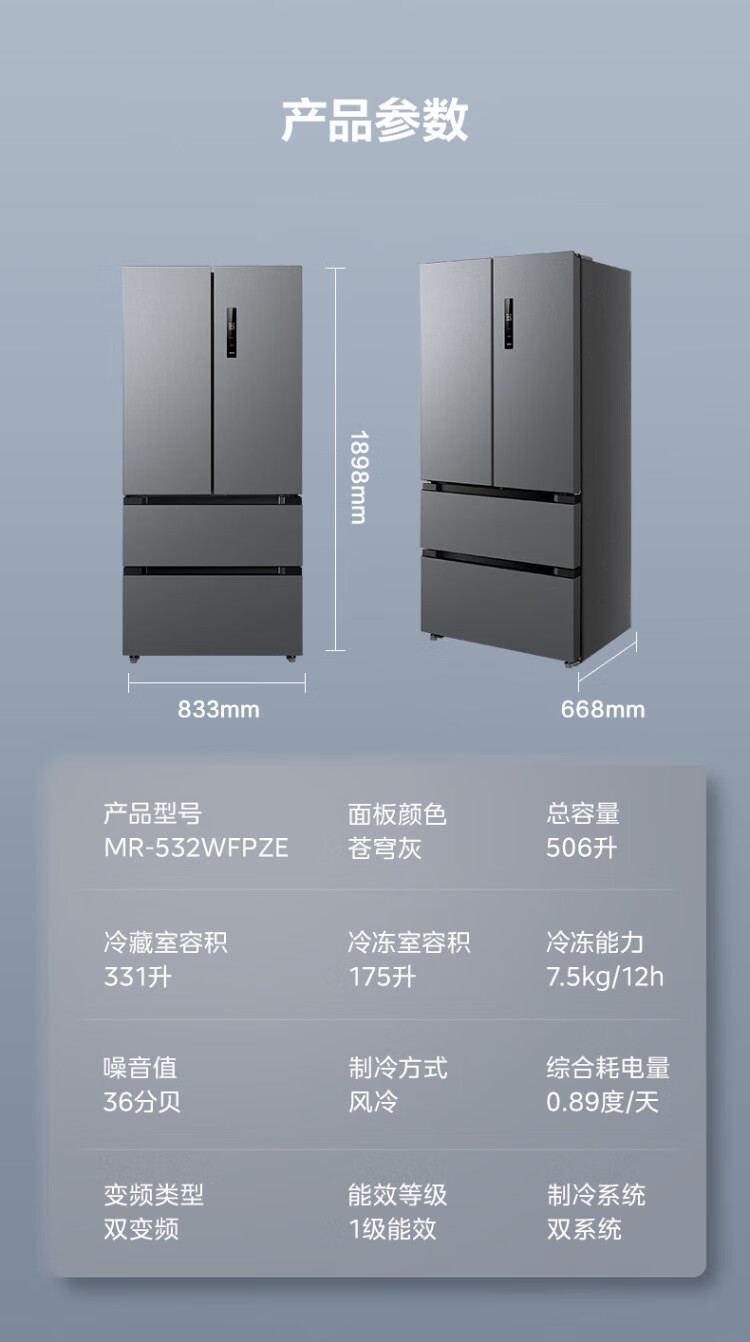 Midea 532 French multi-door four-door refrigerator with variable frequency, first-level energy efficiency, household frost-free dual system, dual cycle, large capacity, national subsidy 20% MR-532WFPZE Sky Gray