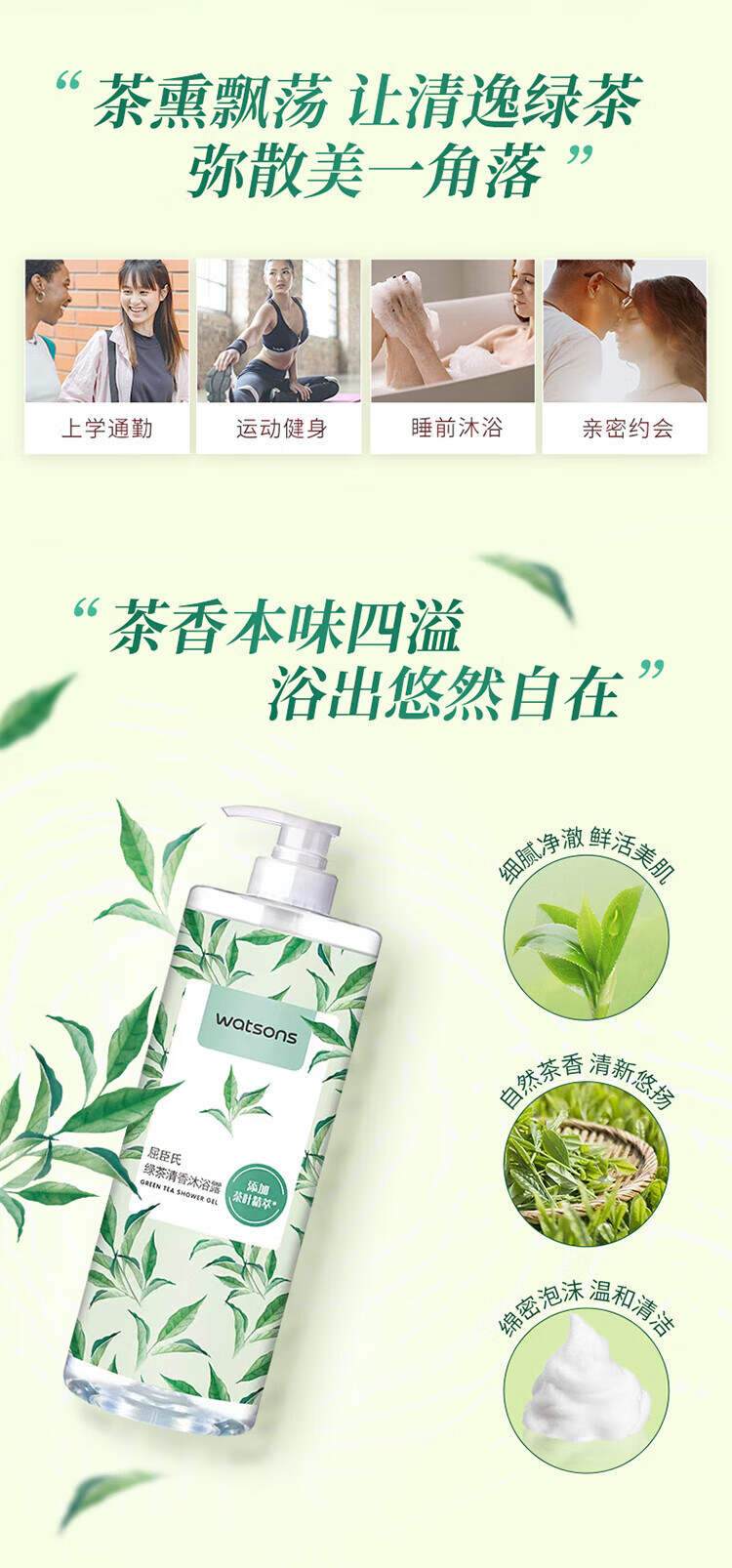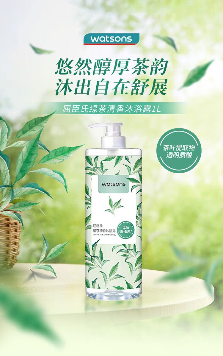 Watsons Green Tea Fragrance Shower Gel 1L (Tea Extract, Hyaluronic Acid, Softening and Cleansing)