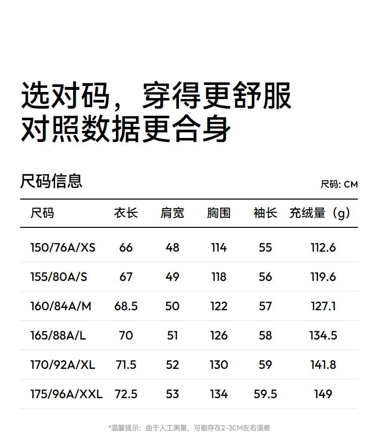 China (cm) 160-165/84-86 165-170 / 88-90 167-172 / 92-96 168-173 / 98-102 170-176 / 106-110