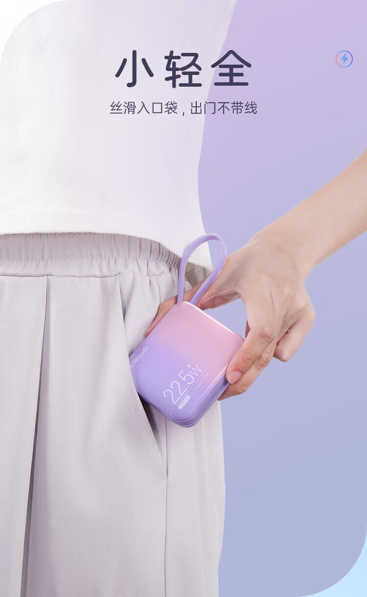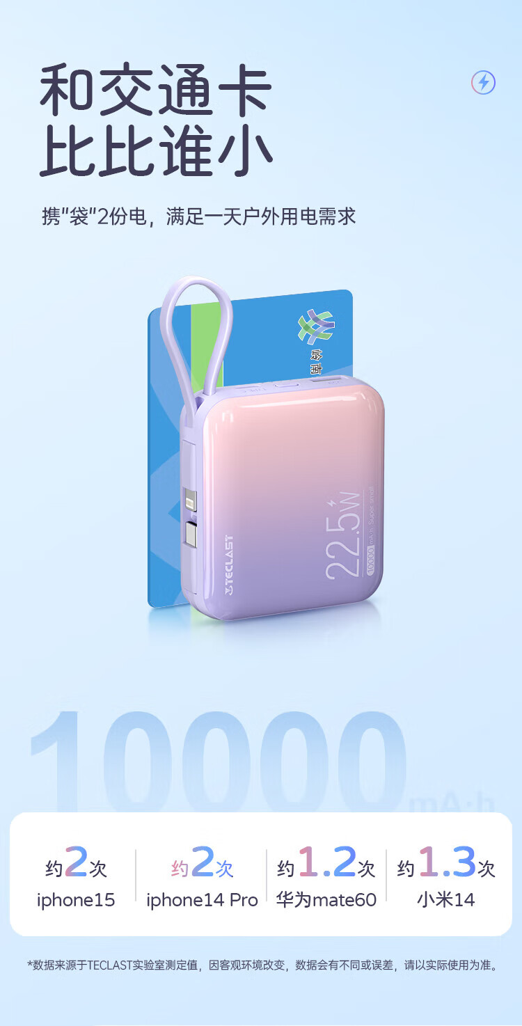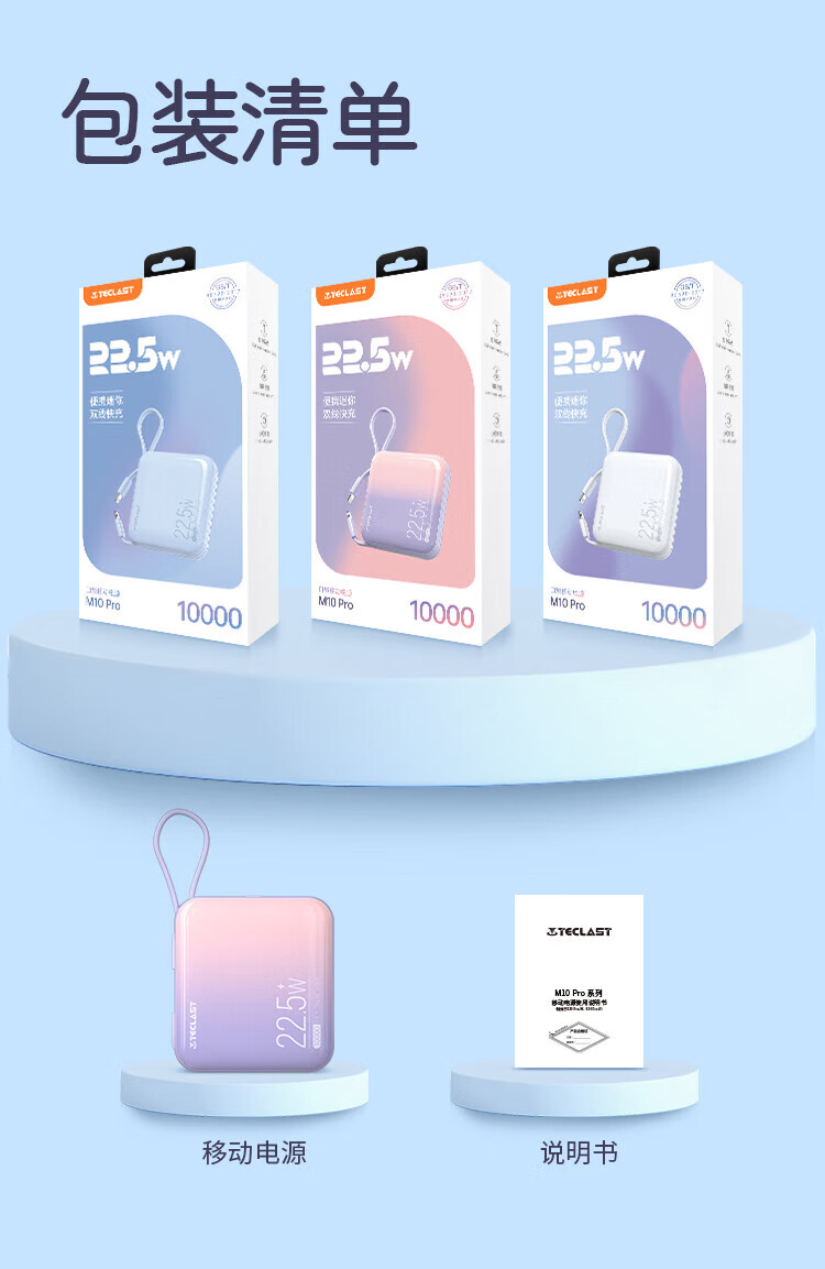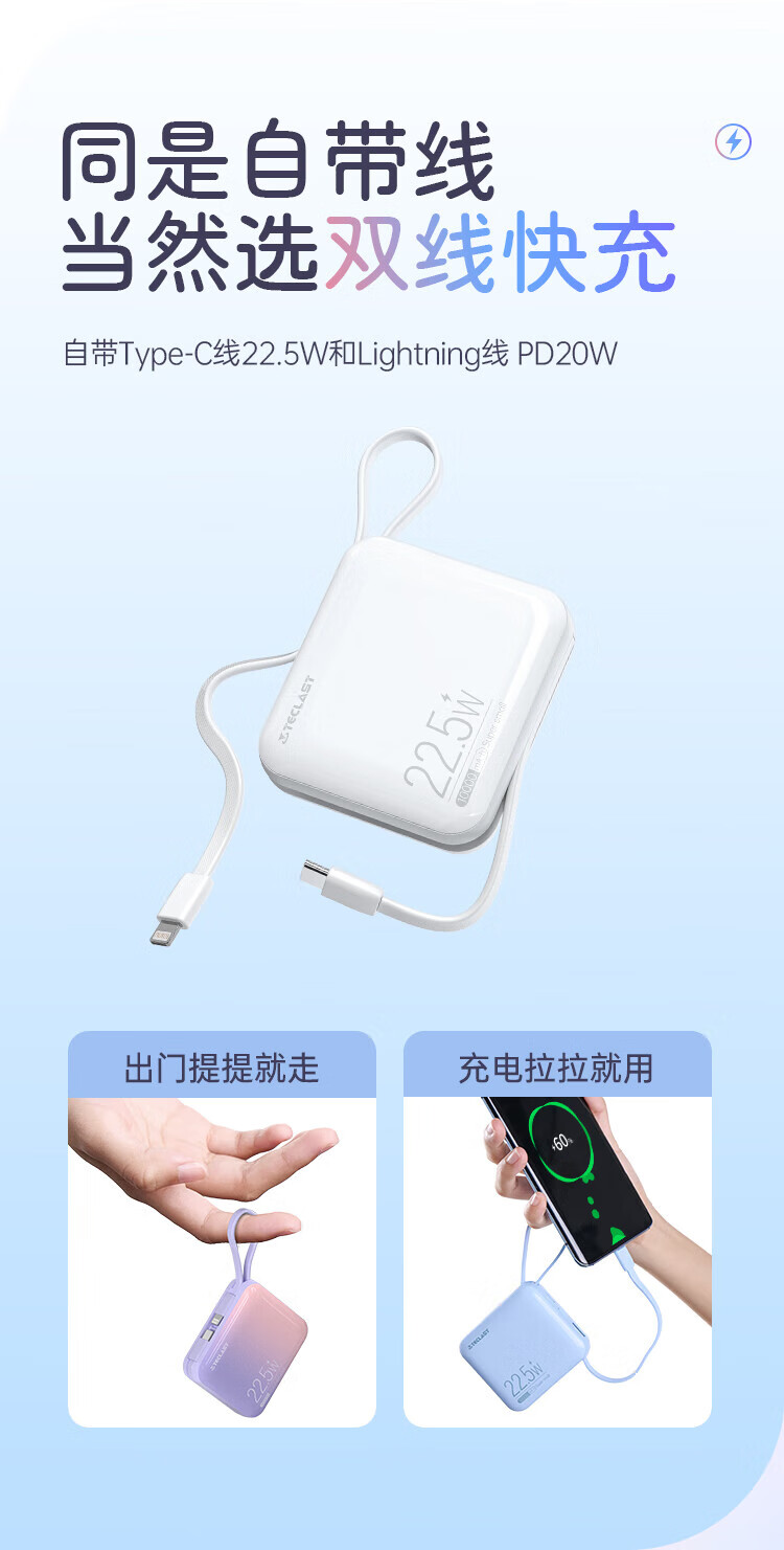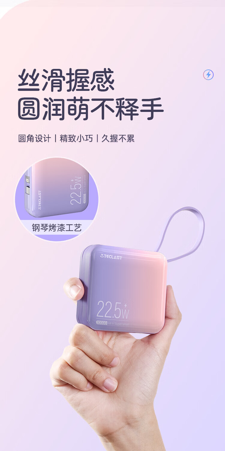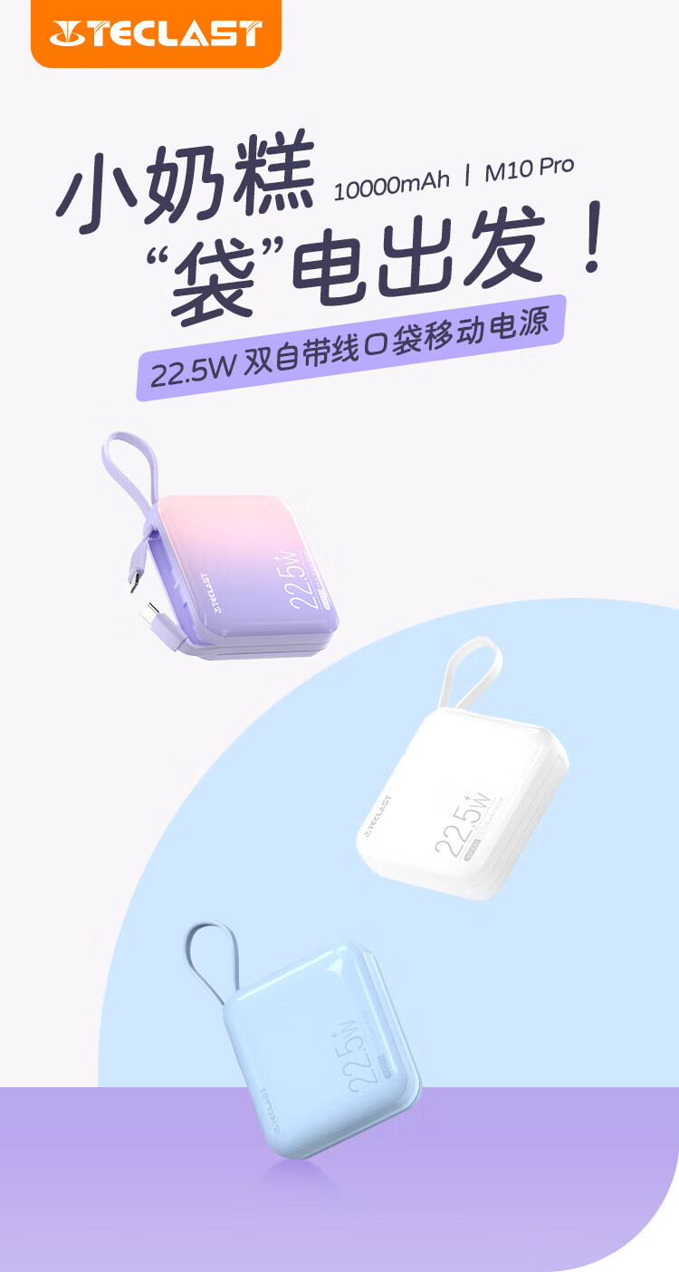 Taipower (TECLAST) power bank, 3C certified, 10000 mAh, comes with cable, mini, compact, 22.5W fast charge, can be used on airplanes, portable power bank, suitable for Xiaomi, Apple, Purple