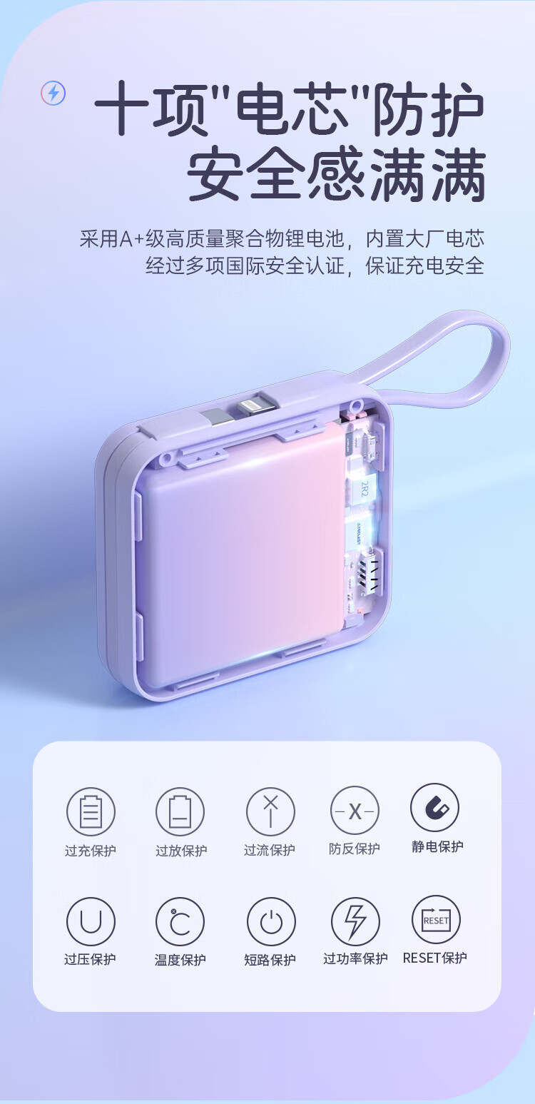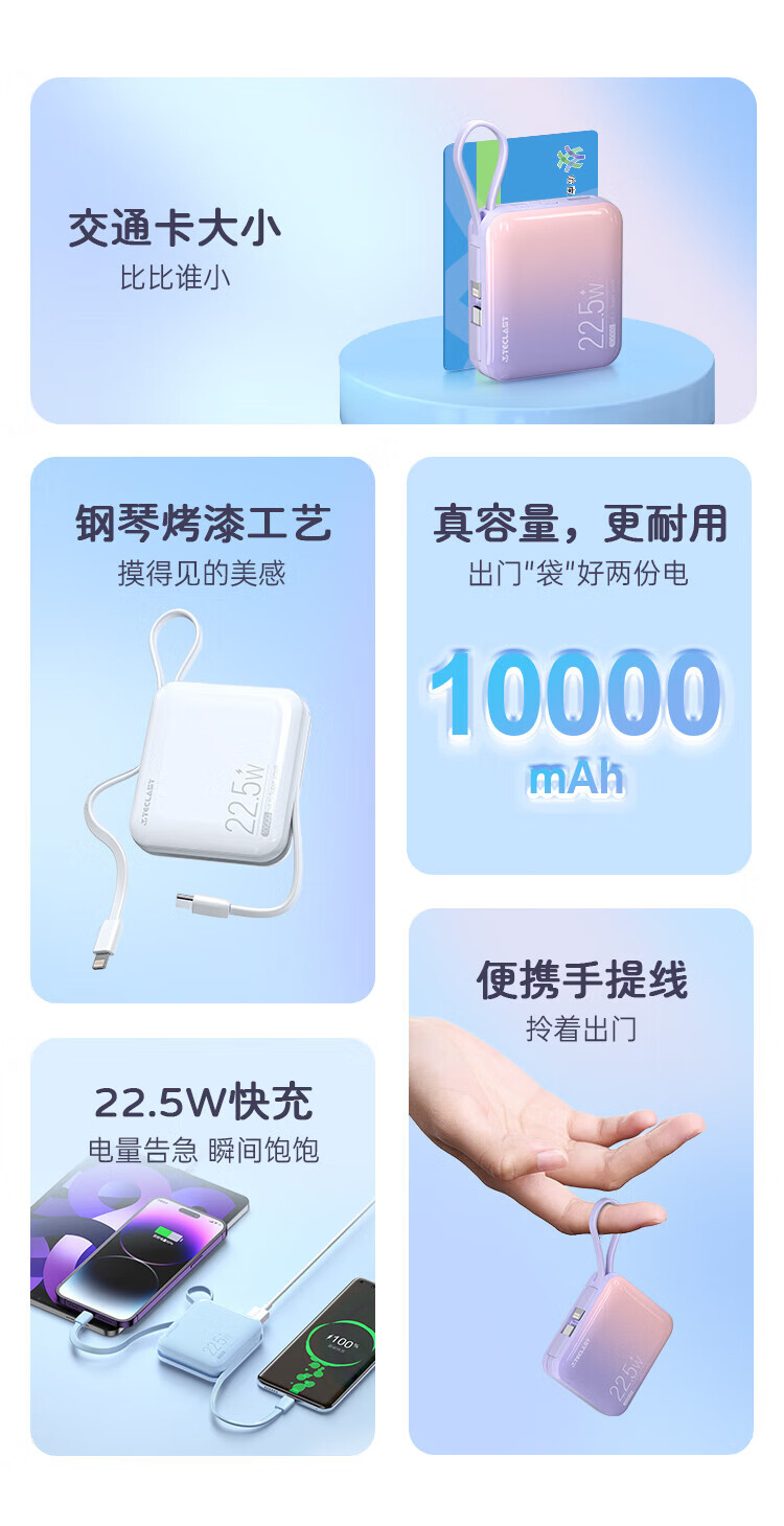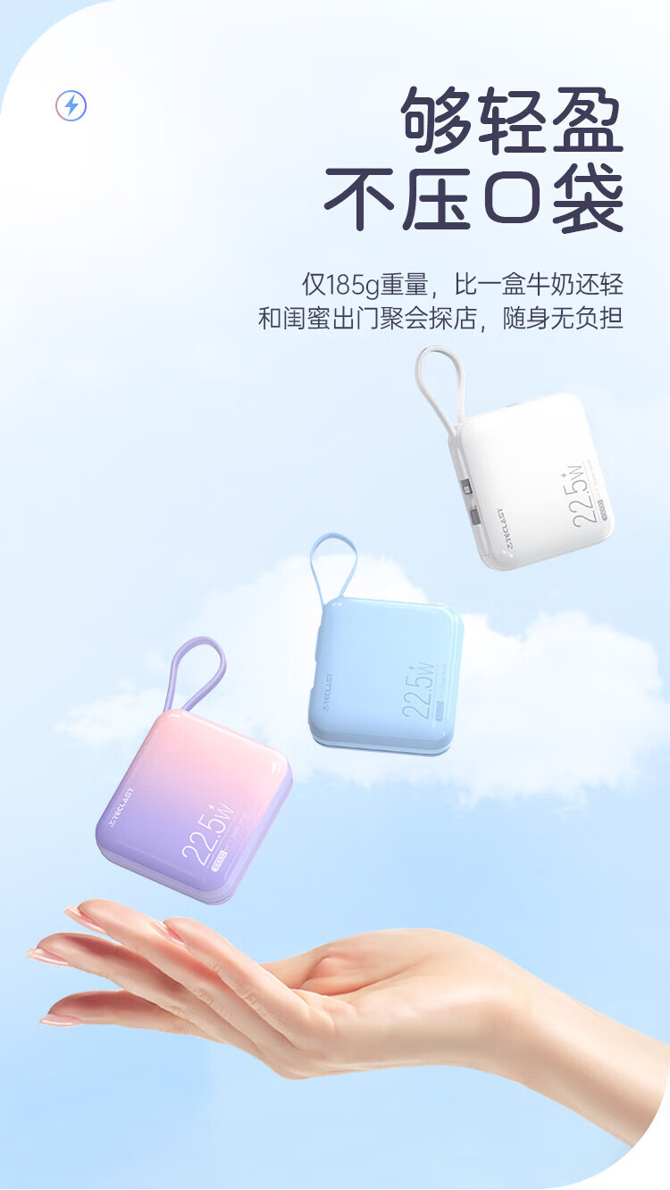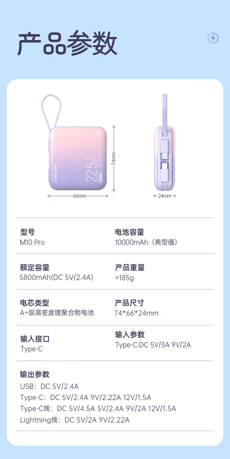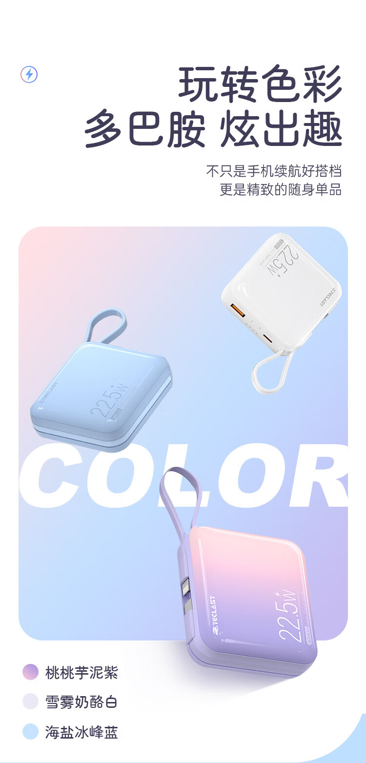Taipower (TECLAST) power bank, 3C certified, 10000 mAh, comes with cable, mini, compact, 22.5W fast charge, can be used on airplanes, portable power bank, suitable for Xiaomi, Apple, Purple