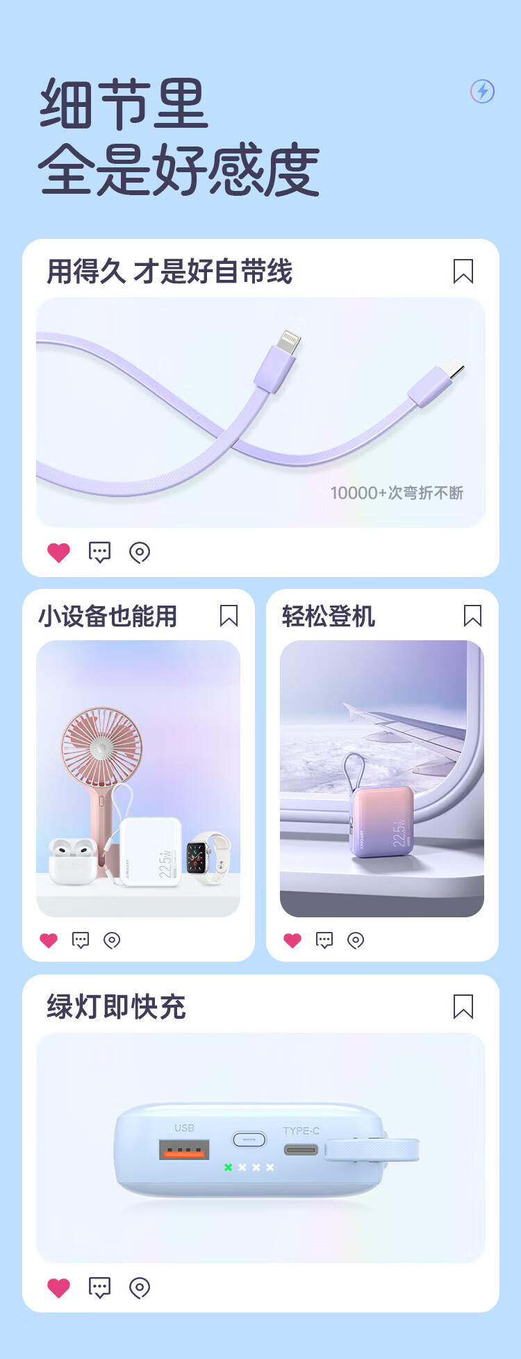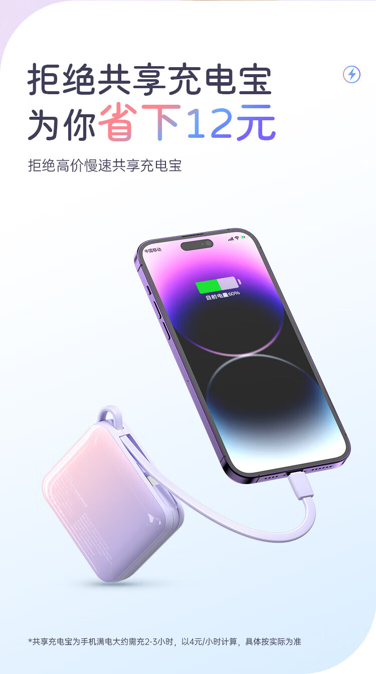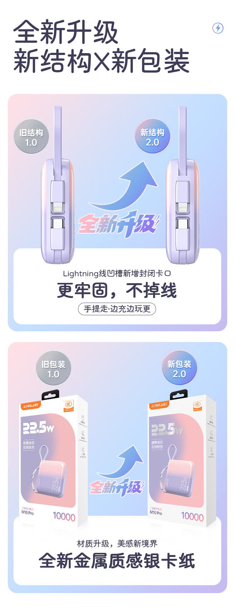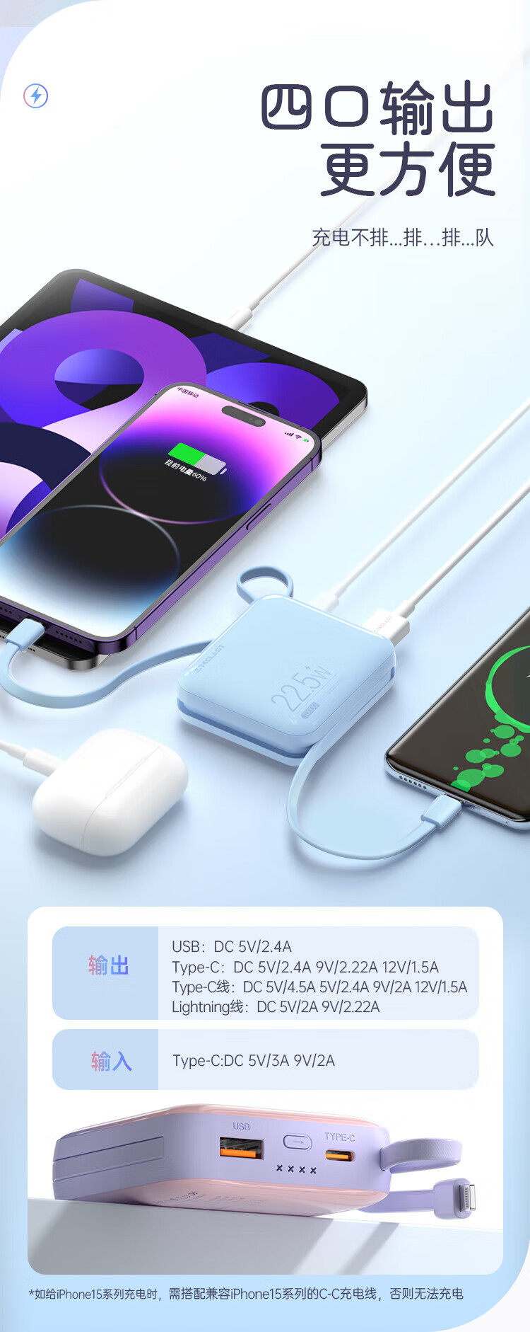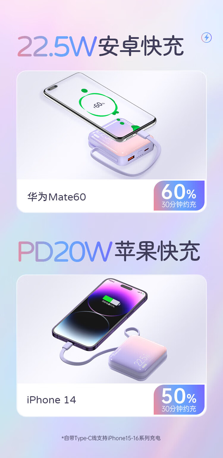 Taipower (TECLAST) power bank, 3C certified, 10000 mAh, comes with cable, mini, compact, 22.5W fast charge, can be used on airplanes, portable power bank, suitable for Xiaomi, Apple, Purple