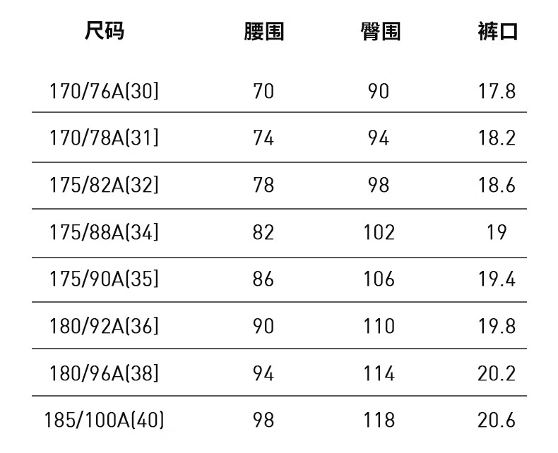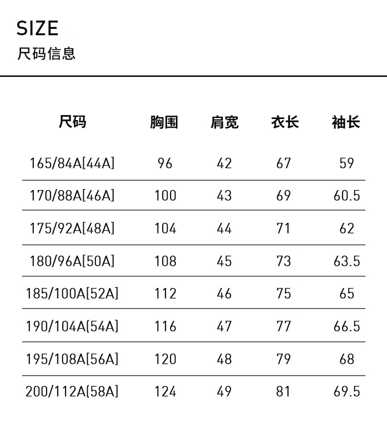 China (cm) 165 / 88-90 170 / 96-98 175 / 108-110 180 / 118-122 185 / 126-130