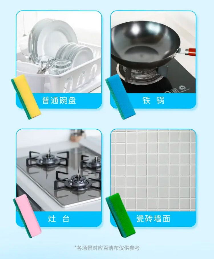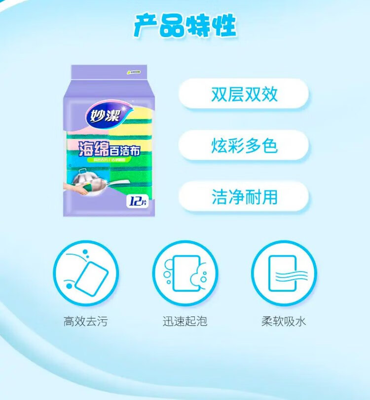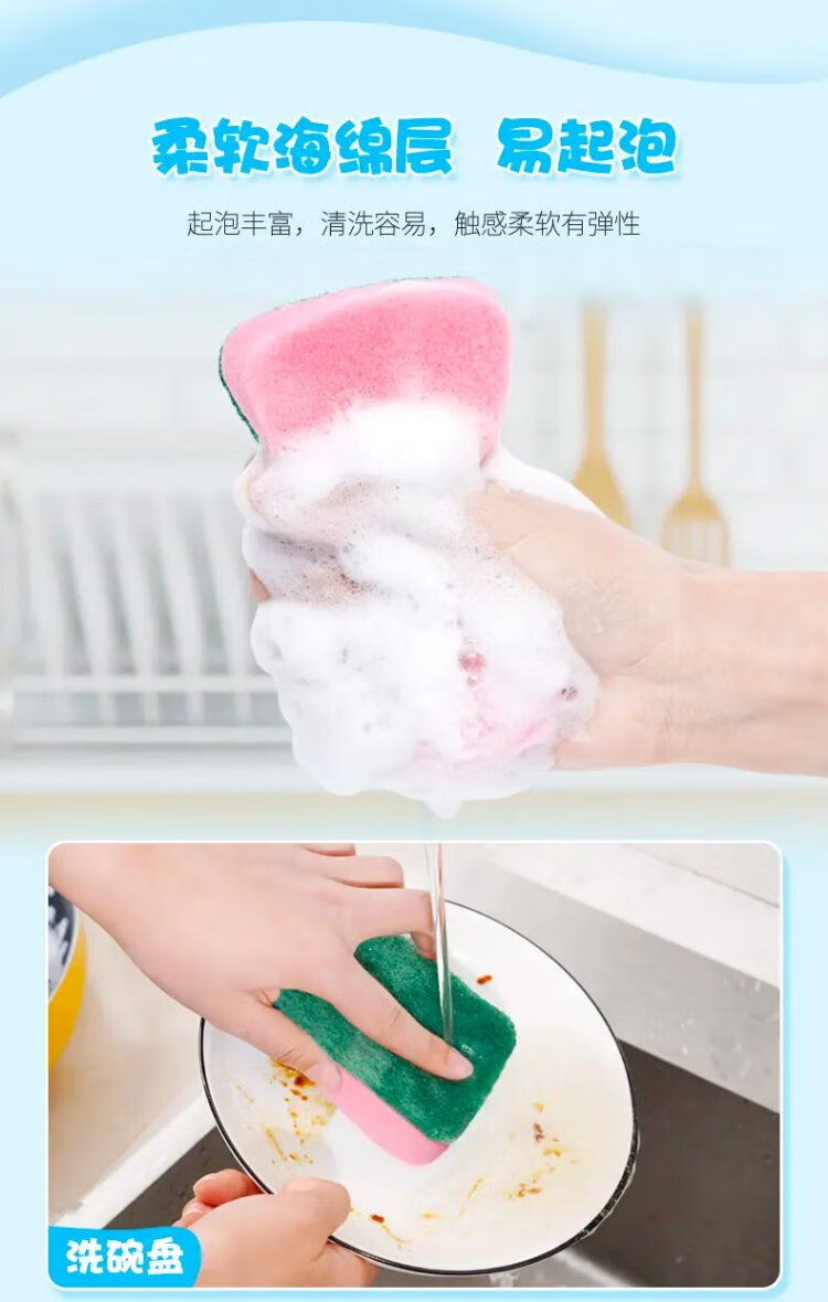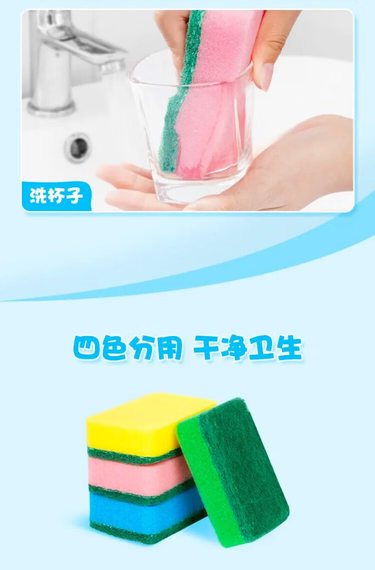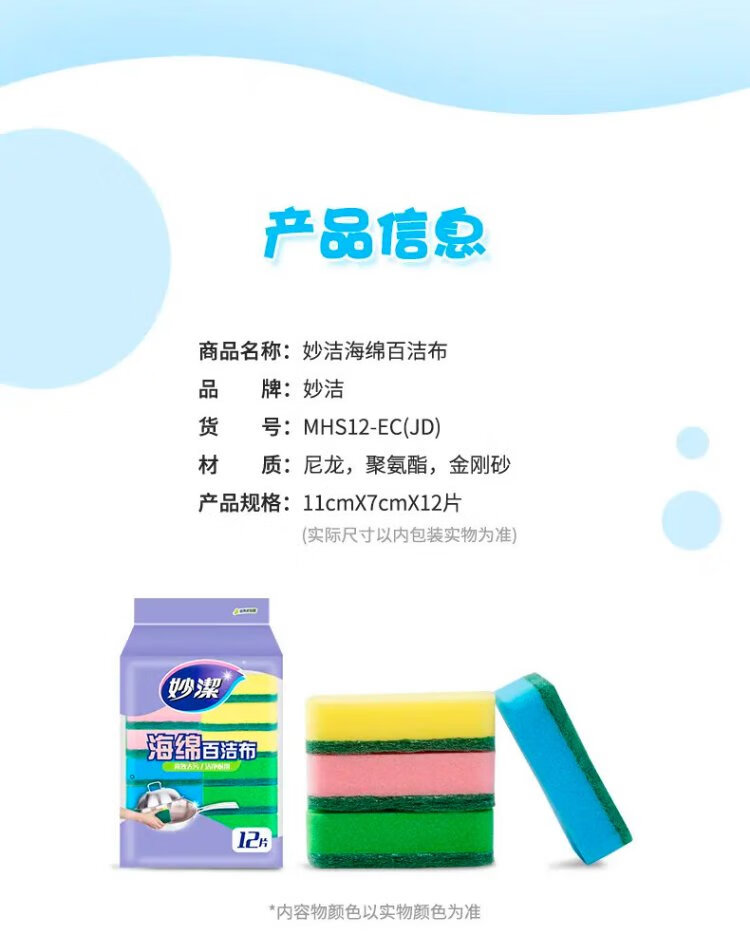 Miaojie sponge scouring pad 11*7cm 12 pieces, four colors for degreasing rags, kitchen dishwashing cotton