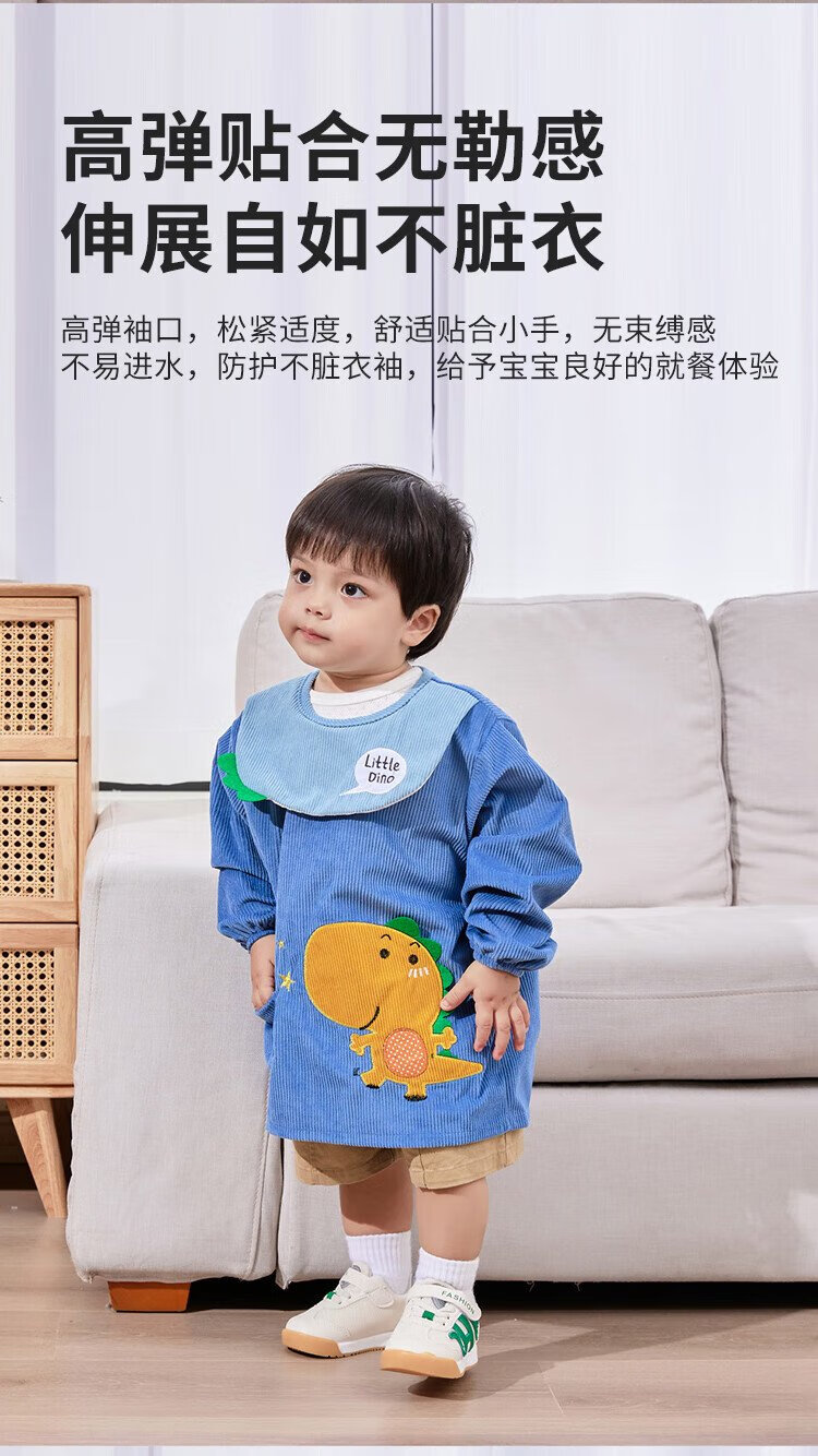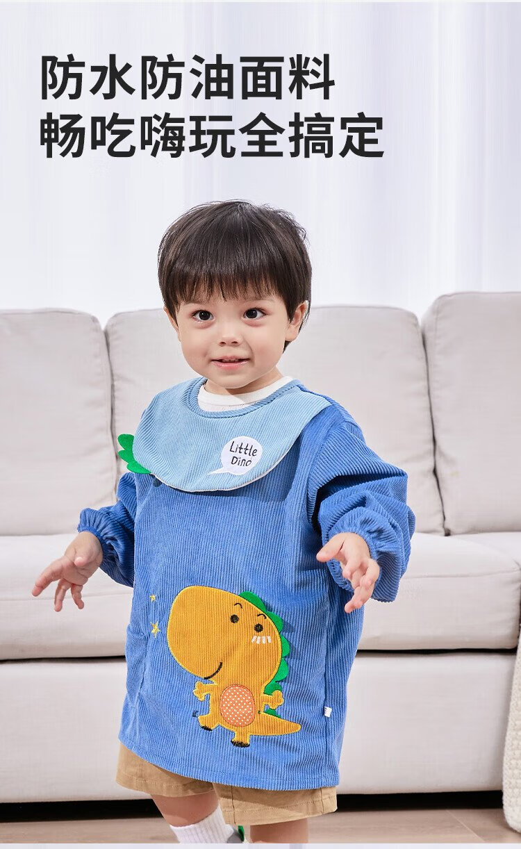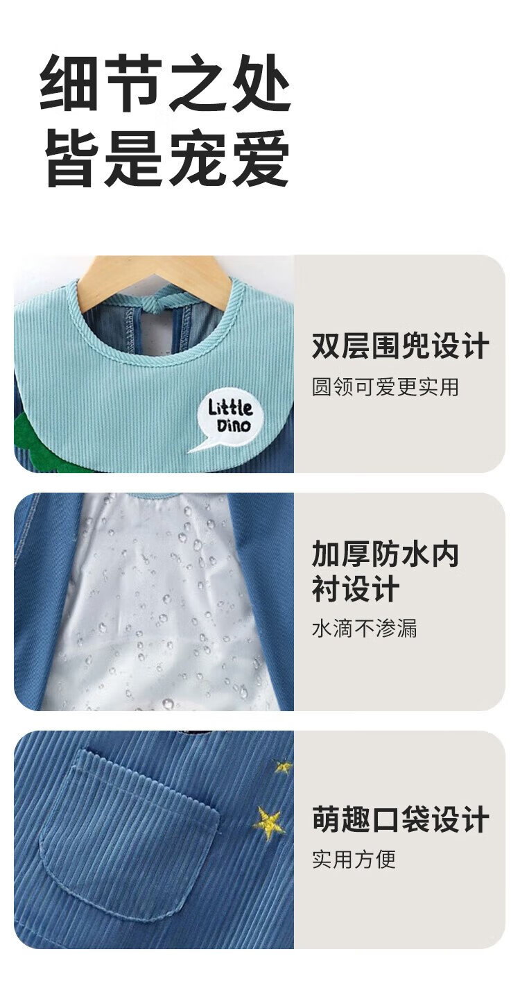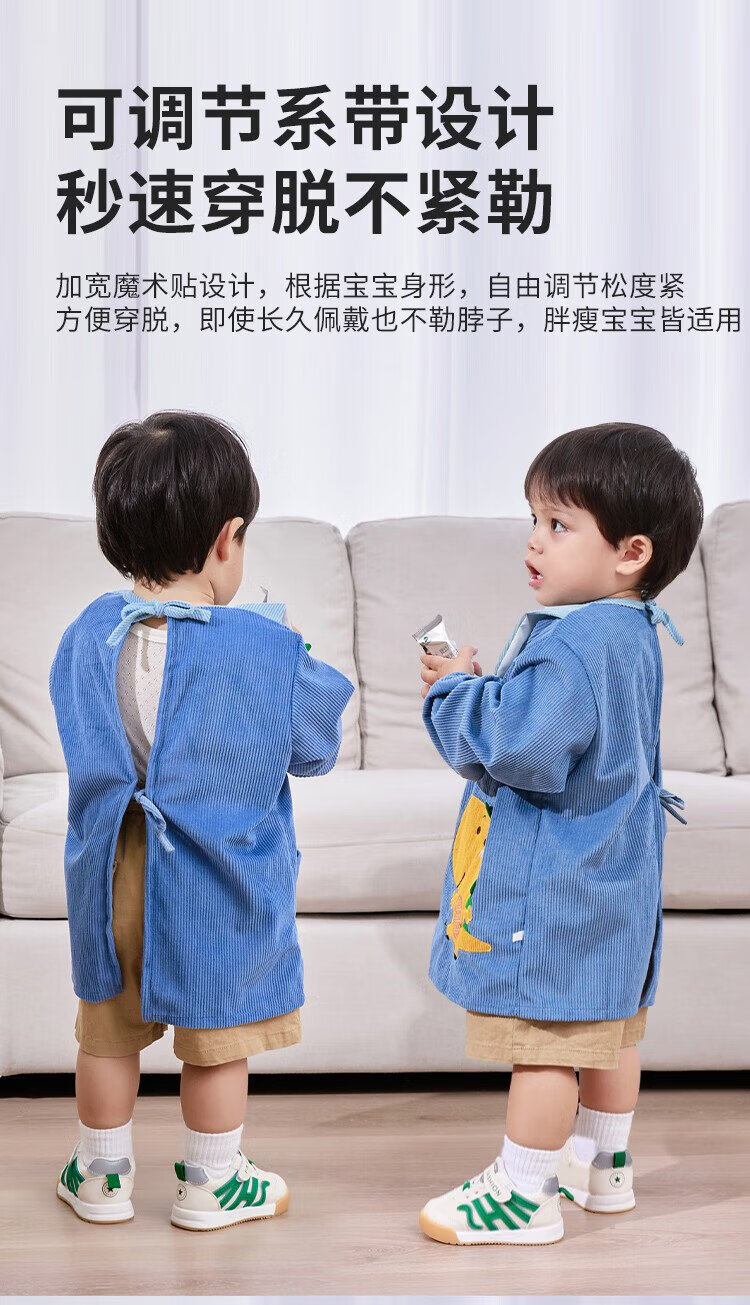 Bowie's bib children's apron corduroy smock eating bib reverse dressing rice pocket baby bib children's splash-proof clothing blue
