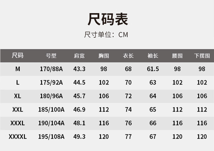 China (cm) 165 / 88-90 170 / 96-98 175 / 108-110 180 / 118-122 185 / 126-130