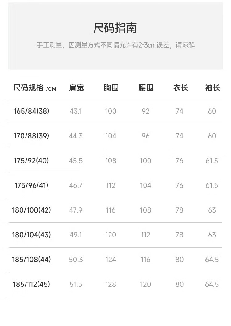 China (cm) 160-165/84-86 165-170 / 88-90 167-172 / 92-96 168-173 / 98-102 170-176 / 106-110