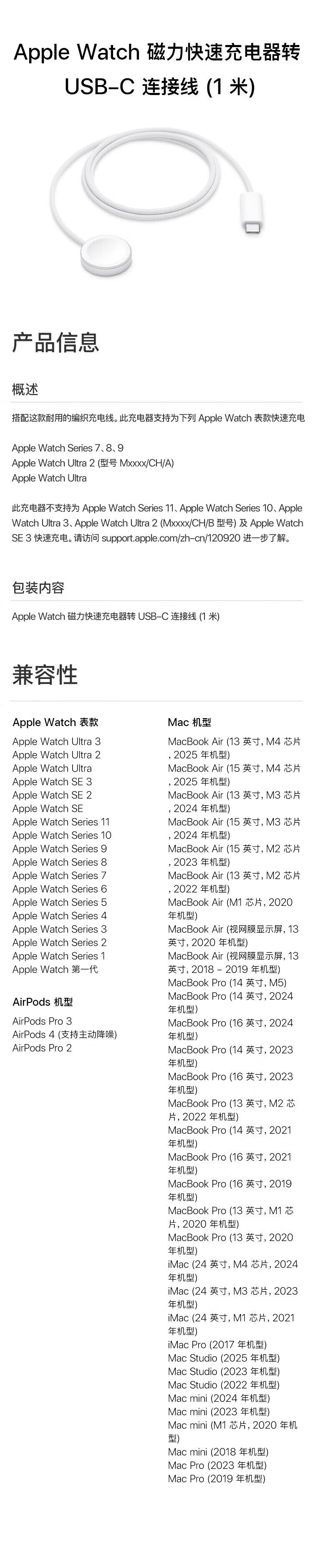 Apple/Apple watch magnetic charging cable USB-C 1 meter type-c Apple watch charging cable universal suitable for apple watch ultra3/se3/s11