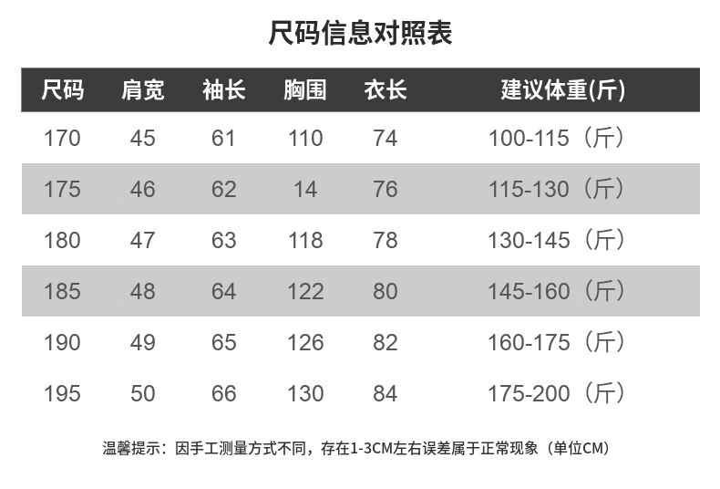 China (cm) 165 / 88-90 170 / 96-98 175 / 108-110 180 / 118-122 185 / 126-130