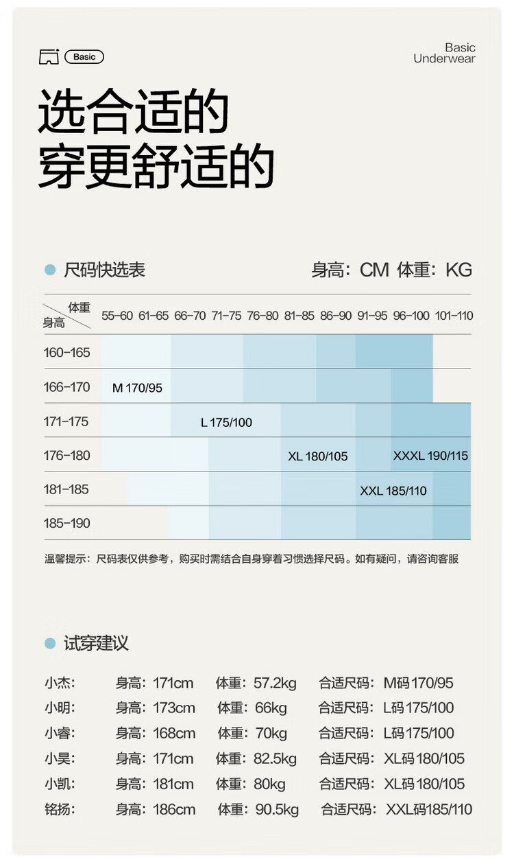 China (cm) 165 / 88-90 170 / 96-98 175 / 108-110 180 / 118-122 185 / 126-130